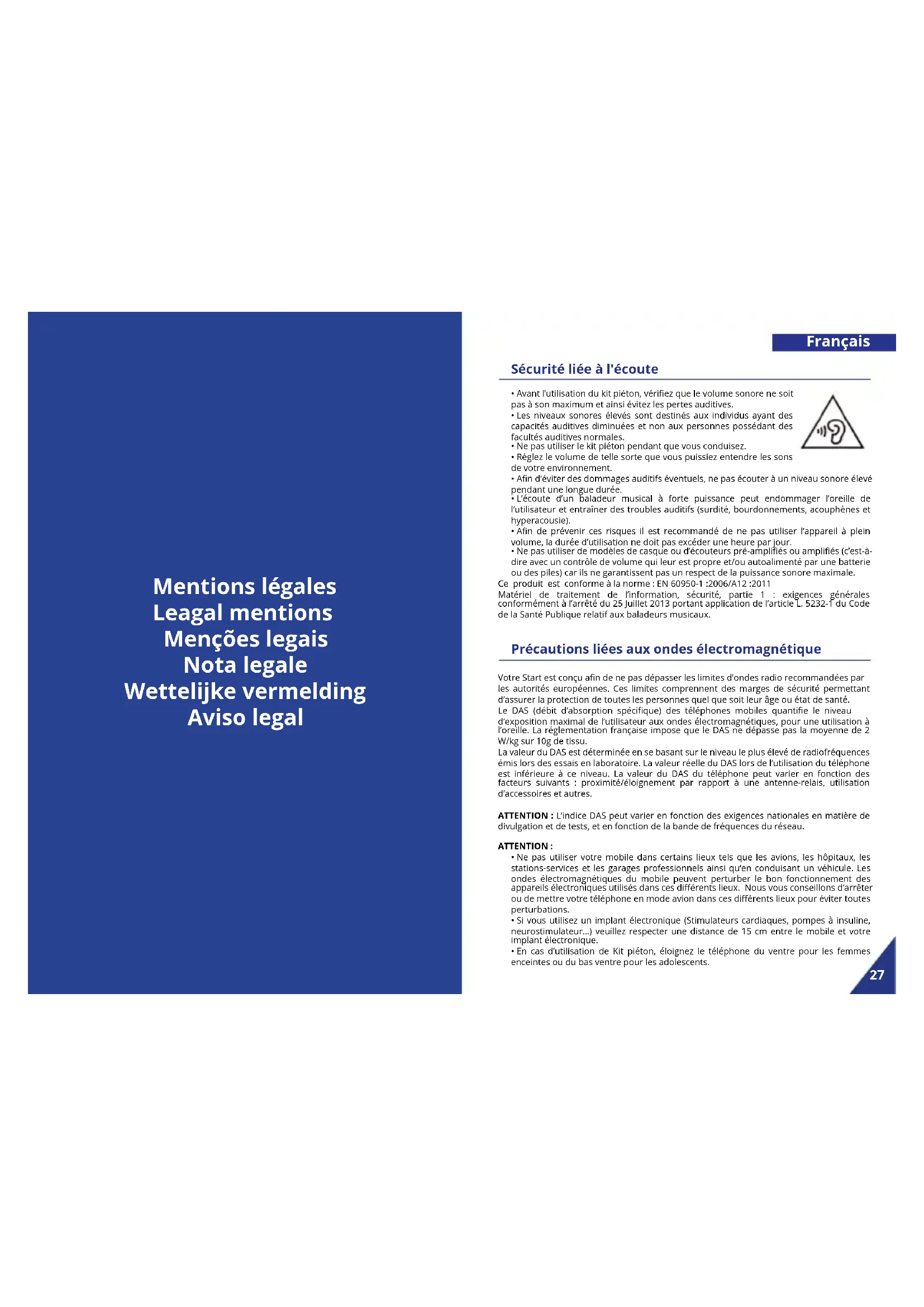 - Ne pas utiliser de modèles de casque ou d’écouteurs pré-ampliés ou ampliés (c’est-à- dire avec un contrôle de volume qui leur est propre et/ou autoalimenté par une batterie ou des piles) car ils ne garantissent pas un respect de la puissance sonore maximale. Ce produit est conforme à la norme : EN 60950-1 :2006/A12 :2011 Matériel de traitement de l’information, sécurité, partie 1 : exigences générales conformément à l’arrêté du 25 Juillet 2013 portant application de l’article L. 5232-1 du Code de la Santé Publique relatif aux baladeurs musicaux. Français Votre Start est conçu an de ne pas dépasser les limites d’ondes radio recommandées par les autorités européennes. Ces limites comprennent des marges de sécurité permettant d’assurer la protection de toutes les personnes quel que soit leur âge ou état de santé. Le DAS (débit d’absorption spécique) des téléphones mobiles quantie le niveau d’exposition maximal de l’utilisateur aux ondes électromagnétiques, pour une utilisation à l’oreille. La réglementation française impose que le DAS ne dépasse pas la moyenne de 2 W/kg sur 10g de tissu. La valeur du DAS est déterminée en se basant sur le niveau le plus élevé de radiofréquences émis lors des essais en laboratoire. La valeur réelle du DAS lors de l’utilisation du téléphone est inférieure à ce niveau. La valeur du DAS du téléphone peut varier en fonction des facteurs suivants : proximité/éloignement par rapport à une antenne-relais, utilisation d’accessoires et autres. ATTENTION : L’indice DAS peut varier en fonction des exigences nationales en matière de divulgation et de tests, et en fonction de la bande de fréquences du réseau. ATTENTION :