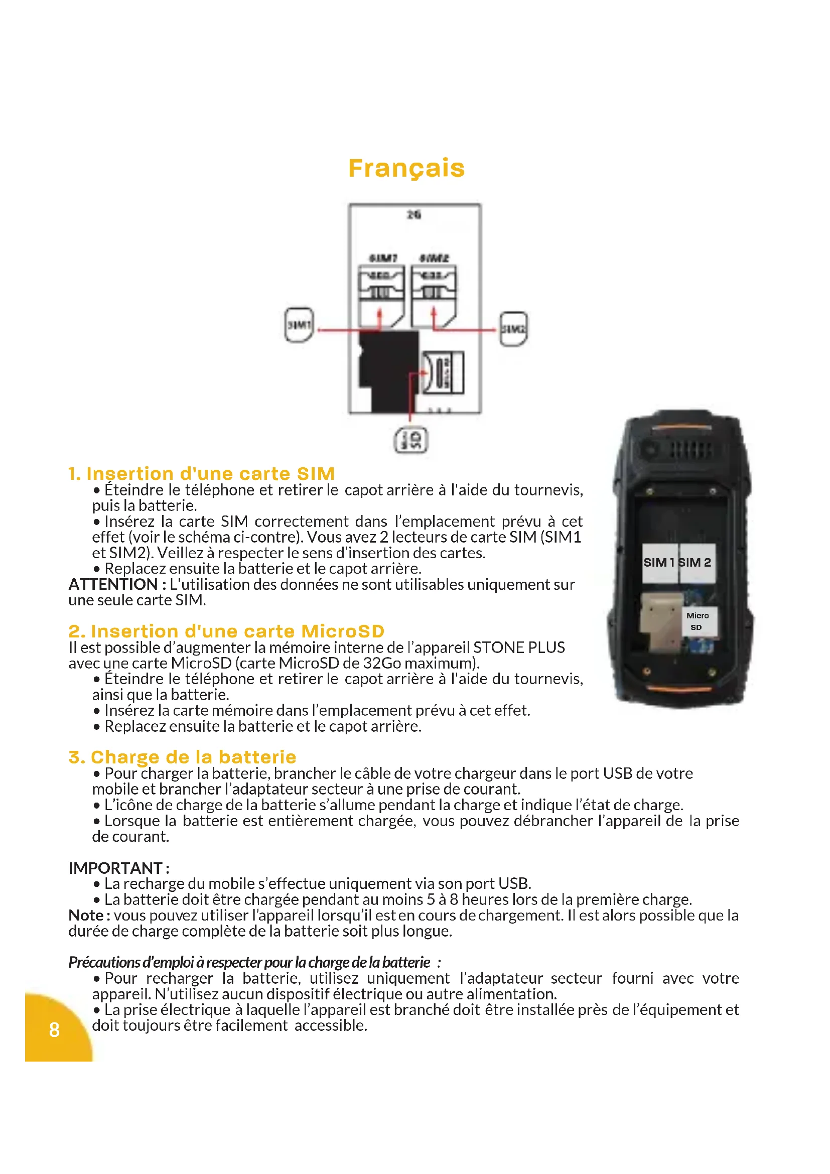 Votre STONE PLUS est un mobile double SIM, il vous permet de téléphoner avec deux abonnements à partir du même appareil. Il y a deux emplacements prévus pour deux cartes SIM. Au démarrage de votre mobile ce dernier vous invitera à entrer successivement le code PIN de vos deux cartes SIM. (SIM1 puis SIM 2)