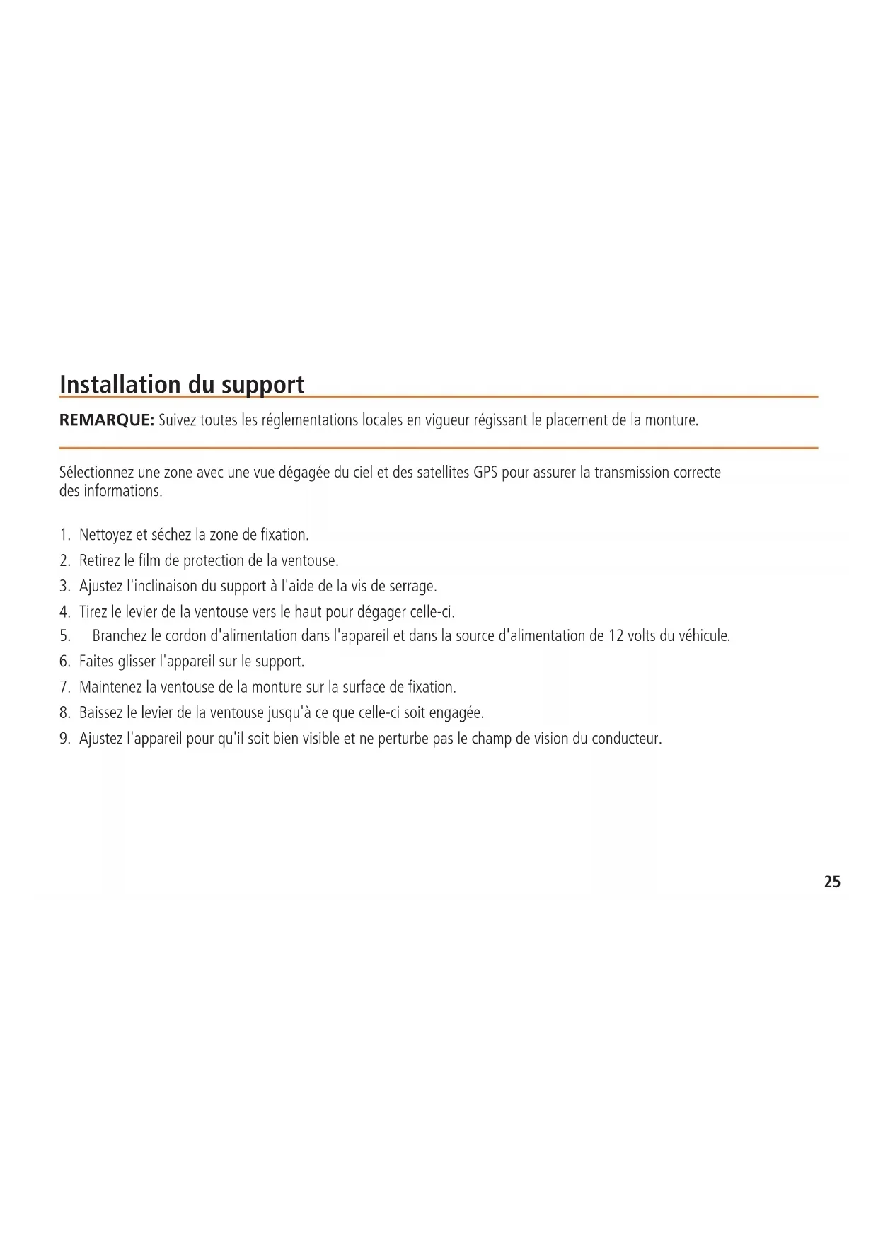 : certaines fonctionnalités de cet appareil nécessitent une connexion sans fil et vous devez de ce fait souscrire à un forfait Internet auprès de votre opérateur. En tant qu'utilisateur vous êtes responsable pour tous les frais d'accès. Veuillez contacter votre opérateur pour vous assurer de ne pas dépasser les limites de données autorisées pour votre forfait. logIcIel dock de Rand Mcnally: maintenez votre appareil à jour en téléchargeant le logiciel Dock de Rand McNally sur votre ordinateur personnel à l'adresse www.randmcnally.com/dock puis en connectant votre appareil à l'aide du câble USB fourni. PoUR en savoIR PlUs: utilisez votre appareil pour consulter Didacticiel et conseils sous Préférences > Général afin d'obtenir plus d'informations, ou bien rendez-vous à l'adresse www.randmcnally.com/support pour télécharger le manuel d'utilisateur. BoUTon d'alIMenTaTIon: maintenez le bouton d'alimentation orange appuyé pour mettre l'appareil sous ou hors tension. Ce bouton peut également être utilisé pour accéder rapidement à certaines fonctionnalités lorsque l'appareil est sous tension. Consultez Préférences > Général > Appui rapide sur le bouton d'alimentation pour découvrir les options. Un voyant rouge indique que la batterie est en cours de chargement; un voyant vert indique que celle-ci est complètement chargée. RéInITIalIseR: utilisez le bouton de réinitialisation à l'arrière de l'appareil pour redémarrer celui-ci. L'itinéraire actuel est annulé, mais les préférences, le carnet d'adresses et toute autre donnée personnelle seront enregistrés. Certains écrans vous offrent des conseils. Toquez sur ce bouton pour y accéder. 2324Installation du support ReMaRQUe: Suivez toutes les réglementations locales en vigueur régissant le placement de la monture. Sélectionnez une zone avec une vue dégagée du ciel et des satellites GPS pour assurer la transmission correcte des informations.