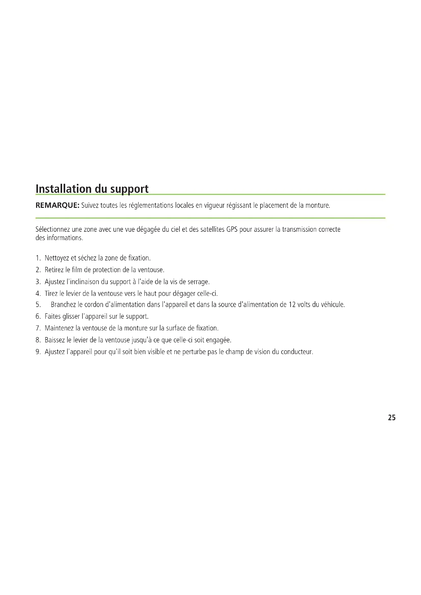 9. Ajustez l'appareil pour qu'il soit bien visible et ne perturbe pas le champ de vision du conducteur.