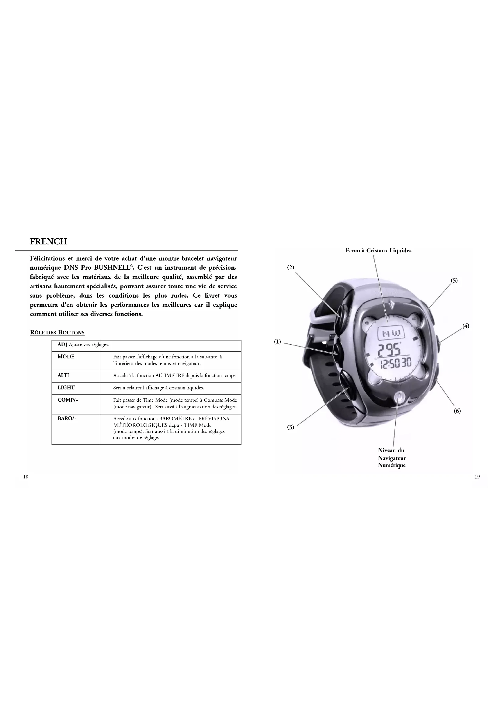 ADJ Ajuste vos réglages. MODE Fait passer l'affichage d'une fonction à la suivante, à l'intérieur des modes temps et navigateur. ALTI Accède à la fonction ALTIMÈTRE depuis la fonction temps. LIGHT Sert à éclairer l'affichage à cristaux liquides. COMP/+ Fait passer de Time Mode (mode temps) à Compass Mode (mode navigateur). Sert aussi à l'augmentation des réglages. BARO/- Accède aux fonctions BAROMÈTRE et PRÉVISIONS MÉTÉOROLOGIQUES depuis TIME Mode (mode temps). Sert aussi à la diminution des réglages aux modes de réglage.