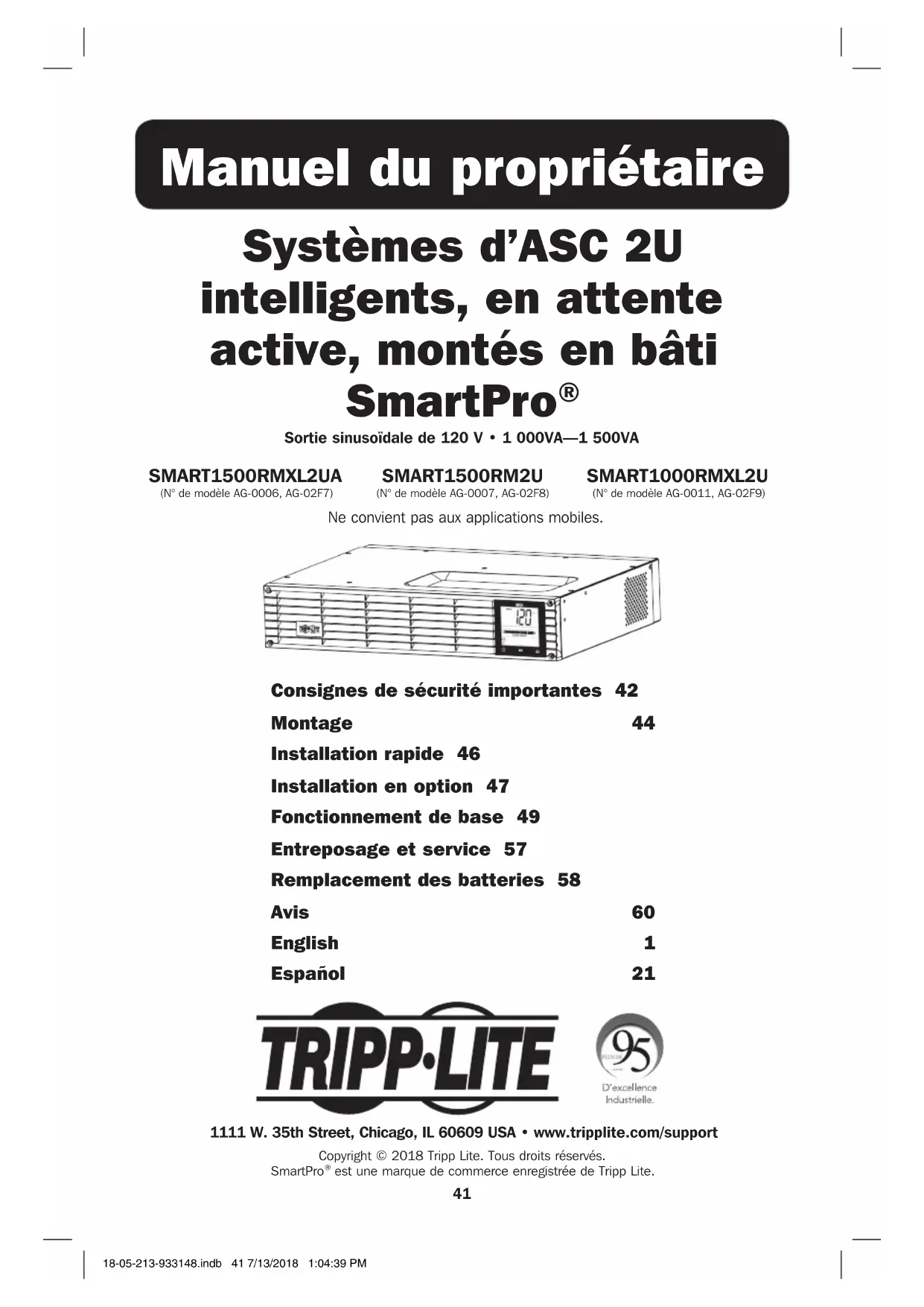 Remontez le panneau avant. 18-05-213-933148.indb 59 7/13/2018 1:04:49 PM60 Numéros d’identification de conformité aux règlements À des fins de certification et d’identification de conformité aux règlements, votre produit Tripp Lite a reçu un numéro de série unique. Ce numéro de série se trouve sur la plaque signalétique du produit, avec toutes les inscriptions et les informations d'approbations requises. Lors d’une demande d’information de conformité, pour ce produit, utiliser toujours le numéro de série. Le numéro de série ne doit pas être confondu avec le nom de la marque ou le numéro de modèle du produit. Tripp Lite applique une politique d'amélioration continue. Les spécifications peuvent être modifiées sans préavis. Note sur l’étiquette Deux symboles sont utilisés sur l’étiquette. V~ : tension CA V : tension CC Avis 18-05-213 • 93-3148_RevF 1111 W. 35th Street, Chicago, IL 60609 USA • www.tripplite.com/support 18-05-213-933148.indb 60 7/13/2018 1:04:50 PM