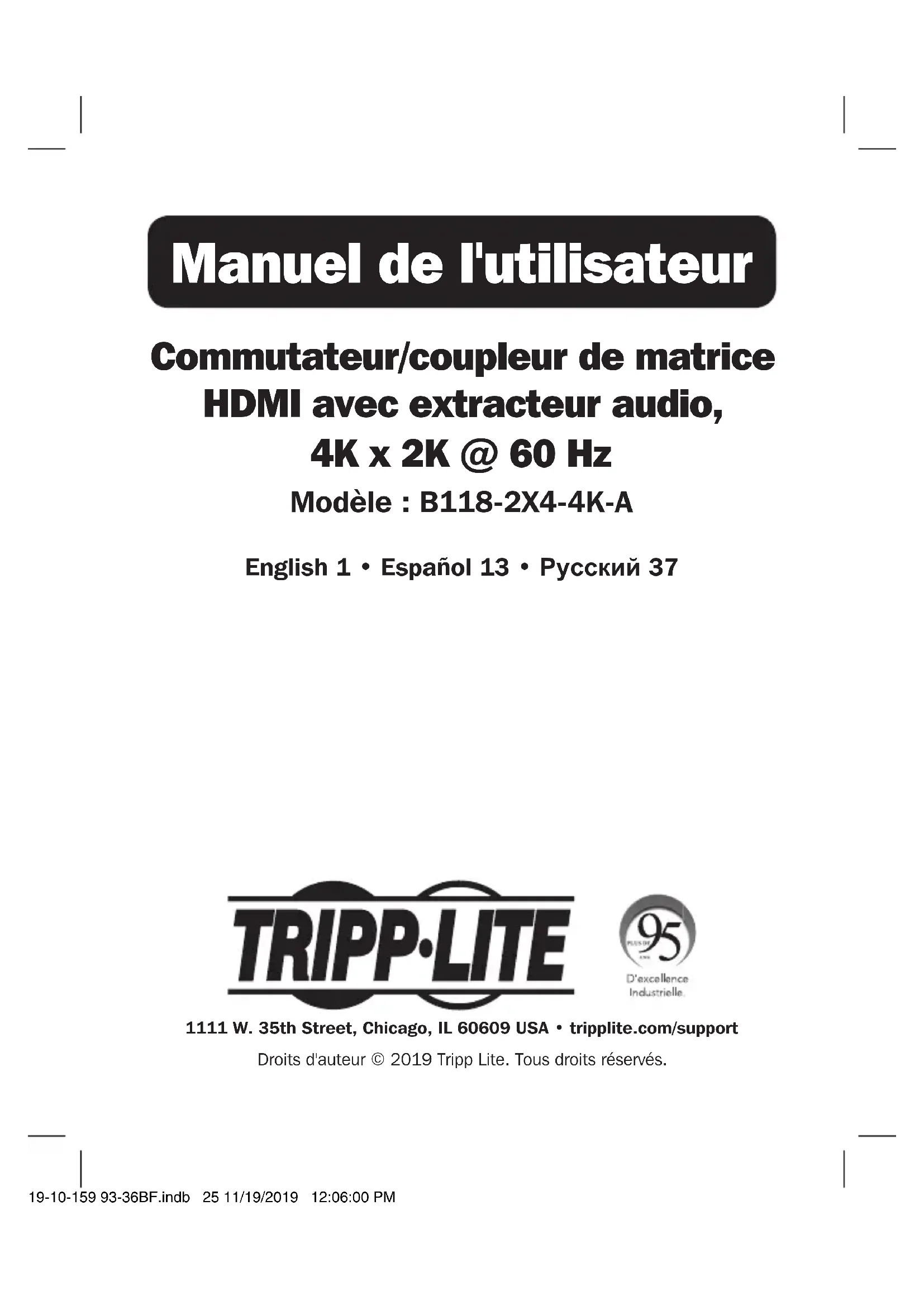 AÑOS 19-10-159 93-36BF.indb 24 11/19/2019 12:06:00 PM25 Manuel de l'utilisateur Commutateur/coupleur de matrice HDMI avec extracteur audio, 4K x 2K @ 60 Hz Modèle : B118-2X4-4K-A 1111 W. 35th Street, Chicago, IL 60609 USA • tripplite.com/supportDroits d'auteur © 2019 Tripp Lite. Tous droits réservés. English 1 • Español 13 • Русский 37 19-10-159 93-36BF.indb 25 11/19/2019 12:06:00 PM26 Contenu de l'emballage Accessoires en option