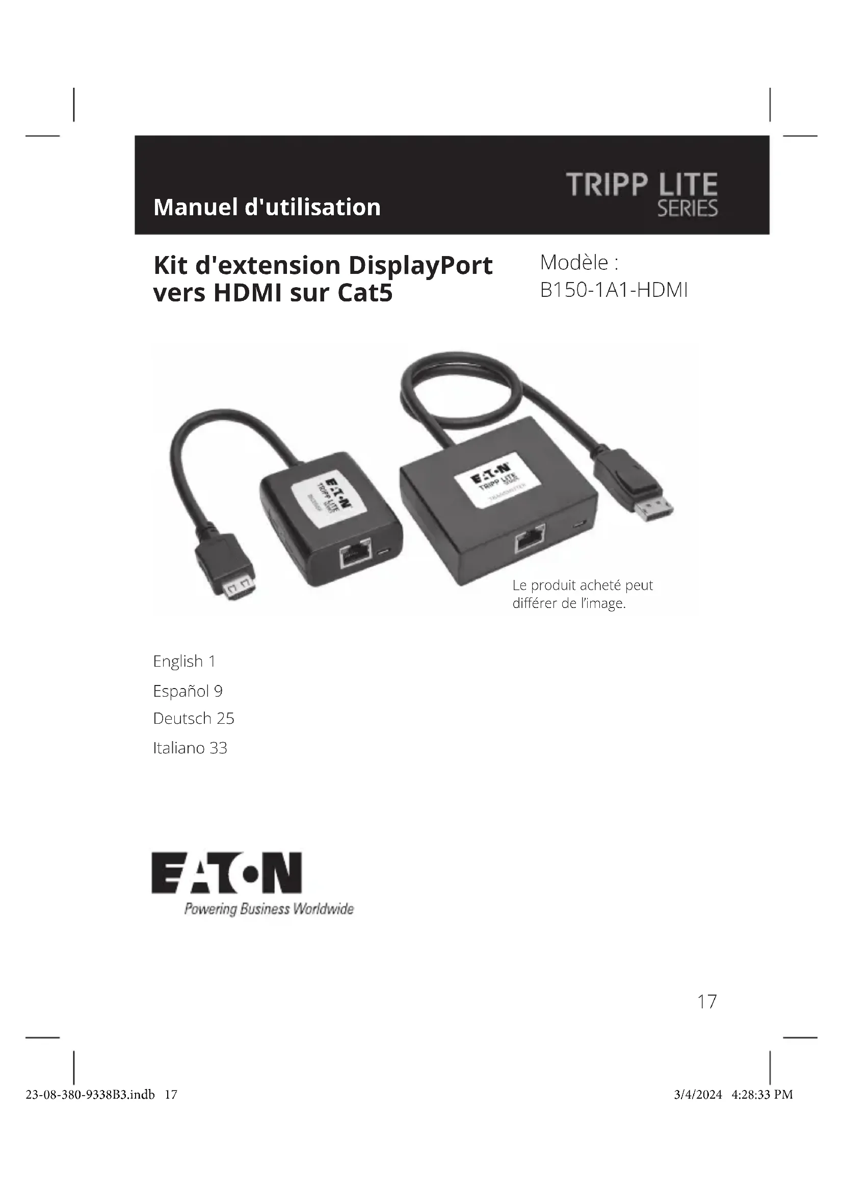 - Renvoyer le nouvel équipement pour recyclage lorsqu'il est en n de vie et devient un déchet L'utilisation de ce produit avec des dispositifs de maintien en vie n'est pas recommandée dans les cas où une panne de ce produit serait susceptible d'entraîner une panne du dispositif de maintien en vie ou de nuire considérablement à sa sécurité ou à son ecacité. Eaton mène une politique d'amélioration constante. Les caractéristiques peuvent être modiées sans préavis. 23-08-380-9338B3.indb 2323-08-380-9338B3.indb 23 3/4/2024 4:28:34 PM3/4/2024 4:28:34 PM24 Eaton 1000 Eaton Boulevard Cleveland, OH 44122 United States Eaton.com © 2024 Eaton Tous droits réservés. Publication n° 23-08-380 / 93-38B3_RevB Mars 2024 Eaton est une marque déposée. Toutes les marques commerciales appartiennent à leurs propriétaires respectifs. 23-08-380-9338B3.indb 2423-08-380-9338B3.indb 24 3/4/2024 4:28:34 PM3/4/2024 4:28:34 PM25 Benutzerhandbuch Das gekaufte Produkt kann von der Abbildung abweichen. Modell: B150-1A1-HDMIl DisplayPort zu HDMI über Cat5 Extender Kit English 1 Español 9 Français 17 Italiano 33 23-08-380-9338B3.indb 2523-08-380-9338B3.indb 25 3/4/2024 4:28:35 PM3/4/2024 4:28:35 PM26 Produktmerkmale Lieferumfang Optionales Zubehör