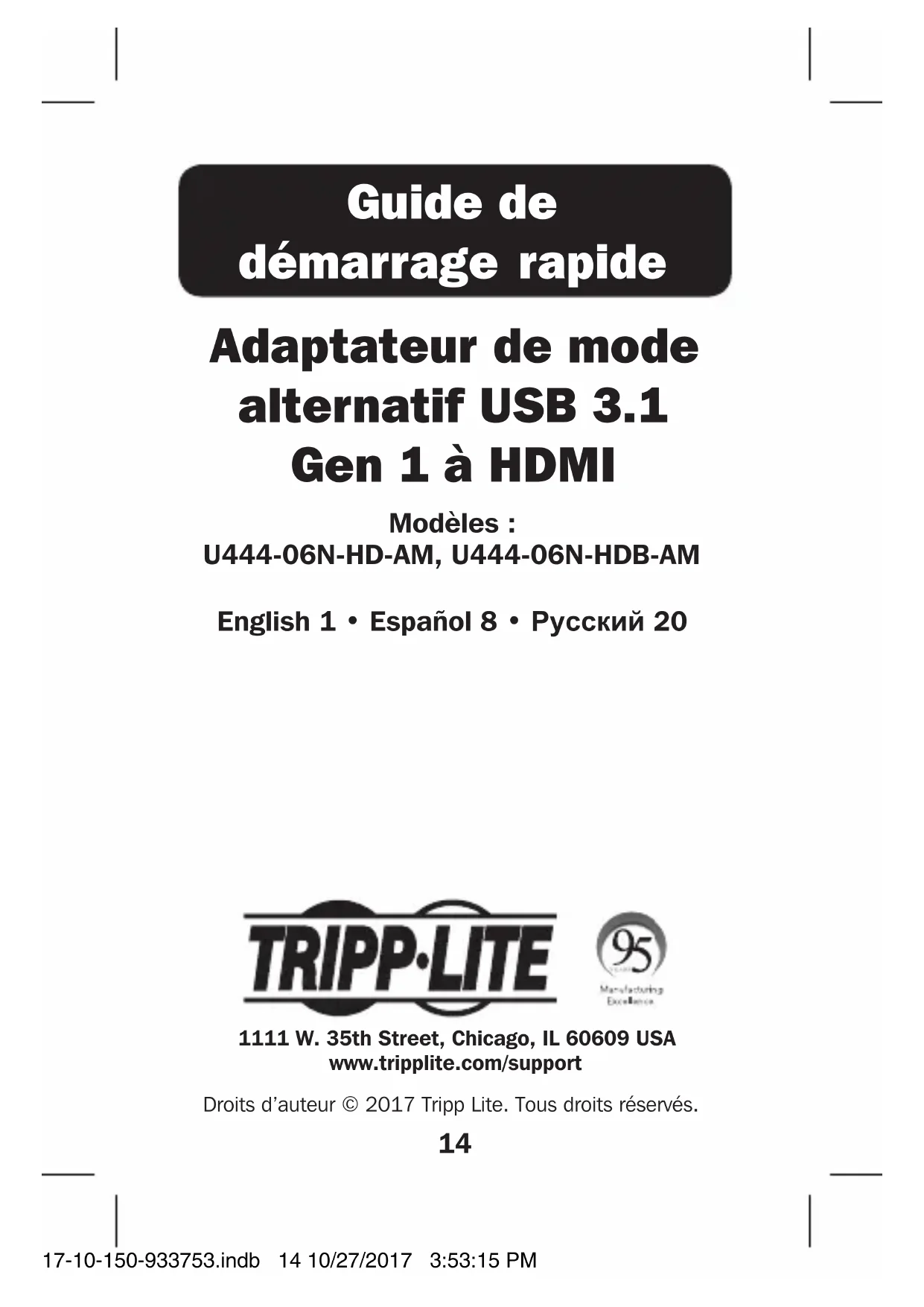 - Guide de démarrage rapide 17-10-150-933753.indb 16 10/27/2017 3:53:15 PM17 Caractéristiques techniques Connecteurs USB USB Type-C (mâle) Affichage HDMI (femelle) Vidéo Résolutions maximales 3 840 x 2 600 (60 Hz)*, 3 840 x 2 160 (24/25/30 Hz) Profondeur des couleurs 36 bits Deep Color (12 bits par canal) Écologique Température de fonctionnement 0 à 45 °C Humidité de fonctionnement 10 à 85 % HR, sans condensation Température d'entreposage -10 à 70 °C Humidité d'entreposage 5 à 90 % HR, sans condensation Besoins en matière d'alimentation Alimentation externe Non *3 840 x 2 600 @ 60 Hz pris en charge en mode Single Stream Transport (SST) seulement Des moniteurs supplémentaires peuvent être connectés en utilisant le mode Multi Stream Transport (MST) 17-10-150-933753.indb 17 10/27/2017 3:53:15 PM18 Garantie Garantie limitée de 3 ans TRIPP LITE garantit que ses produits sont exempts de vices de matériaux et de fabrication pendant une période trois (3) ans à partir de la date d’achat initiale. La responsabilité de TRIPP LITE, en vertu de la présente garantie, se limite à la réparation ou au remplacement (à sa seule discrétion) de ces produits défectueux. Pour obtenir réparation sous cette garantie, vous devez obtenir un numéro d’autorisation de retour de matériel (« RMA ») auprès de TRIPP LITE ou d’un centre de réparation autorisé par TRIPP LITE. Les produits doivent être retournés à TRIPP LITE ou à un centre de réparation autorisé par TRIPP LITE en port prépayé et être accompagnés d’une brève description du problème et d’un justificatif de la date et du lieu d’achat. Cette garantie ne s’applique pas au matériel ayant été endommagé suite à un accident, à une négligence ou à une application abusive, ou ayant été altéré ou modifié d’une façon quelconque. SAUF INDICATION CONTRAIRE DANS LES PRÉSENTES, TRIPP LITE N’ÉMET AUCUNE GARANTIE, EXPRESSE OU TACITE, Y COMPRIS DES GARANTIES DE QUALITÉ COMMERCIALE ET D’ADÉQUATION À UN USAGE PARTICULIER. Certains États n’autorisant pas la limitation ni l’exclusion de garanties tacites, les limitations ou exclusions susmentionnées peuvent ne pas s’appliquer à l’acheteur. À L’EXCEPTION DES DISPOSITIONS CI-DESSUS, TRIPP LITE NE POURRA EN AUCUN CAS ÊTRE TENUE RESPONSABLE DE DOMMAGES DIRECTS, INDIRECTS, SPÉCIAUX, FORTUITS OU CONSÉCUTIFS RÉSULTANT DE L’UTILISATION DE CE PRODUIT, MÊME SI AYANT ÉTÉ AVISÉE DE L’ÉVENTUALITÉ DE TELS DOMMAGES. Plus précisément, TRIPP LITE ne pourra être tenue responsable de coûts, tels que perte de bénéfices ou de recettes, perte de matériel, impossibilité d’utilisation du matériel, perte de logiciel, perte de données, frais de produits de remplacement, réclamations d’un tiers ou autres. 17-10-150-933753.indb 18 10/27/2017 3:53:15 PM19 Garantie La politique de Tripp Lite en est une d’amélioration continue. Les caractéristiques techniques sont sujettes à changement sans préavis. 1111 W. 35th Street, Chicago, IL 60609 USA www.tripplite.com/support 17-10-150-933753.indb 19 10/27/2017 3:53:16 PM20 Адаптер USB 3.1 Gen 1 / HDMI Alternate Mode Mоделей: