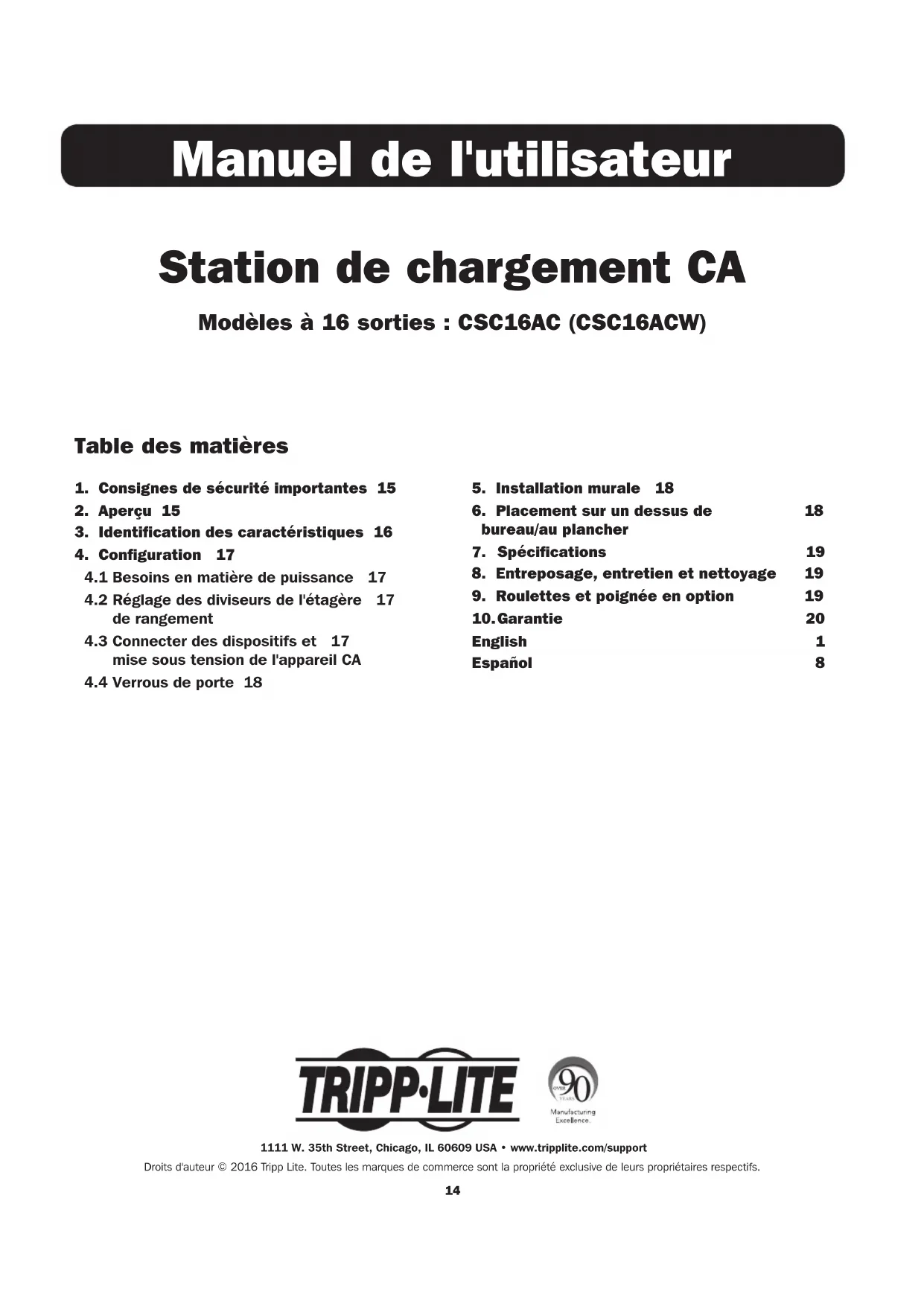 English 1 Español 8 Station de chargement CA Modèles à 16 sorties : CSC16AC (CSC16ACW) Manuel de l'utilisateur 1111 W. 35th Street, Chicago, IL 60609 USA • www.tripplite.com/support Droits d'auteur © 2016 Tripp Lite. Toutes les marques de commerce sont la propriété exclusive de leurs propriétaires respectifs.15