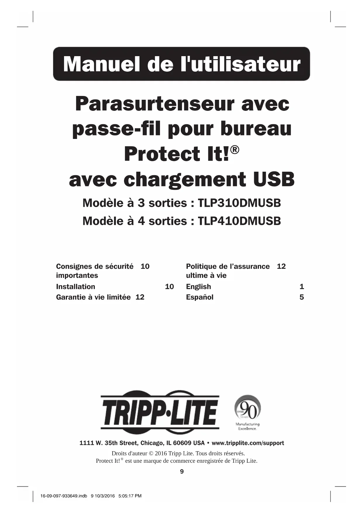 avec chargement USB Modèle à 3 sorties : TLP310DMUSB Modèle à 4 sorties : TLP410DMUSB 1111 W. 35th Street, Chicago, IL 60609 USA • www.tripplite.com/supportDroits d'auteur © 2016 Tripp Lite. Tous droits réservés. Protect It! est une marque de commerce enregistrée de Tripp Lite. Consignes de sécurité 10 importantes Installation 10 Garantie à vie limitée 12 Politique de l’assurance 12 ultime à vie English 1 Español 5 16-09-097-933649.indb 9 10/3/2016 5:05:17 PM10 Consignes de sécurité importantes Installation