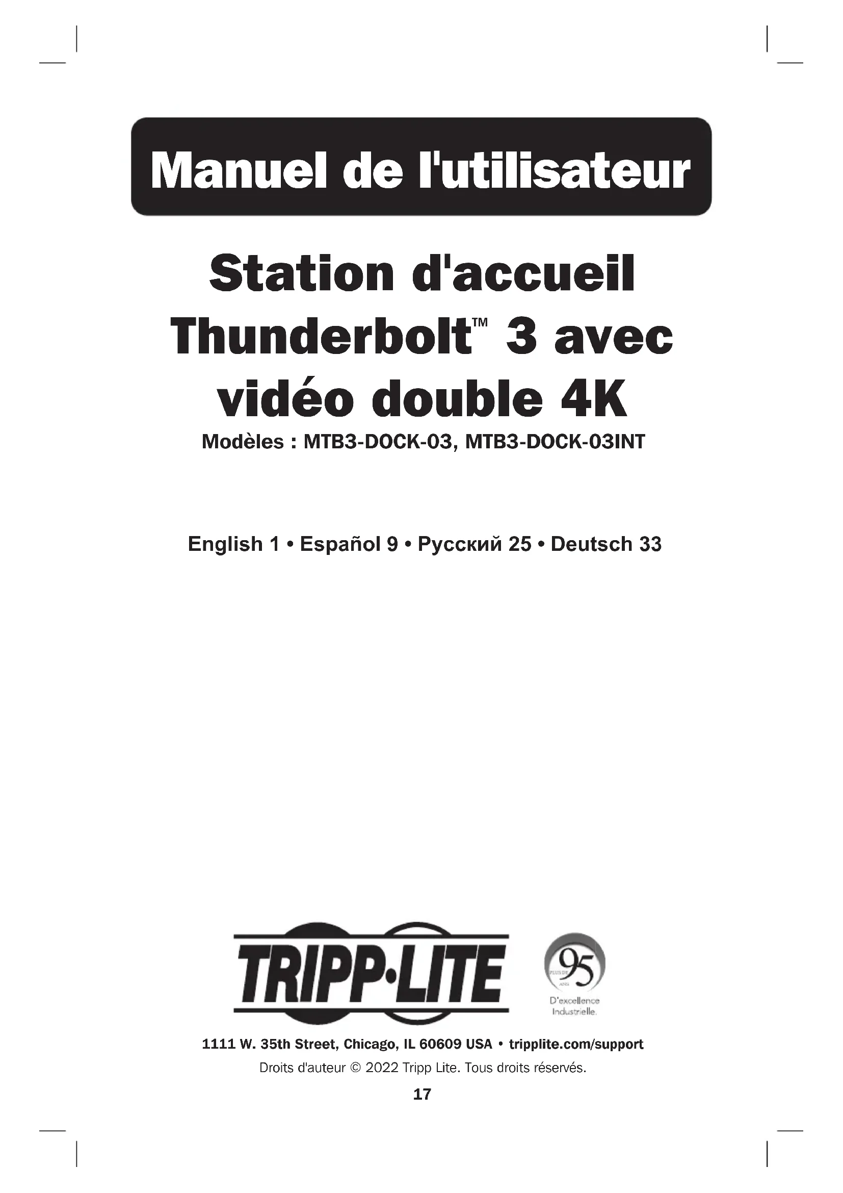 station d'accueil. Les deux fentes peuvent être utilisées simultanément.22 Exigences pour plusieurs moniteurs Le MTB3-DOCK-03 et le MTB3-DOCK-03INT prennent en charge la connexion de deux moniteurs en même temps par le biais du mode DisplayPort Multi-Stream Transport (MST). Raccorder en même temps un moniteur DisplayPort et un moniteur activé Thunderbolt 3. Les limitations suivantes doivent être prises en considération au moment de raccorder plusieurs moniteurs en même temps : L'ordinateur source prend-il en charge le mode DisplayPort MST? Lors d'un raccordement à une source Thunderbolt 3 qui prend en charge le mode DisplayPort, les informations EDID (Extended Display Identification Data) des deux moniteurs connectés seront lues par l'ordinateur et affichées sur des écrans distincts qui peuvent être présentés en mode miroir ou en mode prolongé. Le port DisplayPort et le port Thunderbolt 3 peuvent atteindre des résolutions vidéo allant jusqu'à 8K (7 680 x 4 320) @ 30 Hz lorsqu'ils sont utilisés avec un ordinateur source activé Thunderbolt 3 et un câble Thunderbolt 3. Les ports peuvent être utilisés simultanément à des résolutions de 8K @ 30 Hz plus 4K @ 30 Hz. Lors de la connexion à une source Thunderbolt 3 qui ne prend pas en charge le mode MST DisplayPort, un seul port vidéo affichera la vidéo selon la formule premier arrivé, premier servi, et sera toujours le premier port vidéo connecté. Est-ce que l'ordinateur source prend en charge une connexion Thunderbolt 3? Le MTB3-DOCK-03 et le MTB3-DOCK-03INT peuvent être utilisés pour transmettre une vidéo d’ordinateurs sources qui comportent un port Thunderbolt 3 ou un port USB Type-C qui prend en charge MFDP (Multi-Function DisplayPort). Pour atteindre une performance et une résolution vidéo optimales, le dispositif doit être utilisé avec un port activé Thunderbolt 3. Lorsque connecté à un port Thunderbolt 3 d'un ordinateur, le connecteur DisplayPort prend en charge des résolutions vidéo DP1.4 à 4 voies allant jusqu'à 8K (7 680 x 4 320) @ 30 Hz. Lorsque connecté à un port USB Type-C activé MFDP, le connecteur DisplayPort peut seulement atteindre des résolutions vidéo DP1.4 à 2 voies allant jusqu'à 4K (3 840 x 2 160) @ 60 Hz, et exige que l'ordinateur hôte prenne en charge le mode alternatif DP1.4. Le port de sortie Thunderbolt 3 ne peut pas être utilisé pour transmettre de la vidéo lorsqu'il est branché dans un port USB Type-C, car il prend uniquement en charge la transmission de données USB 2.0 de cette façon.23 Caractéristiques techniques Lorsque branché dans un port activé Thunderbolt 3 Lorsque branché dans un port USB Type-C MFDP Connecteurs - sortie Port CC Alimentation CC (femelle) Thunderbolt 3 Thunderbolt 3 Type-C (femelle) Connecteurs - sortie USB-A USB 3.2 Gen 2 Type-A (femelle) x2 USB-C USB 3.2 Gen 2 Type-C (femelle) Ethernet RJ45 (femelle) DisplayPort DisplayPort (femelle) Port audio 3,5 mm (femelle) Mémoire SD 4.0 (femelle); Micro-SD 4.0 (femelle) Caractéristiques techniques du transfert de données Thunderbolt 3 (entrée) Thunderbolt 3 (40 Gbps) USB 3.2 Gen 2 (26,2 Gbps) Thunderbolt 3 (sortie) Thunderbolt 3 (40 Gbps), données + vidéo USB 2.0 (480 Mbps), données + chargement USB-A (x2) USB 3.2 Gen 2 (10 Gbps), données + chargement USB-C USB 3.2 Gen 2 (10 Gbps), données + chargement Mémoire (SD + Micro-SD) SD 4.0, mSD 4.0 (312 MB/s) Port audio Jusqu'à 384 Khz, taux d'échantillonnage de 16/24/32 bits Conditions environnementales Température de fonctionne- ment 0 à 45 °C (32 à 113 °F) Humidité de fonctionne- ment 10 à 90 % HR, sans condensation Température d'entreposage 0 à 70 °C (32 à 158 °F) Humidité d'entreposage 10 à 90 % HR, sans condensation Caractéristiques techniques du réseau RJ45 10/100/1 000 Mbps (1 Gigabit) Caractéristiques techniques de l'écran DisplayPort 7 680 x 4 320 @ 30 Hz (8K UHD) 3 840 x 2 160 @ 60 Hz (4K UHD) Thunderbolt 3 7 680 x 4 320 @ 30 Hz La vidéo n'est pas prise en charge. Écran double (mode MST) 8K @ 30 Hz + 4K @ 30 Hz ou 4K @ 60 Hz + 4K @ 60 HZ La vidéo n'est pas prise en charge. Caractéristiques techniques électriques Alimentation CC 120 W (20 V 6 A) Thunderbolt 3 (entrée) Charge un ordinateur hôte jusqu'à 60 W (5 à 20 V 3 A) Thunderbolt 3 (sortie) Connecter en guirlande jusqu'à 6 dispositifs avec une capacité de source de 15 W (5 V 3 A) USB-A (BC1.2) Chargement en aval maximum de 5 V 1,5 A USB-A Chargement en aval maximum de 5 V 900 mA USB-C Chargement en aval maximum de 5 V 1,5 A24 Garantie Garantie limitée de 3 ans Tripp Lite garantit que ses produits sont exempts de vices de matériaux et de fabrication pendant une période de trois (3) ans à partir de la date d'achat initiale. La responsabilité de Tripp Lite, en vertu de la présente garantie, se limite à la réparation ou au remplacement (à sa seule discrétion) de ces produits défectueux. Pour obtenir réparation sous cette garantie, vous devez obtenir un numéro d'autorisation de retour de matériel (« RMA ») auprès de Tripp Lite ou d'un centre de réparation autorisé par Tripp Lite. Les produits doivent être retournés à Tripp Lite ou à un centre de réparation autorisé par Tripp Lite en port prépayé et être accompagnés d'une brève description du problème et d'un justificatif de la date et du lieu d'achat. Cette garantie ne s'applique pas au matériel ayant été endommagé suite à un accident, à une négligence ou à une application abusive, ou ayant été altéré ou modifié d'une façon quelconque. SAUF INDICATION CONTRAIRE DANS LES PRÉSENTES, Tripp Lite N'ÉMET AUCUNE GARANTIE, EXPRESSE OU TACITE, Y COMPRIS DES GARANTIES DE QUALITÉ COMMERCIALE ET D'ADÉQUATION À UN USAGE PARTICULIER. Certains États n'autorisant pas la limitation ni l'exclusion de garanties tacites, les limitations ou exclusions susmentionnées peuvent ne pas s'appliquer à l'acheteur. À L'EXCEPTION DES DISPOSITIONS CI-DESSUS, Tripp Lite NE 