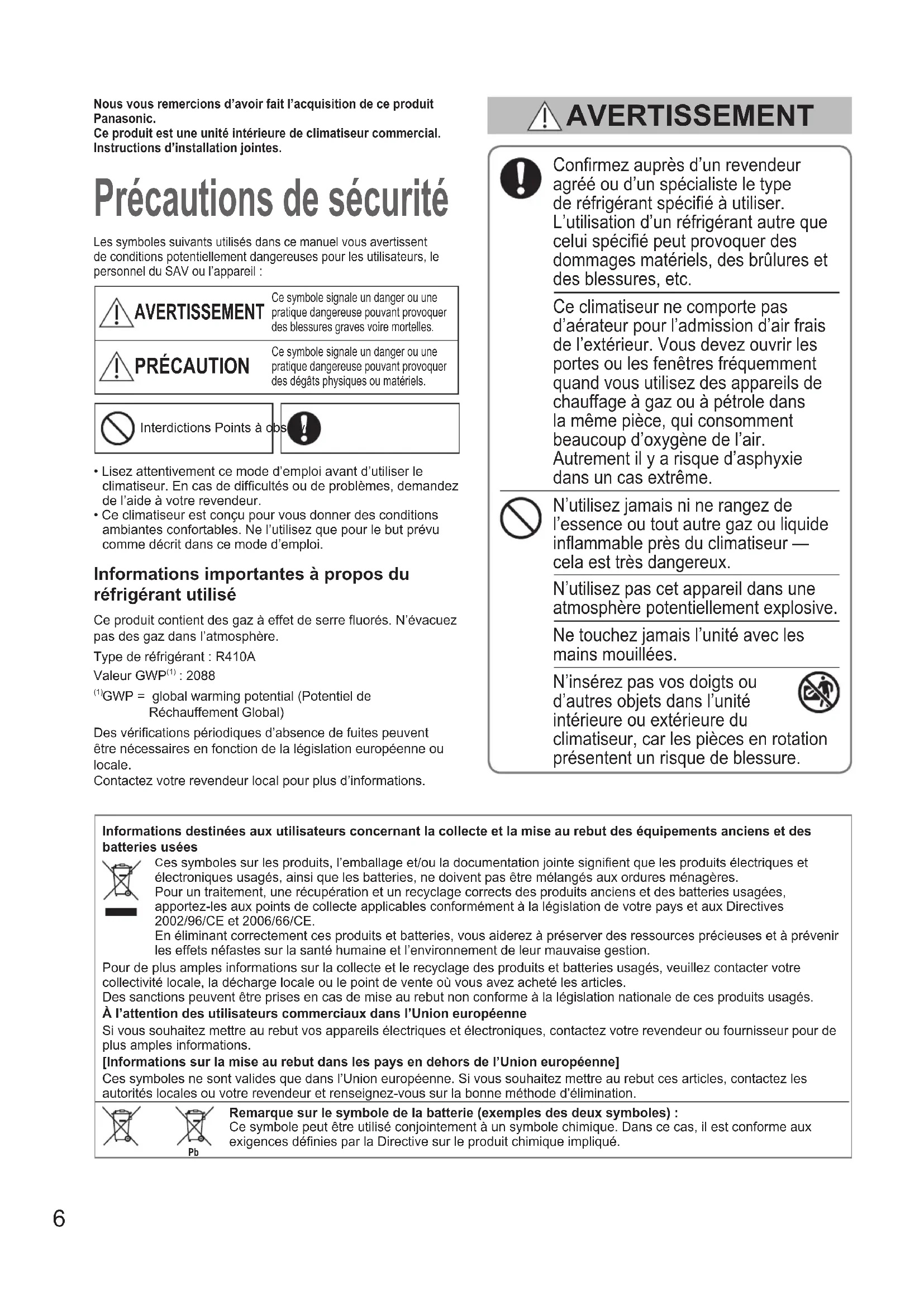 00_330578_All.indb 5 2021/4/8 10:04:066 Nous vous remercions d’avoir fait l’acquisition de ce produit Panasonic.Ce produit est une unité intérieure de climatiseur commercial.Instructions d’installation jointes. Précautions de sécurité Les symboles suivants utilisés dans ce manuel vous avertissent de conditions potentiellement dangereuses pour les utilisateurs, le personnel du SAV ou l’appareil : AVERTISSEMENT Ce symbole signale un danger ou une pratique dangereuse pouvant provoquer des blessures graves voire mortelles. PRÉCAUTION Ce symbole signale un danger ou une pratique dangereuse pouvant provoquer des dégâts physiques ou matériels.Interdictions Points à observer• Lisez attentivement ce mode d’emploi avant d’utiliser le climatiseur. En cas de difcultés ou de problèmes, demandez de l’aide à votre revendeur.• Ce climatiseur est conçu pour vous donner des conditions ambiantes confortables. Ne l’utilisez que pour le but prévu comme décrit dans ce mode d’emploi. Conrmez auprès d’un revendeur agréé ou d’un spécialiste le type de réfrigérant spécié à utiliser. L’utilisation d’un réfrigérant autre que celui spécié peut provoquer des dommages matériels, des brûlures et des blessures, etc. Ce climatiseur ne comporte pas d’aérateur pour l’admission d’air frais de l’extérieur. Vous devez ouvrir les portes ou les fenêtres fréquemment quand vous utilisez des appareils de chauffage à gaz ou à pétrole dans la même pièce, qui consomment beaucoup d’oxygène de l’air. Autrement il y a risque d’asphyxie dans un cas extrême. N’utilisez jamais ni ne rangez de l’essence ou tout autre gaz ou liquide inammable près du climatiseur — cela est très dangereux. N’utilisez pas cet appareil dans une atmosphère potentiellement explosive. Ne touchez jamais l’unité avec les mains mouillées. N’insérez pas vos doigts ou d’autres objets dans l’unité intérieure ou extérieure du climatiseur, car les pièces en rotation présentent un risque de blessure. AVERTISSEMENT Informations importantes à propos du réfrigérant utiliséCe produit contient des gaz à effet de serre fluorés. N’évacuez pas des gaz dans l’atmosphère.Type de réfrigérant : R410AValeur GWP (1) : 2088 (1) GWP = global warming potential (Potentiel de Réchauffement Global)Des vérifications périodiques d’absence de fuites peuvent être nécessaires en fonction de la législation européenne ou locale.Contactez votre revendeur local pour plus d’informations.Informations destinées aux utilisateurs concernant la collecte et la mise au rebut des équipements anciens et des batteries usées es symboles sur les produits, l’emballage et/ou la documentation jointe signient que les produits électriques et électroniques usagés, ainsi que les batteries, ne doivent pas être mélangés aux ordures ménagères.Pour un traitement, une récupération et un recyclage corrects des produits anciens et des batteries usagées, apportez-les aux points de collecte applicables conformément à la législation de votre pays et aux Directives 2002/96/CE et 2006/66/CE.En éliminant correctement ces produits et batteries, vous aiderez à préserver des ressources précieuses et à prévenir les effets néfastes sur la santé humaine et l’environnement de leur mauvaise gestion. Pour de plus amples informations sur la collecte et le recyclage des produits et batteries usagés, veuillez contacter votre collectivité locale, la décharge locale ou le point de vente où vous avez acheté les articles. Des sanctions peuvent être prises en cas de mise au rebut non conforme à la législation nationale de ces produits usagés. À l’attention des utilisateurs commerciaux dans l’Union européenne Si vous souhaitez mettre au rebut vos appareils électriques et électroniques, contactez votre revendeur ou fournisseur pour de plus amples informations.[Informations sur la mise au rebut dans les pays en dehors de l’Union européenne] Ces symboles ne sont valides que dans l’Union européenne. Si vous souhaitez mettre au rebut ces articles, contactez les autorités locales ou votre revendeur et renseignez-vous sur la bonne méthode d’élimination.