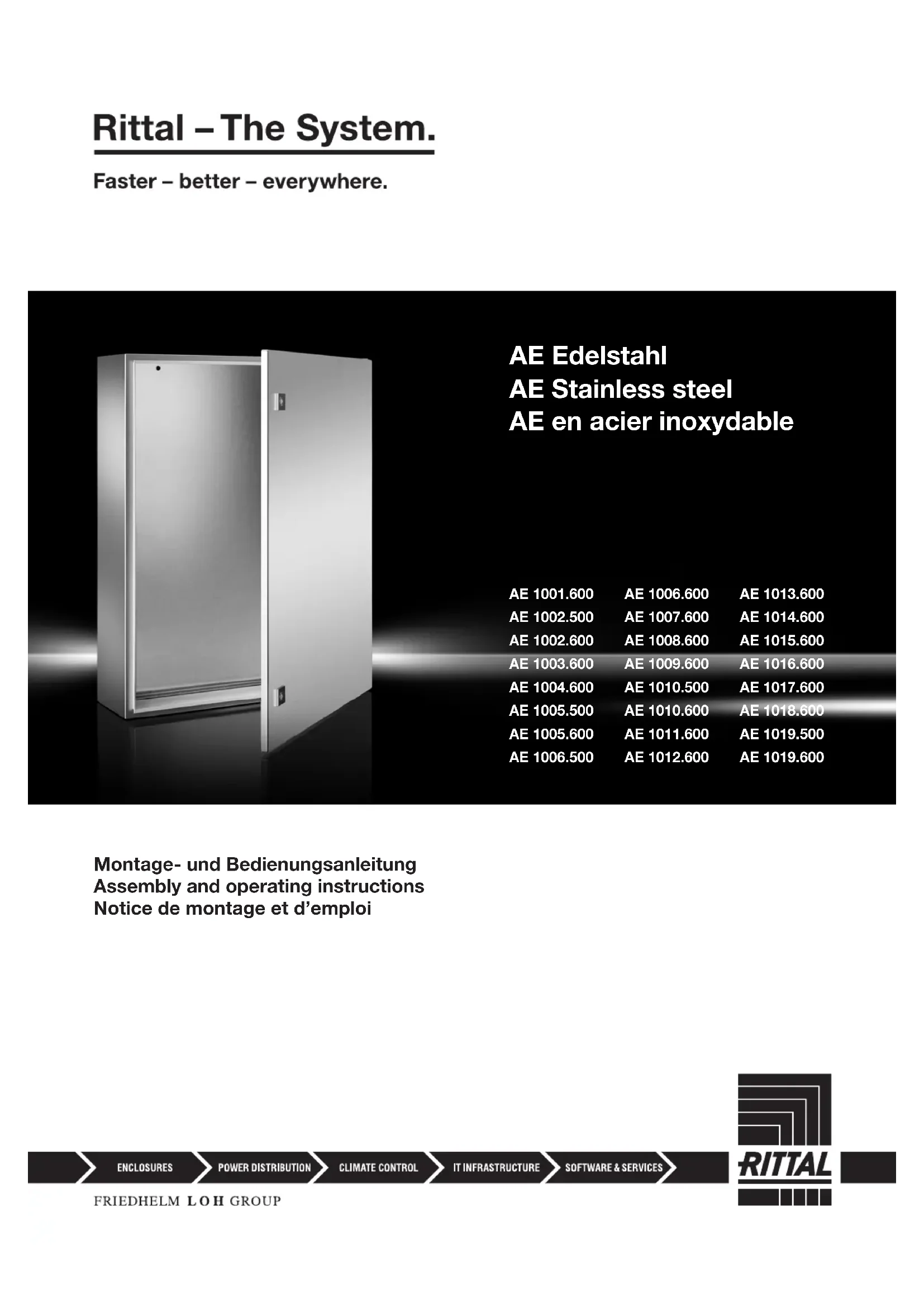 Because the Rittal AE stainless steel compact enclosur e conforms t o many technical regulations, the enclosure is suitable for the widest-range of markets and application areas. A current overview for the product is available at www.rittal.com. La notice de montage s’adresse à toutes les personnes qui possèdent les compé- tences professionnelles correspondantes, pour équiper les co rets électriques avec du matériel électrique, électronique, mécanique ou pneumatique dans le respect des normes, pour les installer ou les monter sur le lieu d’exploitation et pour les raccorder pour leur exploitation. La notice d’utilisation s’adresse au personnel d’exploitation et aux spécialistes formés en conséquence pour la maintenance électrotechnique et mécanique.