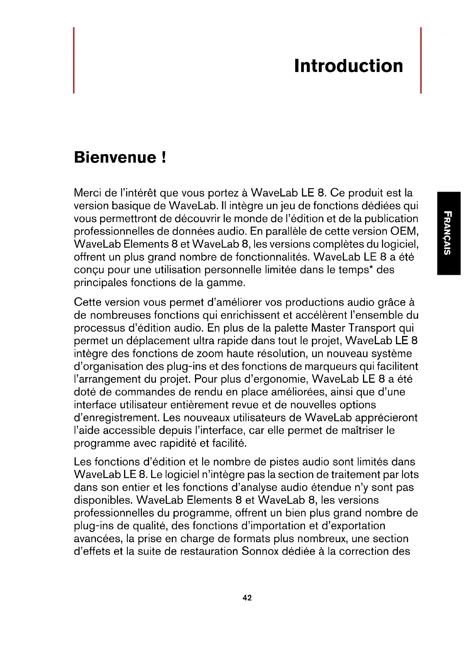 nombreuses fonctions qui enrichissent et accélèrent l’ensemble du processus d’édition audio. En plus de la palette Master Transport qui permet un déplacement ultra rapide dans tout le projet, WaveLab LE 8 intègre des fonctions de zoom haute résolution, un nouveau système d’organisation des plug-ins et des fonctions de marqueurs qui facilitent l’arrangement du projet. Pour plus d’ergonomie, WaveLab LE 8 a été doté de commandes de rendu en place améliorées, ainsi que d’une interface utilisateur entièrement revue et de nouvelles options d’enregistrement. Les nouveaux utilisateurs de WaveLab apprécieront l’aide accessible depuis l’interface, car elle permet de maîtriser le programme avec rapidité et facilité. Les fonctions d’édition et le nombre de pistes audio sont limités dans WaveLab LE 8. Le logiciel n’intègre pas la section de traitement par lots dans son entier et les fonctions d’analyse audio étendue n’y sont pas disponibles. WaveLab Elements 8 et WaveLab 8, les versions professionnelles du programme, offrent un bien plus grand nombre de plug-ins de qualité, des fonctions d’importation et d’exportation avancées, la prise en charge de formats plus nombreux, une section d’effets et la suite de restauration Sonnox dédiée à la correction desIntroduction Bienvenue !