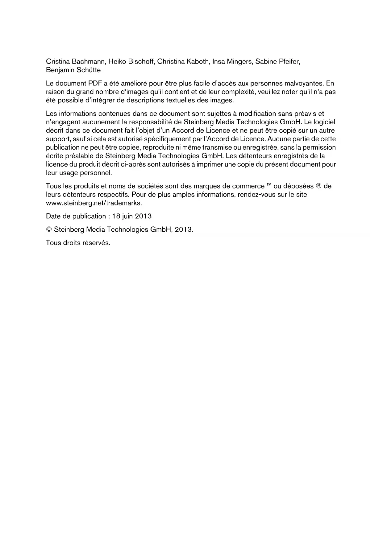 Mode d’EmploiCristina Bachmann, Heiko Bischoff, Christina Kaboth, Insa Mingers, Sabine Pfeifer, Benjamin Schütte Le document PDF a été amélioré pour être plus facile d’accès aux personnes malvoyantes. En raison du grand nombre d’images qu’il contient et de leur complexité, veuillez noter qu’il n’a pas été possible d’intégrer de descriptions textuelles des images. Les informations contenues dans ce document sont sujettes à modification sans préavis et n’engagent aucunement la responsabilité de Steinberg Media Technologies GmbH. Le logiciel décrit dans ce document fait l’objet d’un Accord de Licence et ne peut être copié sur un autre support, sauf si cela est autorisé spécifiquement par l’Accord de Licence. Aucune partie de cette publication ne peut être copiée, reproduite ni même transmise ou enregistrée, sans la permission écrite préalable de Steinberg Media Technologies GmbH. Les détenteurs enregistrés de la licence du produit décrit ci-après sont autorisés à imprimer une copie du présent document pour leur usage personnel. Tous les produits et noms de sociétés sont des marques de commerce ™ ou déposées ® de leurs détenteurs respectifs. Pour de plus amples informations, rendez-vous sur le site www.steinberg.net/trademarks. Date de publication : 18 juin 2013 © Steinberg Media Technologies GmbH, 2013. Tous droits réservés.3 Table des Matières 6 Introduction 6 Système d'aide 8 À propos des versions du programme 8 Conventions typographiques 9 Comment nous contacter 10 Configuration du système 10 Connexion des dispositifs audio 10 À propos des cartes son et de lecture en arrière-plan 11 À propos de la latence 11 Définition des connexions audio VST 15 Enregistreurs de CD/DVD 15 Télécontrôles 22 Concepts de WaveLab Elements 22 Règles générales d'édition 23 Gestion des fenêtres de base 26 Sélection de l'audio 30 Curseurs 31 Renommage des éléments au sein des tables 31 Navigateur de fichiers 33 Groupes d'onglet 34 Fichiers de crêtes 35 Fichiers compagnon 36 Vue globale du programme 36 Barres de commandes 37 Barre d’état 39 Menus contextuels 39 Règle temporelle et Règle de niveau 45 Édition de valeur 45 Actions de déplacement 48 Annulation et rétablissement 48 Zoom 56 Gestion des onglets 57 Préréglages 60 Enregistrement d’une image de la fenêtre active 62 Opérations relatives aux fichiers 62 Fichiers récemment utilisés 63 Enregistrer et Enregistrer Sous 66 Modèles 70 Renommage de fichiers 71 Suppression des fichiers 72 Menu Spécial 73 Fichiers temporaires 73 Dossiers de travail/Dossiers de documents 75 Focalisation sur le fichier actif 76 À propos des espaces de travail 77 Éléments d'un espace de travail 77 Espace de travail Fichiers Audio 78 Espace de travail Montage Audio 78 Espace de travail Podcast 78 Ouverture des fichiers dans un espace de travail 79 Organisation des fenêtres d'espace de travail 80 À propos des fenêtres-outils 84 Lecture 84 Barre de transport 100 Lecture d’un seul canal 100 Démarrage de la lecture depuis la règle 101 Utilisation de l’outil Lecture 102 Lecture de Scrutation 103 Défilement pendant la lecture 104 À propos de la lecture dans l’espace de travail Montage Audio4 105 Édition des fichiers audio 105 Fenêtre d'onde 109 Gestion des fichiers dans l'espace de travail Fichiers Audio 133 Modification des propriétés audio 135 Métadonnées 138 Boîte de dialogue Générateur de silence 140 Restauration de formes d'onde avec l'outil Crayon 141 Analyse audio 141 Analyse Globale 152 Analyse des fréquences en 3D 155 Traitement hors ligne 155 Application d'un traitement 156 Boîte de dialogue Gain 156 Boîte de dialogue Normaliser le niveau 158 Fondus dans les fichiers audio 159 Fondus enchaînés 161 Inversion de la phase audio 161 Inversion de contenu audio 162 Décalage CC 163 Étirement temporel 165 Transposition de Hauteur 167 Rééchantillonner 168 Montage audio 168 Terminologie de base 169 Fenêtre de montage 171 Flux des signaux dans le montage audio 172 Création d'un montage audio 173 Créer un Montage Audio depuis un Fichier Audio 174 Options d'importation des montages audio 174 Boîte de dialogue Fichiers manquants dans Montage Audio 175 Assemblage du montage audio 182 Réorganisation des clips 184 Édition de clips 194 Indicateur d'activité de piste 194 Enveloppe des clips 200 Fondus et fondus enchaînés dans le montage audio 204 Effets pour les pistes, les clips et la sortie maître 216 À propos de la fenêtre CD 219 À propos du clonage de montages audio 220 Mixage et fonction de rendu 220 Méta-Normaliseur de Sonie 223 Fenêtre Notes 224 Enregistrement 224 Configuration de la boîte de dialogue Enregistrement 225 Insertion de marqueurs pendant l’enregistrement 226 Boîte de dialogue Enregistrement 233 Section Maître 234 Fenêtre Section Maître 246 Rendu 251 Sauvegarde d'un préréglage de la section maître 256 À propos du monitoring de tâches d'arrière-plan 256 À propos des microcoupures5 257 Marqueurs 257 Types de Marqueur 258 Fenêtre Marqueurs 261 À propos de la création de marqueurs 264 Suppression de marqueurs 265 Déplacement de marqueurs 265 Parcourir les marqueurs 266 Masquage de marqueurs d'un certain type 266 Renommage de marqueurs 267 À propos de la sélection de marqueurs 267 Sélection de l'audio entre des marqueurs 268 Liaison de clips au montage audio 269 Stockage des informations de marqueur 270 Utilisation des vumètres 270 Fenêtre des vumètres 271 À propos des réglages des vumètres 271 Réinitialisation des vumètres 272 Niveaumètre 274 Spectroscope 275 Oscilloscope 276 Opérations d'écriture 276 Boîte de dialogue Écrire un CD audio 278 Boîte de dialogue Effacer le support optique 279 À propos de l'écriture des montages audio 282 Projets CD/DVD de données 286 À propos des formats de CD audio 291 Boucles 291 Mise en boucle de base 293 À propos de l'affinage des boucles 303 À propos de la mise e