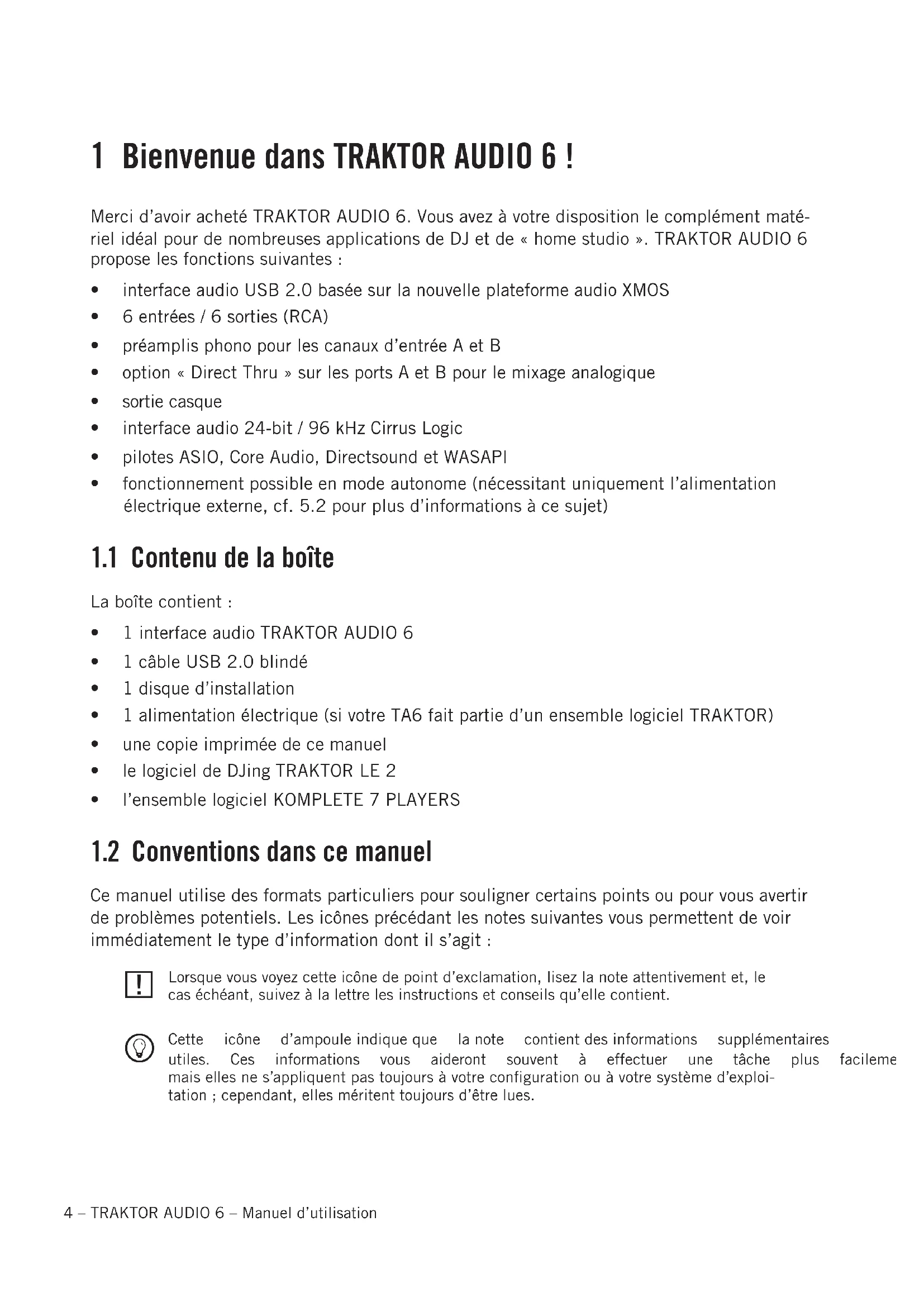 Cette icône d’ampouleindiqueque lanote contientdesinformations supplémentaires utiles. Ces informations vous aideront souvent à effectuer une tâche plus facilement, maisellesnes’appliquentpastoujoursàvotrecongurationouàvotresystèmed’exploi- tation;cependant,ellesméritenttoujoursd’êtrelues.TRAKTORAUDIO6–Manueld’utilisation–5 FRANÇAISE Deplus,lesformatssuivantssontutilisés: