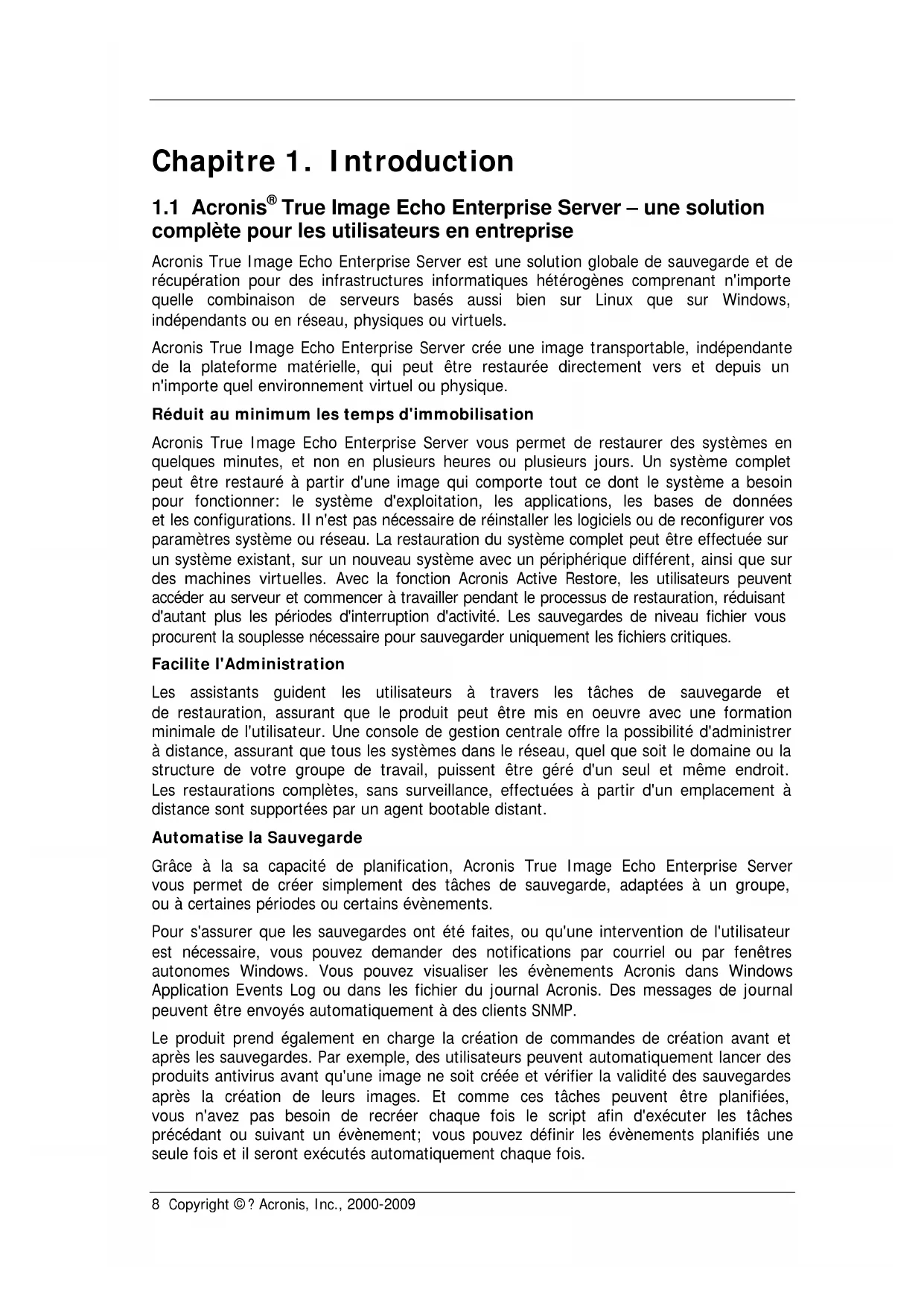 True Image Echo Enterprise Server2 Copyright ©? Acronis, Inc., 2000-2009 Copyright ©? Acronis, Inc., 2000-2009. Tous droits réservés. “Acronis” et “Acronis Secure Zone” sont des marques déposées d'Acronis, Inc. “Acronis Compute with Confidence”, “Acronis Startup Recovery Manager”, “Acronis Active Restore” et le logo Acronis sont des marques déposées d'Acronis, Inc. Linux est une marque déposée de Linus Torvalds. Windows et MS-DOS sont des marques déposées de Microsoft Corporation. Toutes les autres marques ou autres droits d'auteurs s'y référant sont la propriété de leurs propriétaires respectifs. La distribution de versions de ce document dont le contenu aurait été modifié est interdite sans la permission explicite du détenteur des droits d'auteur. La distribution de ce travail ou d'une variante sous forme imprimée (papier) standard à des fins commerciales est interdite à moins que l'on ait obtenue des autorisations de la part du détenteur des droits d'auteur. LA DOCUMENTATION EST FOURNIE «EN L'ETAT» ET TOUTES CONDITIONS, REPRESENTATIONS ET GARANTIES, IMPLICITES OU EXPLICITES, Y COMPRIS LES GARANTIES IMPLICITES DE COMMERCIALISATION, D'APTITUDE A UNE UTILISATION PARTICULIERE OU D'ABSCENCE DE CONTREFACON, SONT INTERDITES, SOUS RESERVE QUE CES INTERDICTIONS NE SOIENT PAS LEGALEMENT RENDUES COMME NULLES.Copyright ©? Acronis, Inc., 2000-2009 3 Table des Matières