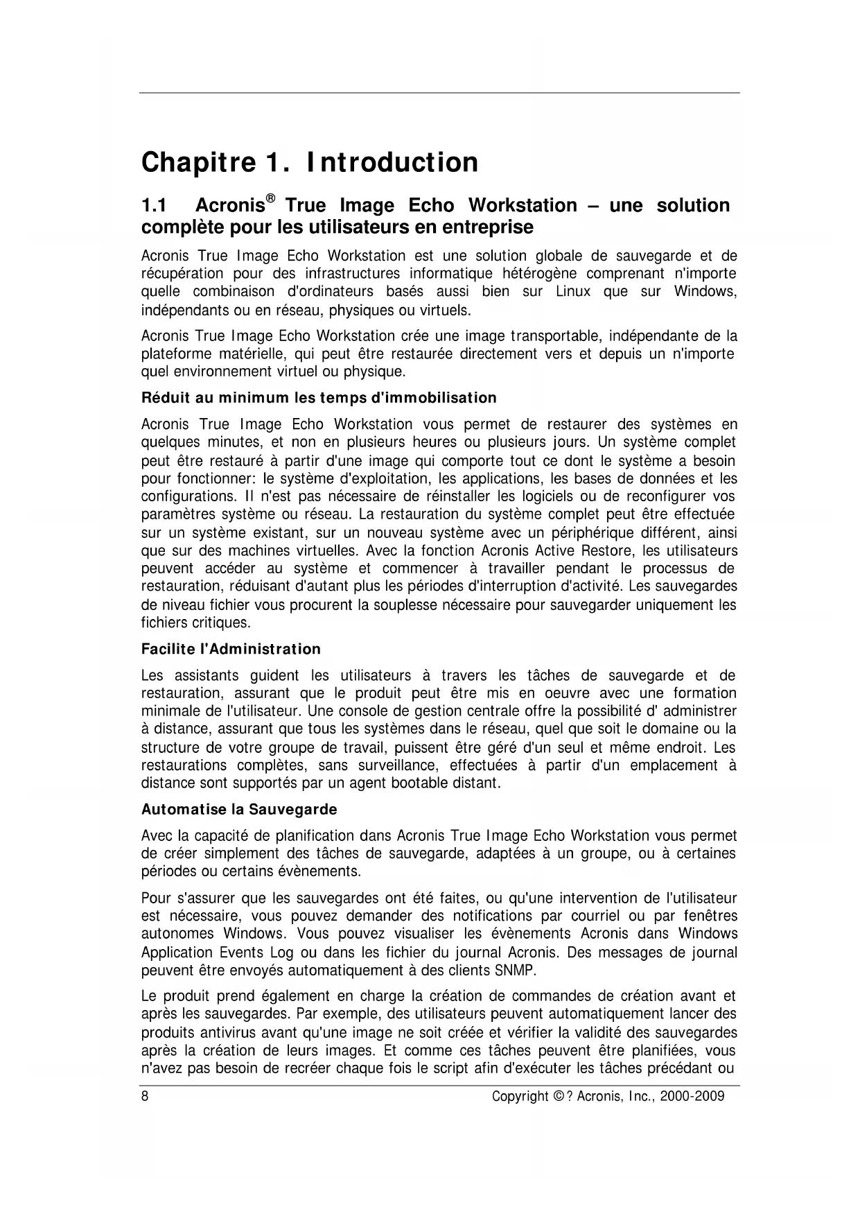 True Image Echo Workstation2 Copyright ©? Acronis, Inc., 2000-2009 Copyright ©? Acronis, Inc., 2000-2009. Tous droits réservés. “Acronis” et “Acronis Secure Zone” sont des marques déposées d'Acronis, Inc. “Acronis Compute with Confidence”, “Acronis Startup Recovery Manager”, “Acronis Active Restore” et le logo Acronis sont des marques déposées d'Acronis, Inc. Linux est une marque déposée de Linus Torvalds. Windows et MS-DOS sont des marques déposées de Microsoft Corporation. Toutes les autres marques ou autres droits d'auteurs s'y référant sont la propriété de leurs propriétaires respectifs. La distribution de versions de ce document dont le contenu aurait été modifié est interdite sans la permission explicite du détenteur des droits d'auteur. La distribution de ce travail ou d'une variante sous forme imprimée (papier) standard à des fins commerciales est interdite à moins que l'on ait obtenue des autorisations de la part du détenteur des droits d'auteur. LA DOCUMENTATION EST FOURNIE «EN L'ETAT» ET TOUTES CONDITIONS, REPRESENTATIONS ET GARANTIES, IMPLICITES OU EXPLICITES, Y COMPRIS LES GARANTIES IMPLICITES DE COMMERCIALISATION, D'APTITUDE A UNE UTILISATION PARTICULIERE OU D'ABSCENCE DE CONTREFACON, SONT INTERDITES, SOUS RESERVE QUE CES INTERDICTIONS NE SOIENT PAS LEGALEMENT RENDUES COMME NULLES.Copyright ©? Acronis, Inc., 2000-2009 3 Table des Matières