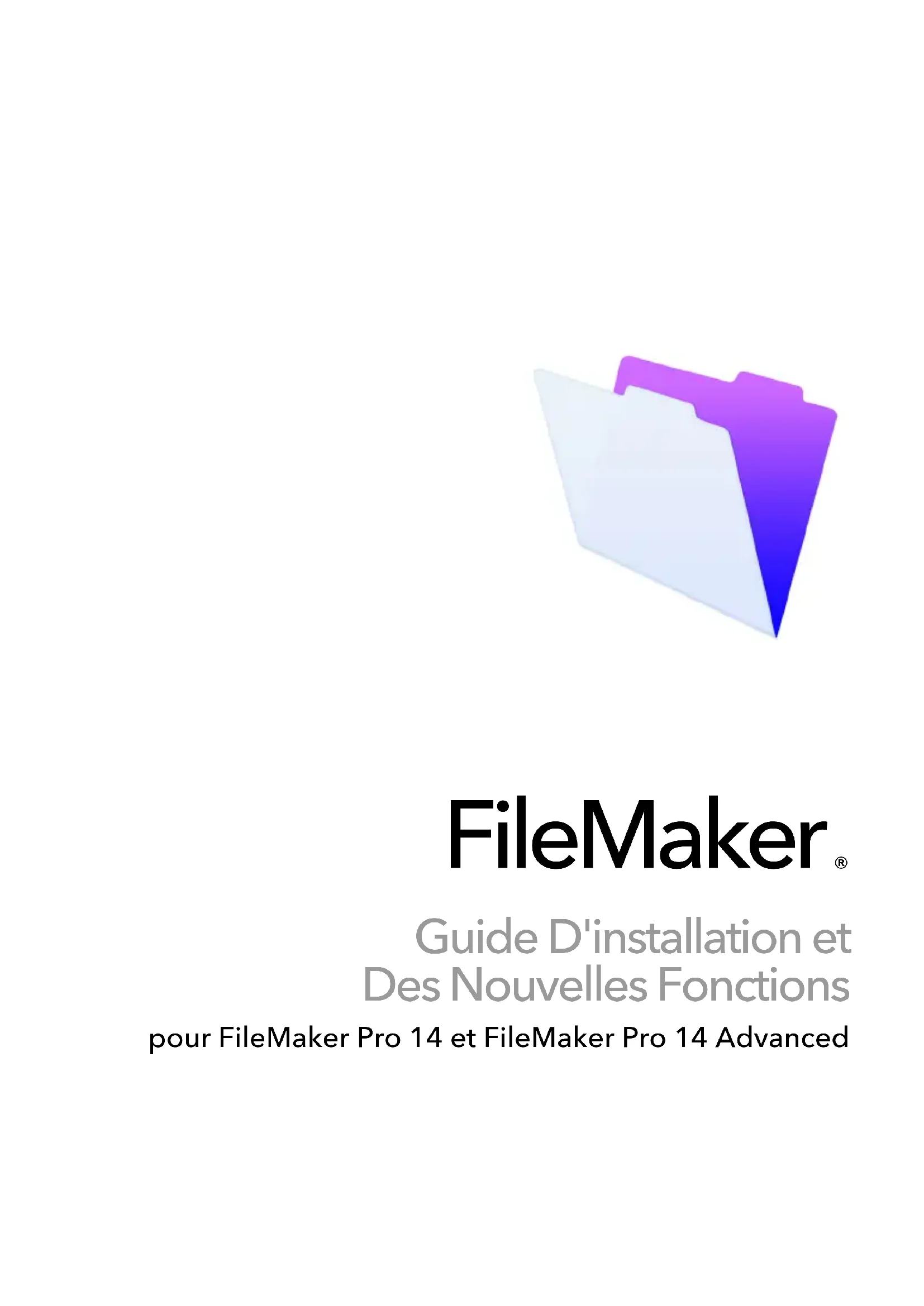 Guide D'installation et Des Nouvelles Fonctions pour FileMaker Pro 14 et FileMaker Pro 14 Advanced© 2007-2015 FileMaker, Inc. Tous droits réservés. FileMaker, Inc. 5201 Patrick Henry Drive Santa Clara, Californie 95054 FileMaker et FileMaker Go sont des marques commerciales de FileMaker, Inc. déposées aux États- Unis et dans d'autres pays. Le logo en forme de dossier et FileMaker WebDirect sont des marques de FileMaker, Inc. Toutes les autres marques sont la propriété de leurs détenteurs respectifs. La documentation de FileMaker est protégée par la législation sur les droits d'auteur. Vous n'êtes pas autorisé à créer des copies supplémentaires ni à distribuer cette documentation sans l'accord écrit de FileMaker. Vous devez posséder une copie sous licence valide de FileMaker pour utiliser cette documentation. Toutes les personnes, sociétés, adresses email et URL citées dans les exemples sont fictives et toute ressemblance avec des personnes, des sociétés, des adresses email ou des URL existantes ne serait que pure coïncidence. La liste des auteurs est disponible dans les documents Remerciements fournis avec ce logiciel. Les produits tiers et les adresses URL sont mentionnés à titre indicatif uniquement, et non pas à titre de recommandation. FileMaker, Inc. se dégage de toute responsabilité concernant les performances de ces produits. Pour plus d'informations, consultez notre site Web à l'adresse suivante : http://www.filemaker.fr. Edition : 01Table des matières