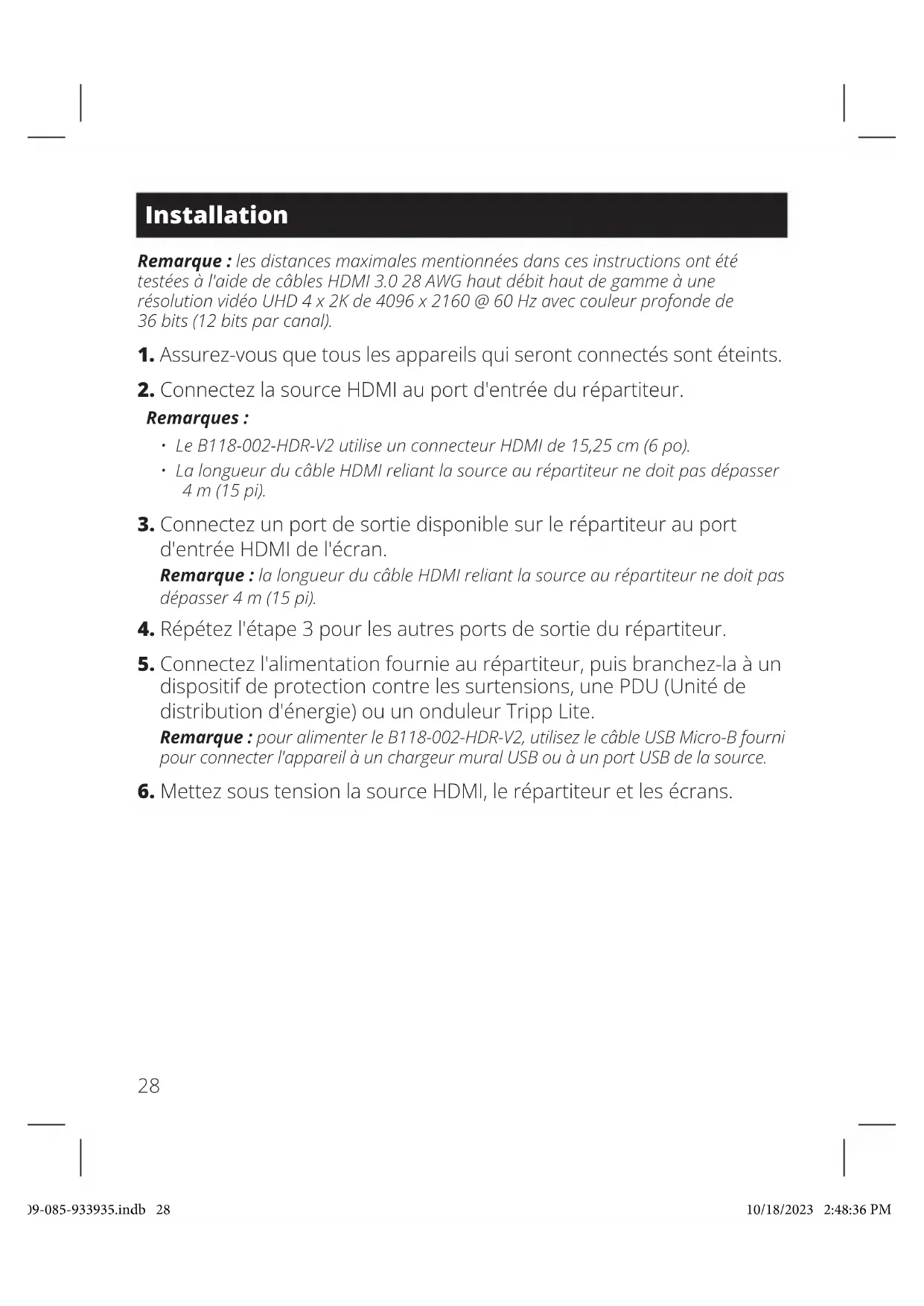 - CâbleHDMIhautdegammehautevitesseP569-015-CERT- 4,6m(15pi) Accessoires disponibles en option 23-09-085-933935.indb 2723-09-085-933935.indb 27 10/18/2023 2:48:35 PM10/18/2023 2:48:35 PM28 Installation Remarque : les distances maximales mentionnées dans ces instructions ont été testées à l'aide de câbles HDMI 3.0 28 AWG haut débit haut de gamme à une résolution vidéo UHD 4 x 2K de 4096 x 2160 @ 60 Hz avec couleur profonde de 36bits (12 bits par canal). 1.Assurez-vousquetouslesappareilsquiserontconnectéssontéteints. 2.ConnectezlasourceHDMIauportd'entréedurépartiteur. Remarques :