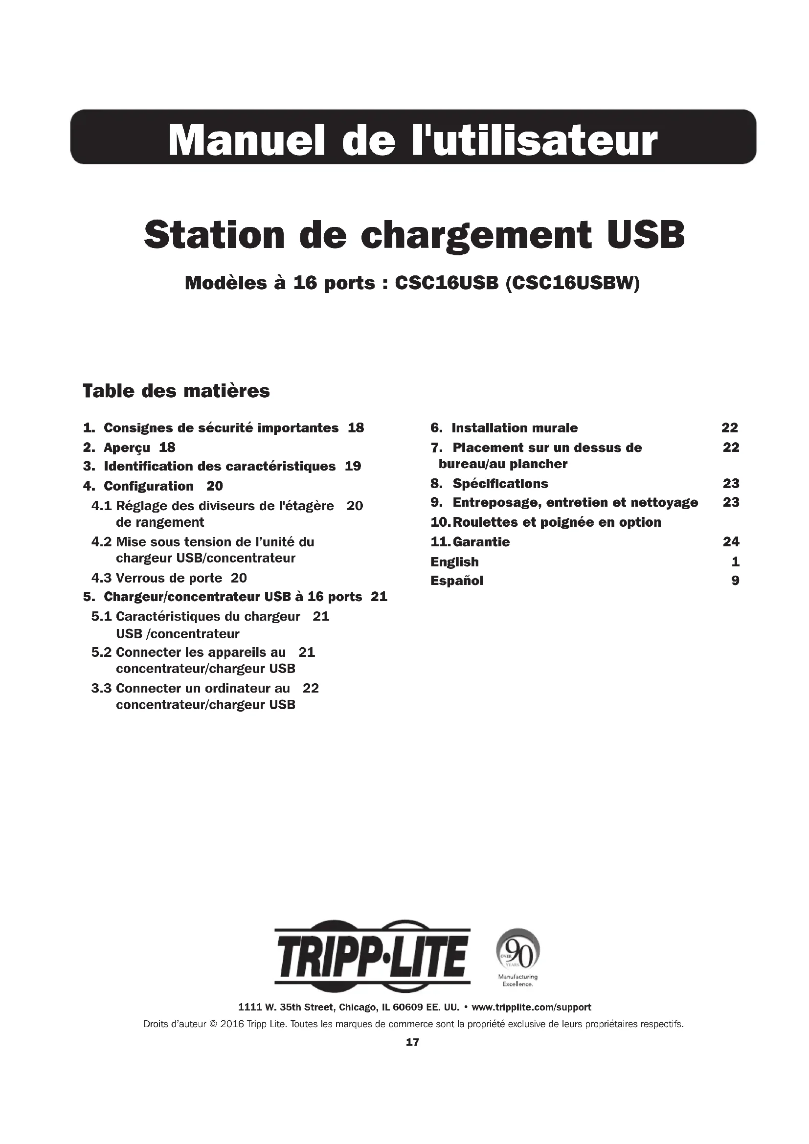 English 1 Español 9 Station de chargement USB Modèles à 16 ports : CSC16USB (CSC16USBW) Manuel de l'utilisateur18