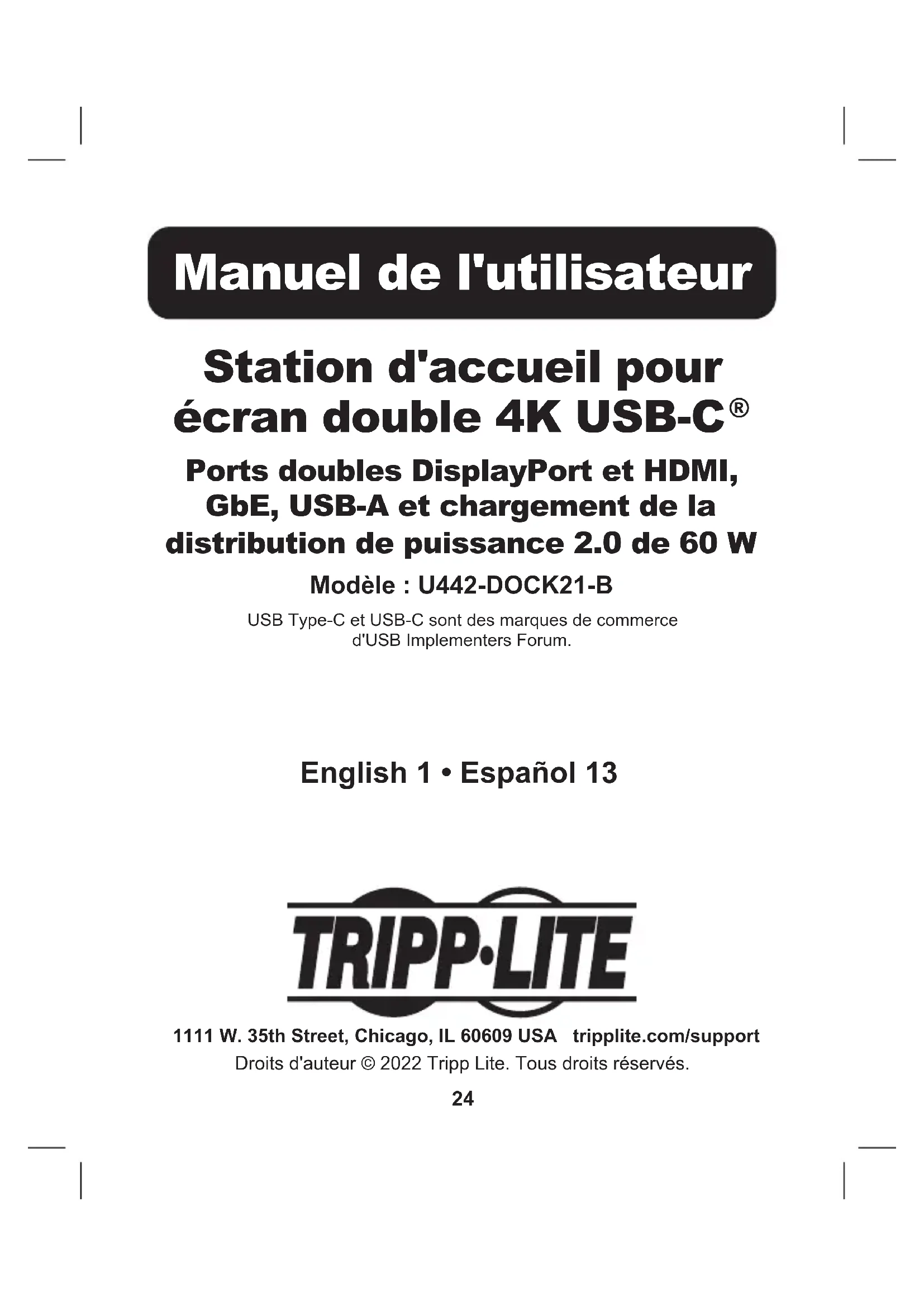 U442DOCK21B - Station d'acceuil Tripp Lite - Notice d'utilisation et mode d'emploi gratuit
