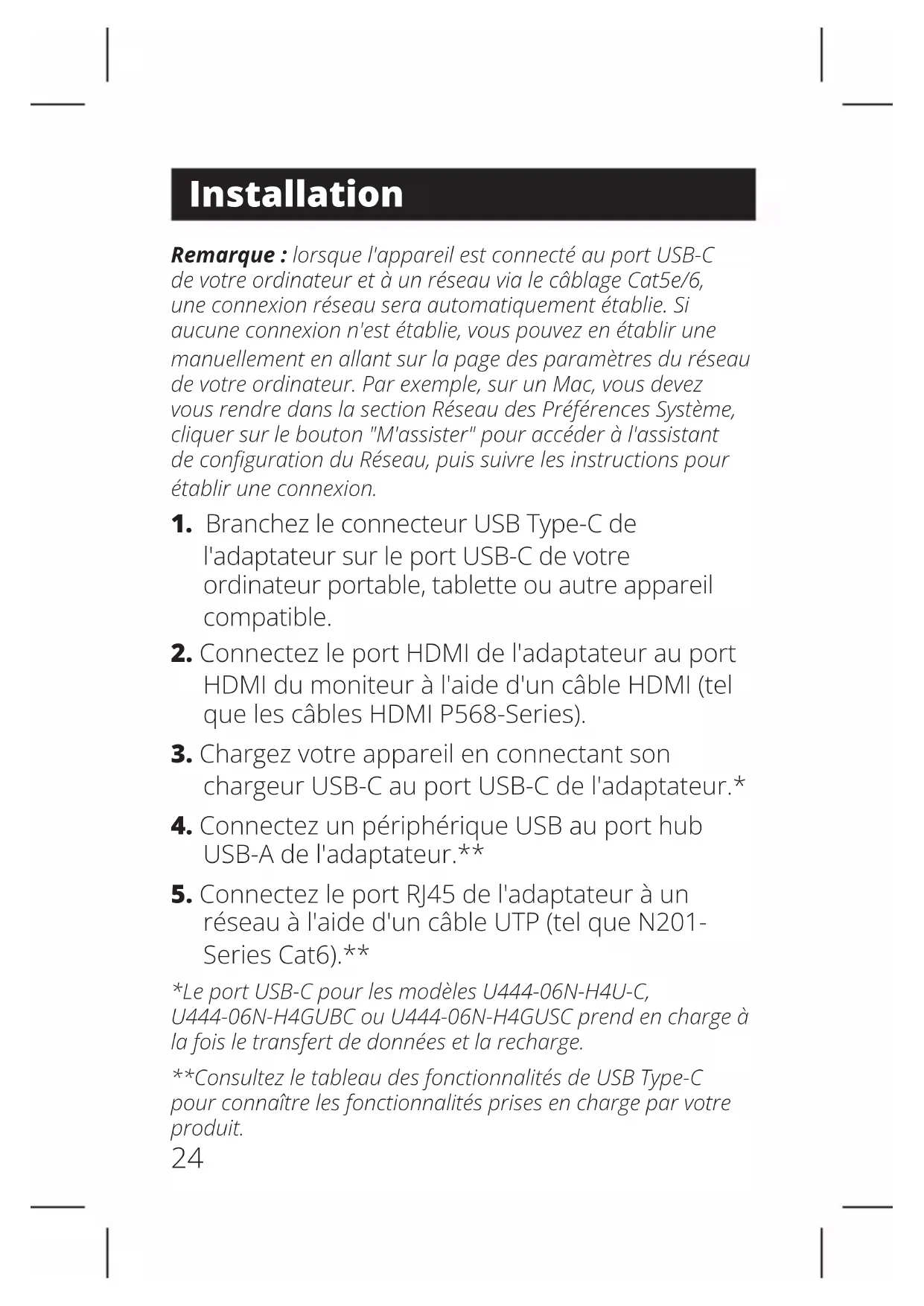 - Plug and Play; aucun logiciel ou pilote nécessaire *U444-06N-H4GUSC prend en charge la charge PD jusqu'à 20 V 5 A (100 W)23 Caractéristiques du produit Caractéristiques USB Type-C Prise en charge de la vidéo HDR