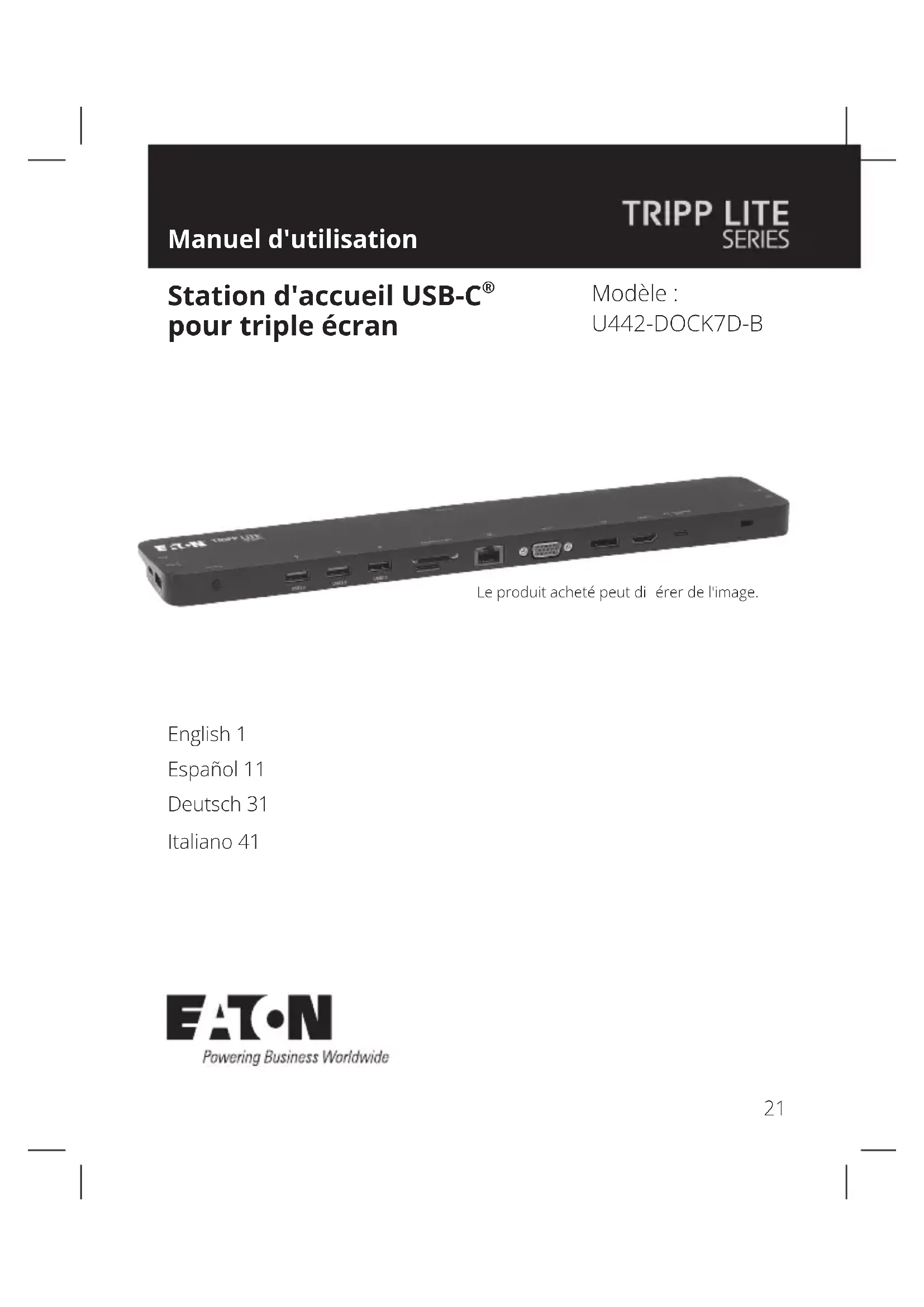 (en option). Installation28 Connecteur d'entrée USB-C USB Type-C, Femelle Connecteur(s) de sortie USB-A USB 3.2, Femelle (x3), USB 2.0, Femelle (x2) USB-C USB-C données uniquement, Femelle USB-C PD charge uniquement, Femelle Ethernet RJ45, Femelle VGA VGA, Femelle HDMI HDMI, Femelle DisplayPort DisplayPort, Femelle Audio 3,5 mm, Femelle Cartes mémoire SD, Micro SD Environnement Température de fonctionnement 0 à 45 °C (32 à 113 °F) Taux d'humidité en fonctionnement De 10 % à 85 % d'humidité relative, sans condensation Température de stockage -10 à 70 °C (14 à 158 °F) Humidité de stockage De 5 % à 90 % d'humidité relative, sans condensation Caractéristiques29 Mécanique Dimensions de l'appareil [H x L x P] 18,1 x 348 x 74 mm (0,71 x 13,76 x 2,91 pouces) Poids de l'unité 0,25 kg (0,55 lb.) Caractéristiques Caractéristiques HDMI 1.4 Caractéristiques HDCP 1.4 Spécication DisplayPort 1.2 Résolution(s) vidéo maximale(s) prise(s) en charge HDMI (4096 x 2160 à 30 Hz), DisplayPort (4096 x 2160 à 30 Hz), VGA (1920 x 1200 à 60 Hz) Vitesse réseau 10/100/1000 Mbit/s ou 1 Gbit/s Profondeur de couleur (HDMI) 36 bit (12 bits par canal) Sous-échantillonnage de la chrominance (HDMI) YCbCr: 4:4:4, 4:2:2, 4:2:0 et RVB: 4:4:4 Spécications audio Son surround 7.1 canaux LPCM Spécication de charge PD PD 3.0 (100 W) Caractéristiques30 Garantie limitée de 3ans Nous garantissons que nos produits sont exempts de défauts de matériaux et de fabrication pendant une période de trois (3) ans à compter de la date d'achat initial Notre obligation en vertu de cette garantie est limitée à la réparation ou au remplacement (à sa seule discrétion) de tout produit défectueux. Veuillez consulter le site Tripplite.Eaton.com/support/product-returns avant d'envoyer un produit pour le faire réparer. Cette garantie ne s'applique pas aux équipements qui ont été endommagés par accident, négligence ou par une mauvaise utilisation, ni à ceux qui ont été altérés ou modiés d'une façon quelconque. SAUF INDICATION CONTRAIRE DANS LE PRÉSENT DOCUMENT, NOUS N'OFFRONS AUCUNE GARANTIE, EXPRESSE OU IMPLICITE, Y COMPRIS LES GARANTIES DE QUALITÉ MARCHANDE ET D'ADÉQUATION À UN USAGE PARTICULIER. Certains états n'autorisent pas la limitation ou l'exclusion des garanties implicites ; par conséquent, les limitations ou exclusions susmentionnées peuvent ne pas s'appliquer à l'acheteur. SAUF INDICATION CI-DESSUS, NOUS NE SERONS EN AUCUN CAS RESPONSABLES DES DOMMAGES DIRECTS, INDIRECTS, SPÉCIAUX, ACCIDENTELS OU CONSÉCUTIFS RÉSULTANT DE L'UTILISATION DE CE PRODUIT, MÊME SI AVISÉS DE LA POSSIBILITÉ DE TELS DOMMAGES. Plus précisément, nous ne sommes pas responsables de tout coût, tel que les pertes de prots ou de revenus, la perte d'équipement, la perte d'utilisation d'équipement, la perte de logiciels, la perte de données, les coûts de remplacement, les réclamations de tiers, ou autrement. Informations sur la conformité DEEE pour les clients et les recycleurs (Union européenne) En vertu de la directive sur les déchets d'équipements électriques et électroniques (DEEE) et des règlements d'application, lorsqu'un consommateur achète un équipement électrique ou électronique neuf auprès de Tripp Lite, il est habilité à :