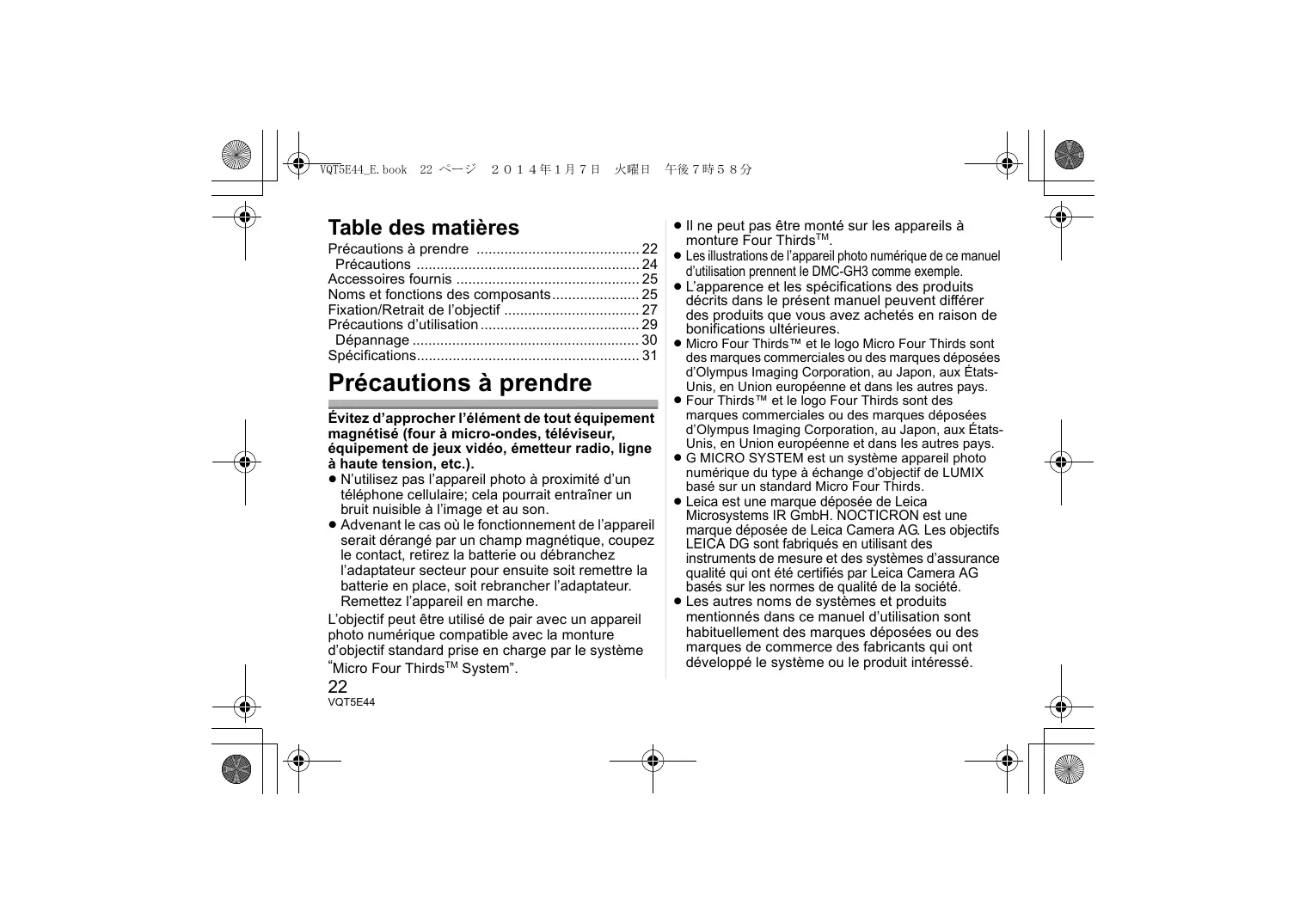 Table des matières Précautions à prendre 22 Précautions 24 Accessoires fournis 25 Noms et fonctions des composants 25 Fixation/Retrait de l’objectif 27 Précautions d’utilisation 29 Dépannage 30 Spécifications 31