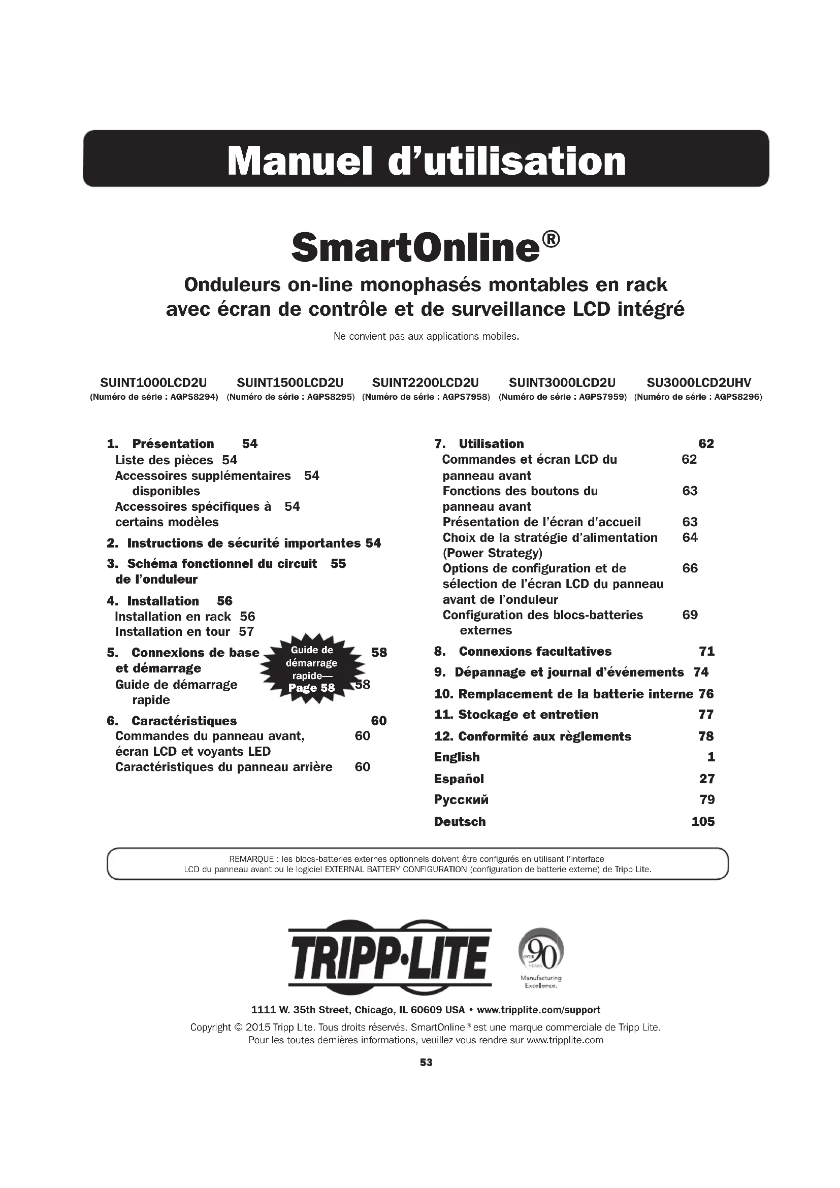 English 1 Español 27 Русский 79 Deutsch 105 REMARQUE : les blocs-batteries externes optionnels doivent être configurés en utilisant l’interface LCD du panneau avant ou le logiciel EXTERNAL BATTERY CONFIGURATION (configuration de batterie externe) de Tripp Lite. 1111 W. 35th Street, Chicago, IL 60609 USA • www.tripplite.com/support Copyright © 2015 Tripp Lite. Tous droits réservés. SmartOnline est une marque commerciale de Tripp Lite. Pour les toutes dernières informations, veuillez vous rendre sur www.tripplite.comOwner’s ManualOwner’s Manual