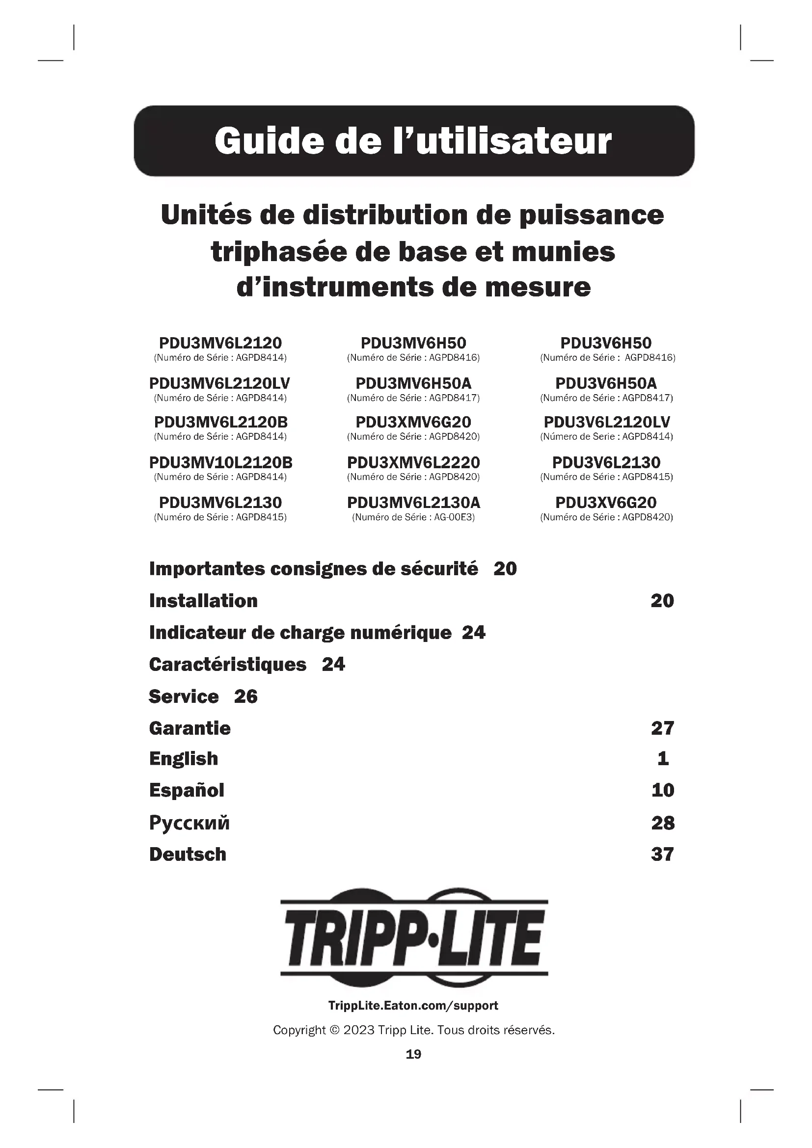 Caractéristiques Prises de courant : Lors d’un fonctionnement normal, les prises distribuent du courant CA à l’équipement connecté. Disjoncteur (Sélectionnez les modèles) : Chaque phase possède son propre disjoncteur. Si l’équipement alimenté excède la valeur nominale maximale de charge pour cette phase de l’unité de distribution de puissance, le disjoncteur se déclenchera. Débranchez l’équipement excessif et permettez au disjoncteur de se refroidir avant de le réinitialiser. Courant d’entrée (ampères) : Le courant total (en A) tiré par chacune des phases de l’unité de distribution de puissance (PDU) sera afché de manière indépendante par un des 3 ampèremètres numériques. Courant de charge (ampères) : Le courant total (en A) tiré par les charges de chaque phase sera afché de manière indépendante par un des 3 ampèremètres numériques. Indicateur de charge numérique (certains modèles seulement)25 Caractéristiques Brides de retenue de cordon : Offre des points d’attache solides pour les cordons de l’équipement connecté. Supports de xation : Utilisez ces supports pour monter l’unité de distribution de puissance dans des bâtis qui ne sont pas compatibles avec les méthodes de montage par boutons sans outil. Boutons de montage : Sont livrés déjà installés à l’arrière de l’unité de distribution de puissance (PDU) et sont utilisés pour le montage sans outil. Remarque : Quatre boutons de montage additionnels sont inclus pour les bâtis de styles différents. Accessoire de montage PDUMVROTATEBRKT : Utilisez ces supports en V pour monter l’unité de distribution de puissance (PDU) pour que ses sorties soient orientées vers l’arrière du bâti. Vis de mise à la terre : Utilisez cette vis pour brancher n’importe quel équipement nécessitant une mise à terre au châssis. Manchons de che C14 : (facultatif) Utiliser les manchons en plastique C14 inclus pour retenir les ches aux prises de courant. Fixer le manchon à la che en s’assurant que les languettes de préhension demeurent à l’extérieur de la che et qu’il repose solidement en place. Pour débrancher correctement l’équipement, utiliser les languettes de préhension pour retirer la che et le manchon de la prise de courant. Manchon de che C20 : (facultatif) Utiliser les manchons en plastique C20 inclus pour retenir les ches aux prises de courant. Fixer le manchon à la che en s’assurant que les languettes de préhension demeurent à l’extérieur de la che et qu’il repose solidement en place. Pour débrancher correctement l’équipement, utiliser les languettes de préhension pour retirer la che et le manchon de la prise de courant.26 Service Votre produit Tripp Lite est couvert par la garantie décrite dans ce manuel. Une gamme de programmes de garantie étendue et de service sur le site est également disponible chez Tripp Lite. Pour de plus amples informations sur le service, visitez tripplite.com/support. Avant de retourner votre produit pour entretien, procédez comme suit: