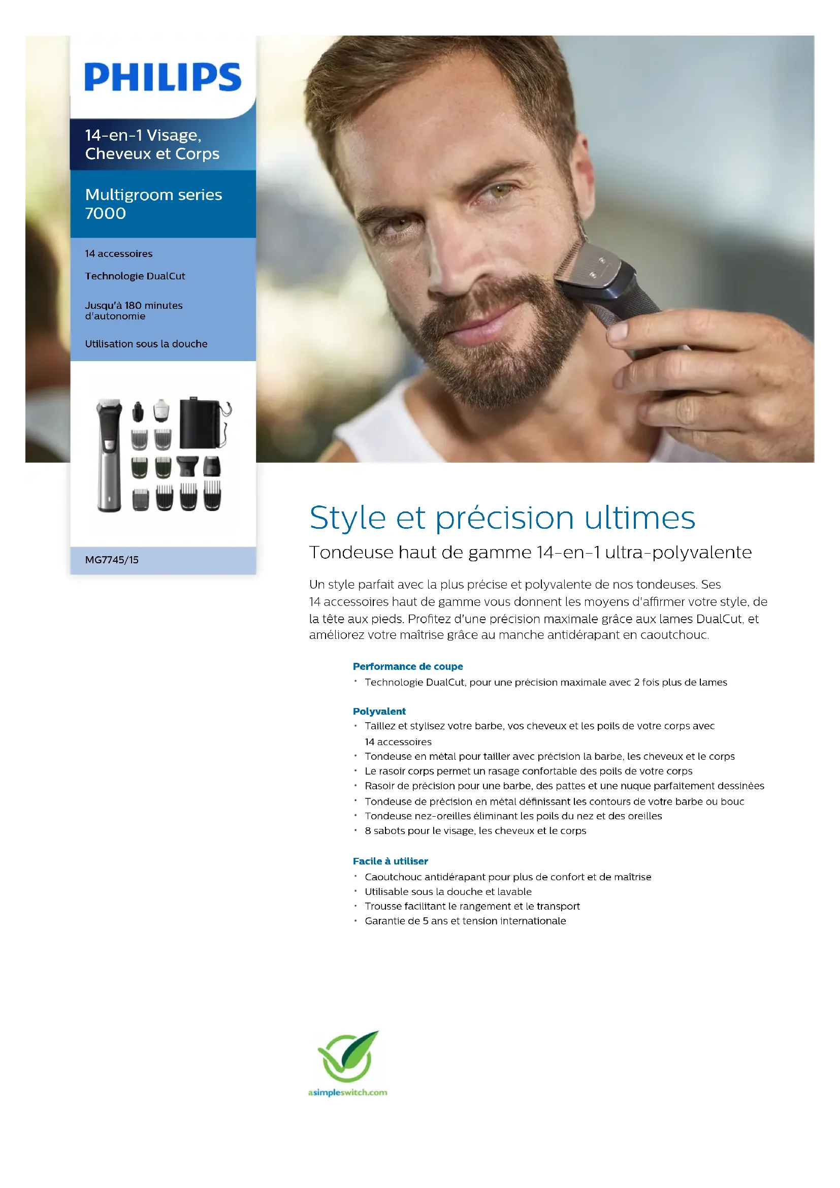 14 accessoires Technologie DualCut Jusqu'à 180 minutes d'autonomie Utilisation sous la douche MG7745/15 Style et précision ultimes Tondeuse haut de gamme 14-en-1 ultra-polyvalente Un style parfait avec la plus précise et polyvalente de nos tondeuses. Ses 14 accessoires haut de gamme vous donnent les moyens d'affirmer votre style, de la tête aux pieds. Profitez d'une précision maximale grâce aux lames DualCut, et améliorez votre maîtrise grâce au manche antidérapant en caoutchouc. Performance de coupe Technologie DualCut, pour une précision maximale avec 2 fois plus de lames Polyvalent Taillez et stylisez votre barbe, vos cheveux et les poils de votre corps avec 14 accessoires Tondeuse en métal pour tailler avec précision la barbe, les cheveux et le corps Le rasoir corps permet un rasage confortable des poils de votre corps Rasoir de précision pour une barbe, des pattes et une nuque parfaitement dessinées Tondeuse de précision en métal définissant les contours de votre barbe ou bouc Tondeuse nez-oreilles éliminant les poils du nez et des oreilles 8 sabots pour le visage, les cheveux et le corps Facile à utiliser Caoutchouc antidérapant pour plus de confort et de maîtrise Utilisable sous la douche et lavable Trousse facilitant le rangement et le transport Garantie de 5 ans et tension internationale14-en-1 Visage, Cheveux et Corps MG7745/15 Points forts Technologie DualCut Profitez d'une précision optimale avec la technologie DualCut comprenant 2 fois plus de lames. En se frottant légèrement l'une contre l'autre, les lames en inox s'auto-affûtent pendant qu'elles coupent, ce qui leur permet de rester aiguisées comme au premier jour même après 5 ans d'utilisation. 14 accessoires pour le visage, les cheveux et le corps Cette tondeuse tout-en-un très pratique taille et stylise votre barbe, coupe vos cheveux et entretient les poils de votre corps. Tondeuse en métal Utilisez la tondeuse en métal avec technologie DualCut sans sabot pour obtenir une barbe, une nuque et une coiffure aux contours nets et précis, ou pour tailler les poils de votre corps au plus près. Rasoir corps avec accessoire de protection Notre rasoir corps permet un rasage confortable du corps. L'accessoire de protection unique préserve les zones les plus sensibles de votre corps, pour un rasage en douceur à 0,5 mm. Rasoir de précision Utilisez le rasoir de précision après la tondeuse pour obtenir une barbe, des pattes et une nuque aux contours parfaitement dessinés. Tondeuse de précision en métal Affirmez ou changez votre style avec précision en dessinant des lignes et contours et en peaufinant les moindres détails. Tondeuse nez et oreilles Éliminez les poils indésirables du nez et des oreilles, facilement et en douceur. 8 sabots résistants aux chocs 2 sabots barbe de 3 jours (1, 2 mm), 1 sabot barbe réglable (3-7 mm), 3 sabots cheveux (9, 12, 16 mm) et 2 sabots corps (3, 5 mm). Caoutchouc antidérapant Manche de haute qualité en caoutchouc optimisant le confort et la maîtrise pendant l'utilisation. Logo « Produit Vert » Philips Les produits verts de Philips permettent de réduire les coûts, la consommation énergétique et les émissions de CO2. Comment ? Grâce à une amélioration environnementale significative dans un ou plusieurs de nos champs d'actions écologiques clés (efficacité énergétique, conditionnement, substances dangereuses, poids, recyclage, recyclabilité et durabilité).14-en-1 Visage, Cheveux et Corps MG7745/15 Caractéristiques Créez le look dont vous rêvez Nombre d'accessoires: 14 accessoires Kit coiffeur: Tondeuse en métal, Tondeuse de précision en métal, Rasoir de précision, Tondeuse nez-oreilles, Rasoir corps, Accessoire de protection des zones du corps, Sabot barbe réglable 3-7 mm, 2 sabots barbe de 3 jours, 3 sabots, 2 sabots corps Tondeuse corps / tondeuse à cheveux / stylisation du visage: Barbe longue, Barbe courte, style « Barbe de 3 jours », Lignes nettes, Style précis, Bouc Système de coupe Technologie DualCut: Coupe dans deux directions Lames auto-affûtées Accessoires Entretien: Brossette de nettoyage Trousse: Trousse de rangement Alimentation Type de batterie: Lithium-ion Autonomie: 3 heures Charge: Recharge rapide en 5 min, Charge complète en 3 heures Tension automatique: 100-240 V Facile d'utilisation À sec ou avec de la mousse: Étanche, nettoyage facile Afficheur: Témoin de charge, Voyant de charge faible Sans entretien: Aucune lubrification nécessaire Design Manche: Caoutchouc antidérapant Entretien Garantie 5 ans