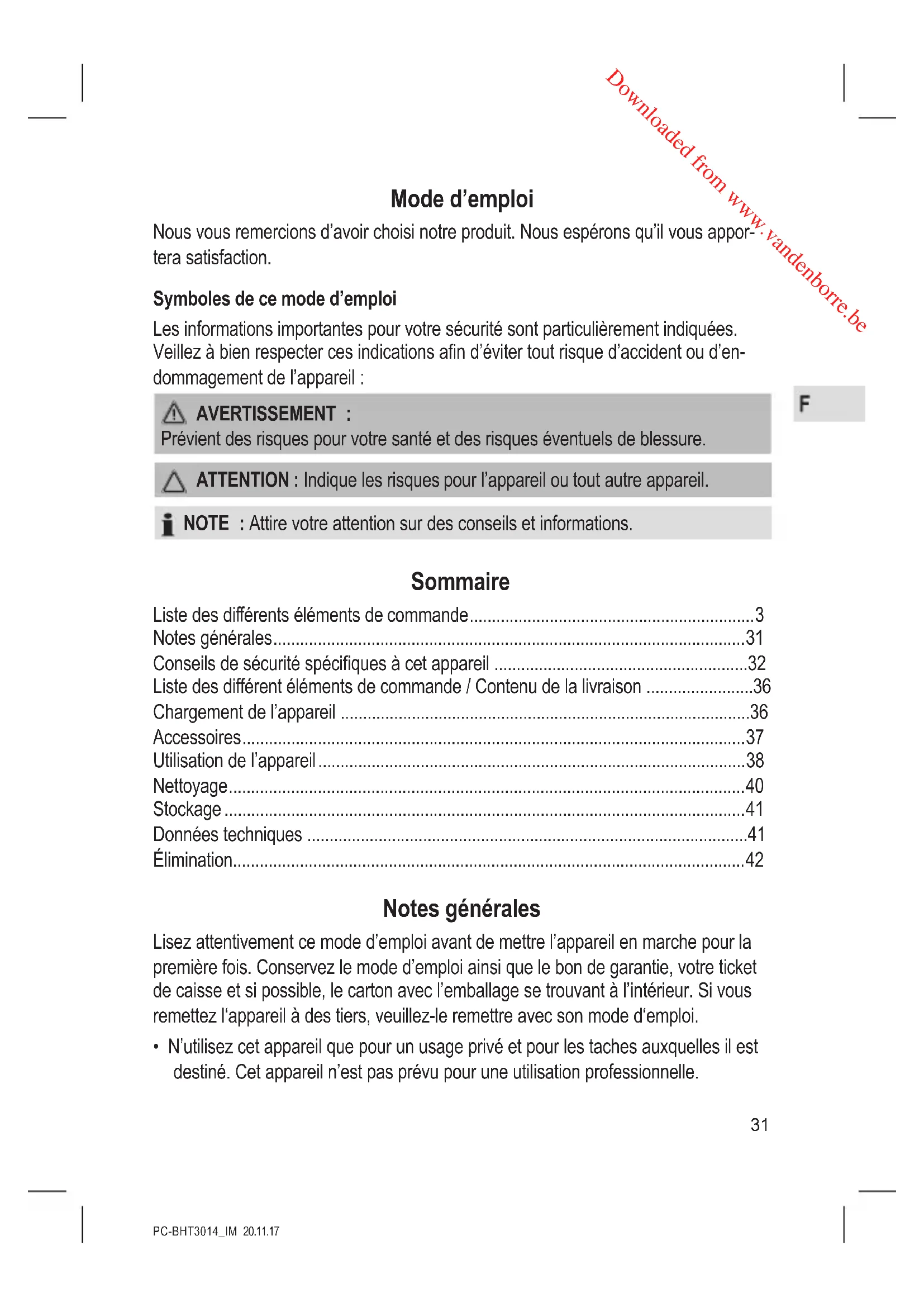 - N’utilisez cet appareil que pour un usage privé et pour les taches auxquelles il est destiné. Cet appareil n’est pas prévu pour une utilisation professionnelle. Downloaded from www.vandenborre.bePC-BHT3014_IM 20.11.17