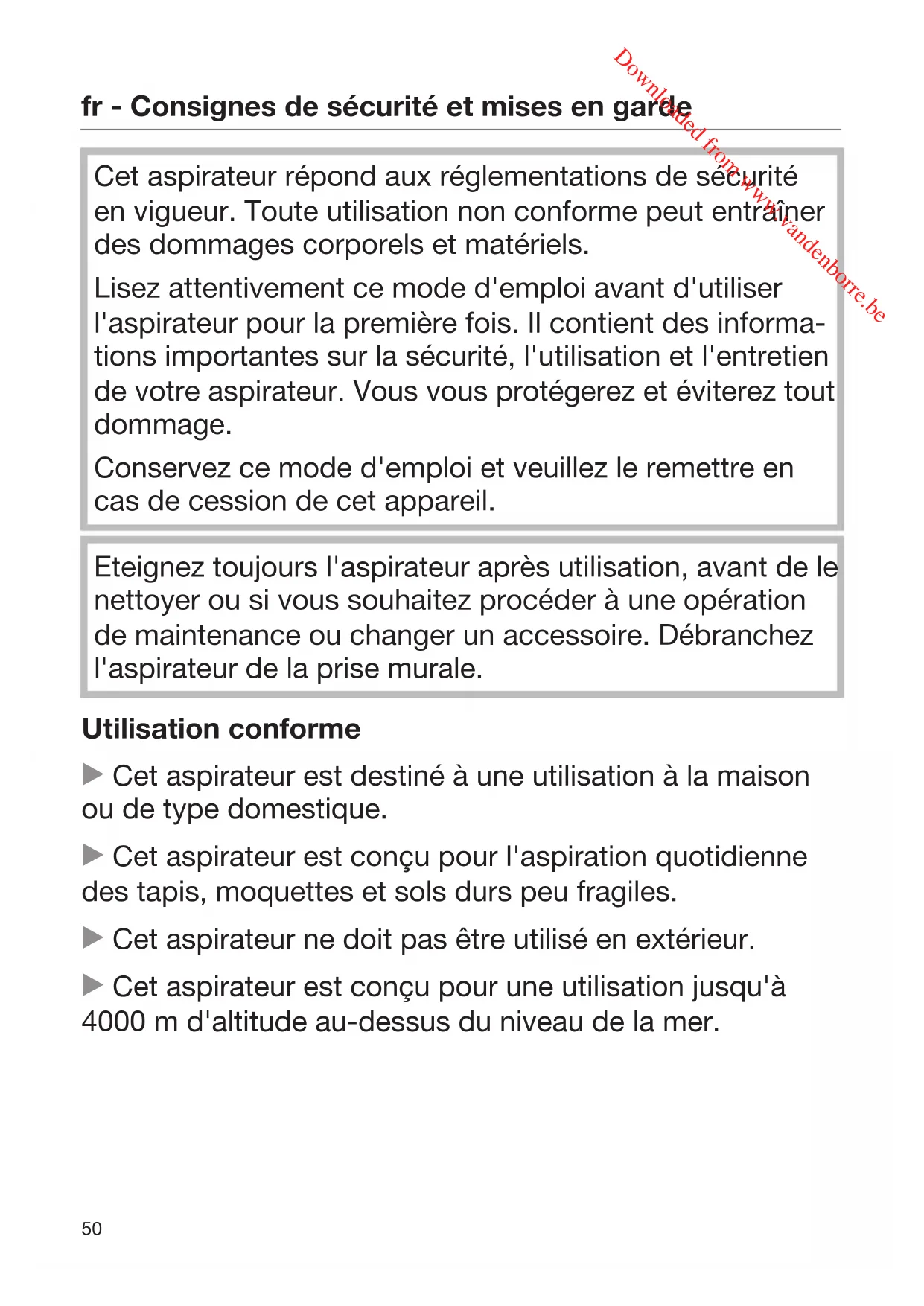 Cet aspirateur répond aux réglementations de sécurité en vigueur. Toute utilisation non conforme peut entraîner des dommages corporels et matériels. Lisez attentivement ce mode d'emploi avant d'utiliser l'aspirateur pour la première fois. Il contient des informa- tions importantes sur la sécurité, l'utilisation et l'entretien de votre aspirateur. Vous vous protégerez et éviterez tout dommage. Conservez ce mode d'emploi et veuillez le remettre en cas de cession de cet appareil. Eteignez toujours l'aspirateur après utilisation, avant de le nettoyer ou si vous souhaitez procéder à une opération de maintenance ou changer un accessoire. Débranchez l'aspirateur de la prise murale. Utilisation conforme Cet aspirateur est destiné à une utilisation à la maison ou de type domestique. Cet aspirateur est conçu pour l'aspiration quotidienne des tapis, moquettes et sols durs peu fragiles. Cet aspirateur ne doit pas être utilisé en extérieur. Cet aspirateur est conçu pour une utilisation jusqu'à 4000m d'altitude au-dessus du niveau de la mer. Downloaded from www.vandenborre.befr - Consignes de sécurité et mises en garde
