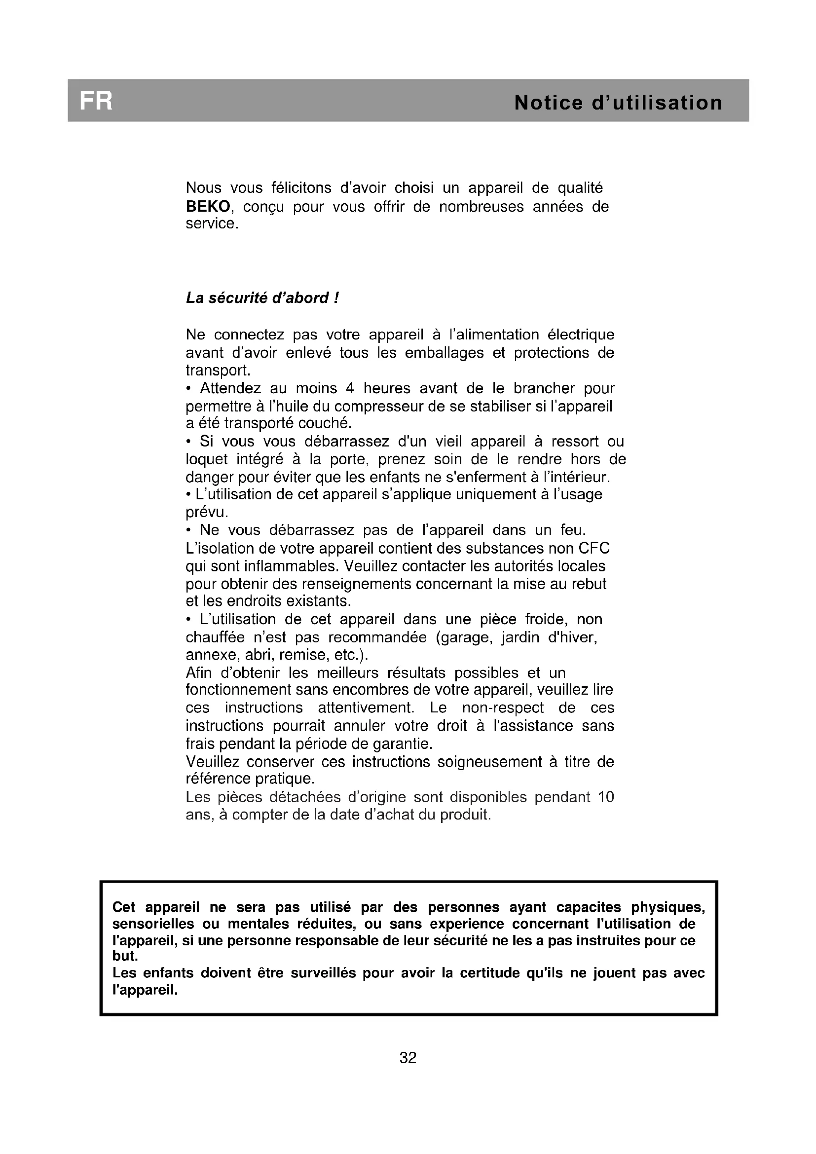 Cet appareil ne sera pas utilisé par des personnes ayant capacites physiques, sensorielles ou mentales réduites, ou sans experience concernant l'utilisation de l'appareil, si une personne responsable de leur sécurité ne les a pas instruites pour ce but. Les enfants doivent être surveillés pour avoir la certitude qu'ils ne jouent pas avec l'appareil.FR Notice d’utilisation Conditions électriques Avant de brancher l'appareil à la prise murale, vérifiez que la tension et la fréquence indiquées sur la plaque signalétique à l'intérieur de l'appareil correspondent à votre alimentation électrique. Nous recommandons de connecter cet appareil au réseau électrique par le biais d’une prise dotée d’un commutateur et d'un fusible et placée de façon à être facile d’accès. Avertissement ! Cet appareil doit être branché à une borne de mise à la terre. Les réparations de l’appareillage électrique sont réservées exclusivement à un technicien qualifié. De mauvaises réparations réalisées par une personne non qualifiée peuvent occasionner des risques dont les conséquences peuvent être critiques pour l’utilisateur de l’appareil. ATTENTION ! Cet appareil fonctionne avec du R 600a, un gaz qui contribue à la protection de l’environnement mais qui est inflammable. Pendant le transport et l’installation du produit, veillez à ne pas endommager le système réfrigérant. Si le système réfrigérant est abîmé et qu’une fuite de gaz se produit, tenez l’appareil à l’écart des sources de flammes vives et aérer bien la pièce. AVERTISSEMENT - N’utilisez pas d'outils mécaniques ou autres moyens pour accélérer le processus de décongélation autres que ceux qui sont recommandés par le fabricant. AVERTISSEMENT - N’abîmez pas le circuit réfrigérant. AVERTISSEMENT - Ne faites pas fonctionner d'appareils électriques à l'intérieur des compartiments de conservation de denrées, à moins qu’ils soient conformes au type d'appareils recommandés par le fabricant. AVERTISSEMENT - Si le cordon d’alimentation est endommagé, celui-ci doit être remplacé par le fabricant, ses agents agréés ou tout autre agent qualifié afin d'être à l'abri de tout danger. Instructions de transport