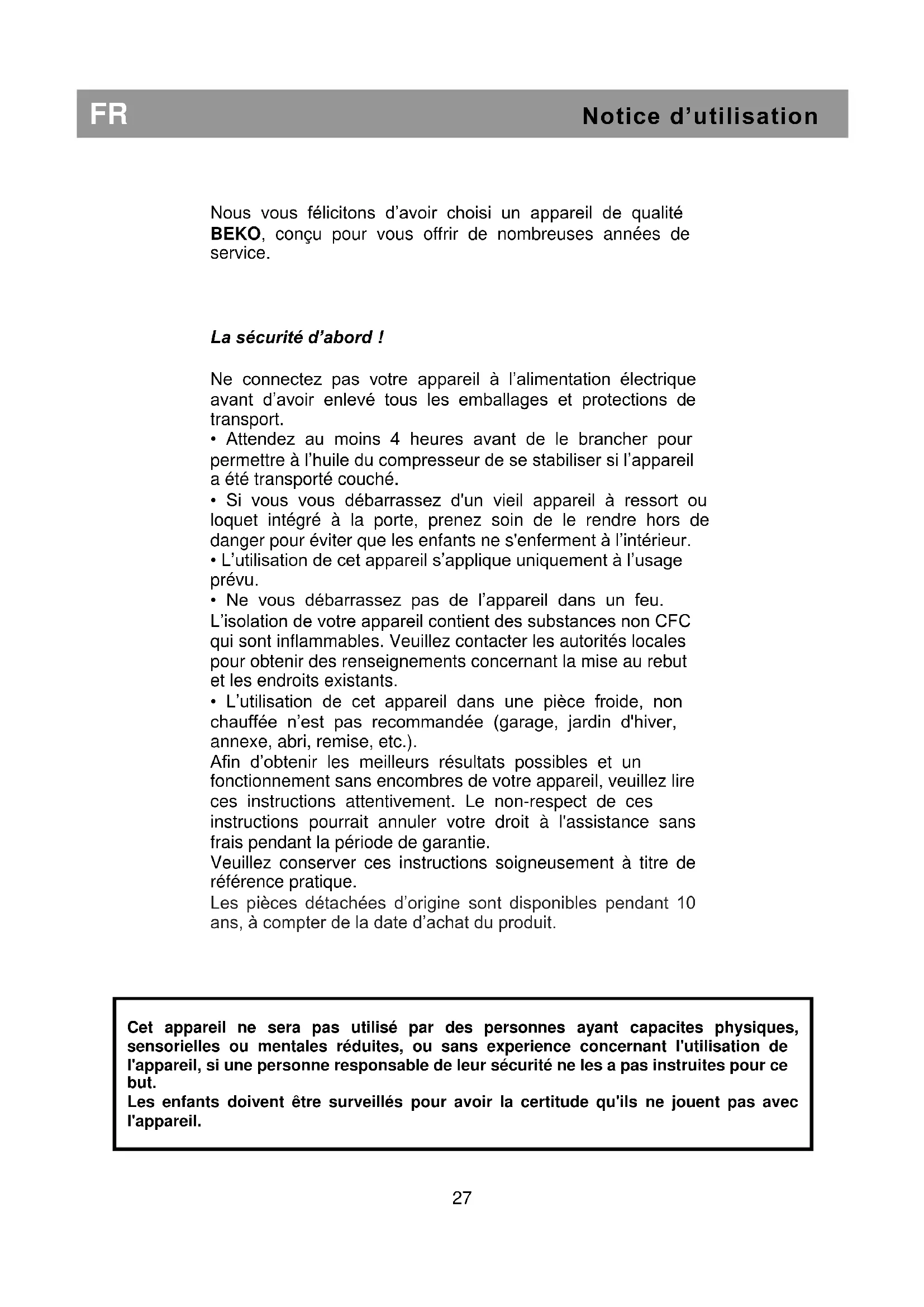 Cet appareil ne sera pas utilisé par des personnes ayant capacites physiques, sensorielles ou mentales réduites, ou sans experience concernant l'utilisation de l'appareil, si une personne responsable de leur sécurité ne les a pas instruites pour ce but. Les enfants doivent être surveillés pour avoir la certitude qu'ils ne jouent pas avec l'appareil.FR Notice d’utilisation Conditions électriques Avant de brancher l'appareil à la prise murale, vérifiez que la tension et la fréquence indiquées sur la plaque signalétique à l'intérieur de l'appareil correspondent à votre alimentation électrique. Nous recommandons de connecter cet appareil au réseau électrique par le biais d’une prise dotée d’un commutateur et d'un fusible et placée de façon à être facile d’accès. Avertissement ! Cet appareil doit être branché à une borne de mise à la terre. Les réparations de l’appareillage électrique sont réservées exclusivement à un technicien qualifié. De mauvaises réparations réalisées par une personne non qualifiée peuvent occasionner des risques dont les conséquences peuvent être critiques pour l’utilisateur de l’appareil. ATTENTION ! Cet appareil fonctionne avec du R 600a, un gaz qui contribue à la protection de l’environnement mais qui est inflammable. Pendant le transport et l’installation du produit, veillez à ne pas endommager le système réfrigérant. Si le système réfrigérant est abîmé et qu’une fuite de gaz se produit, tenez l’appareil à l’écart des sources de flammes vives et aérer bien la pièce. AVERTISSEMENT - N’utilisez pas d'outils mécaniques ou autres moyens pour accélérer le processus de décongélation autres que ceux qui sont recommandés par le fabricant. AVERTISSEMENT - N’abîmez pas le circuit réfrigérant. AVERTISSEMENT - Ne faites pas fonctionner d'appareils électriques à l'intérieur des compartiments de conservation de denrées, à moins qu’ils soient conformes au type d'appareils recommandés par le fabricant. AVERTISSEMENT - Si le cordon d’alimentation est endommagé, celui-ci doit être remplacé par le fabricant, ses agents agréés ou tout autre agent qualifié afin d'être à l'abri de tout danger. Instructions de transport