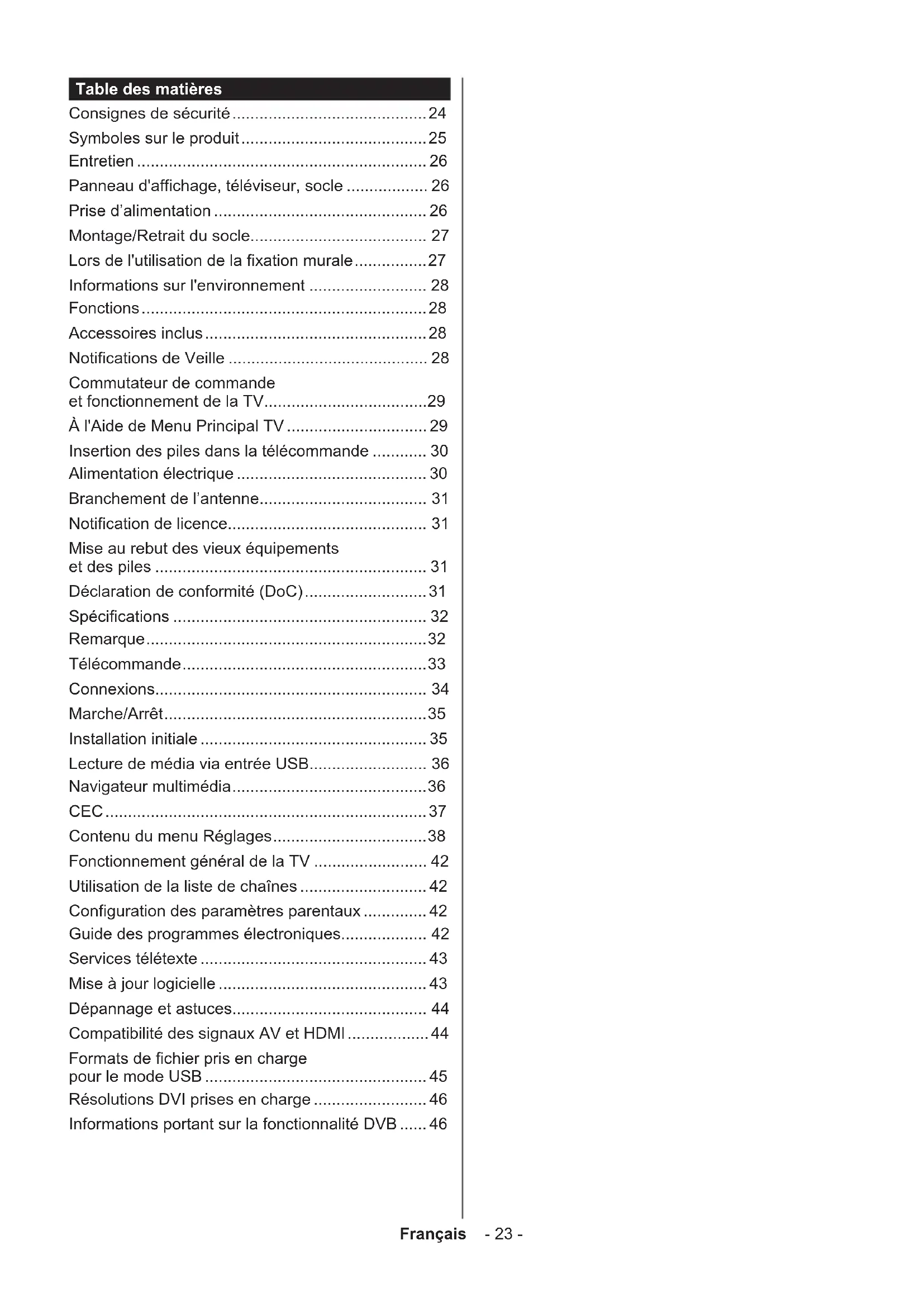 - (X : Non disponible, O : Disponible) Dans certains cas, un signal du téléviseur peut ne pas s'afficher correctement. Le problème peut être celui d'une inconsistance au niveau des normes de l'équipement source (DVD, décodeur, etc.). Si vous rencontrez ce type de problème, veuillez contacter votre fournisseur et le fabricant de l’appareil source.Français - 45 - Formats de fichier pris en charge pour le mode USB Périphérique multimédia Extension Formater Remarques Vidéo .mpg, .mpeg MPEG1-2 MPEG1: 768x576 @ 30P, MPEG2:1920x1080 @ 30P .vob MPEG2 1920x1080 @ 30P mp4 MPEG4, Xvid, H.264 .mkv H.264, MPEG4,VC-1 .avi MPEG2, MPEG4, Xvid, H.264 .flv H.264/VP6/ Sorenson H.264/VP6 : 1920x1080 @ 30P Sorenson : 352x288 @ 30P .mp4, .mov, .3gpp, .3gp, flux de transport MPEG, .ts,. trp, .tp, .mkv HEVC/H.265 1080 P@60 fps - 50 Mbps 3gp MPEG4 , H.264 1920x1080 @ 30P Audio mp3 MPEG1 Layer 2/3 Layer2: 32Kbps ~ 448Kbps (Débit binaire) / 32kHz, 44.1kHz, 48kHz, 16kHz, 22.05kHz, 24kHz (Taux d'échantillonnage) Layer3: 32Kbps ~ 320Kbps (Débit binaire) / 32kHz, 44.1kHz, 48kHz, 16kHz, 22.05kHz, 24kHz, 8kHz, 11.025kHz, 12kHz (Taux d'échantillonnage) (fonctionne uniquement avec les fichiers vidéo) AC3 32Kbps ~ 640Kbps (Débit binaire) / 32 kHz ~ 44,1 kHz, 48 kHz (Taux d'échantillonnage) AAC 16Kbps ~ 576Kbps (Débit binaire) / 48kHz, 44.1kHz, 32kHz, 24kHz, 22.05kHz, 16kHz, 12kHz, 11.025kHz, 8kHz (Taux d'échantillonnage) EAC3 32Kbps ~ 6Kbps (Débit binaire) / 32 kHz ~ 44,1 kHz, 48 kHz (Taux d'échantillonnage) LPCM 8bit PCM non signé ,16bit PCM signé/signé (grand / petit format), 24bit PCM (grand format), DVD LPCM 16/20/24bit (Débit binaire) / 6kHz, 8kHz, 11.025kHz, 12kHz, 16kHz, 22.05kHz, 24kHz, 32kHz, 44.1kHz, 48kHz , 88.2kHz, 96kHz, 176.4kHz, 192kHz (Taux d'échantillonnage) IMA-ADPCM/ MS-ADPCM 384Kbps (Débit binaire) / 8KHz ~ 48Khz (Taux d'échantillonnage) LBR 32Kbps ~ 96Kbps (Débit binaire) / 32 kHz ~ 44,1 kHz, 48 kHz (Taux d'échantillonnage) Image .jpeg Point de comparaison Résolution(LxH): 17000x10000 Progressif Résolution(LxH): 4000x4000 .bmp - Résolution(LxH): 5760x4096 Sous-titre .sub, .srt - -Français - 46 - Résolutions DVI prises en charge Reportez-vous aux résolutions suivantes au moment de raccorder des périphériques à votre téléviseur à l’aide des câbles convertisseurs DVI (DVI à HDMI - non fournis). 56Hz 60Hz 66Hz 70Hz 72Hz 75Hz 640 x 400 x 640x480 x x x x 800x600 x x x x x 832 x 624 x 1024x768 x x x x x 1152x864 x x x 1152 x 870 x 1280x768 x x 1360x768 x 1280x960 x x 1280x1024 x x 1400x1050 x x 1440x900 x x 1600x1200 x 1680x1050 x 1920x1080 x Informations portant sur la fonctionnalité DVB L’utilisation de ce récepteur DVB est indiquée uniquement dans le pays pour lequel il a été fabriqué. Bien que ce récepteur DVB soit conforme aux spécifications DVB les plus récentes au moment de sa fabrication, nous ne saurions en garantir la compatibilité avec les transmissions DVB ultérieures en raison des changements susceptibles d’intervenir dans les signaux et technologies de diffusion. Certaines fonctions du téléviseur numérique peuvent ne pas être disponibles dans tous les pays. Nous nous efforçons chaque jour à améliorer davantage la qualité de nos produits ; par conséquent, leurs spécifications peuvent changer sans préavis. Pour savoir où acheter des accessoires, veuillez contacter le magasin dans lequel vous avez acheté votre équipement.Deutsch - 47 - Inhalt Sicherheitsinformationen p. 48