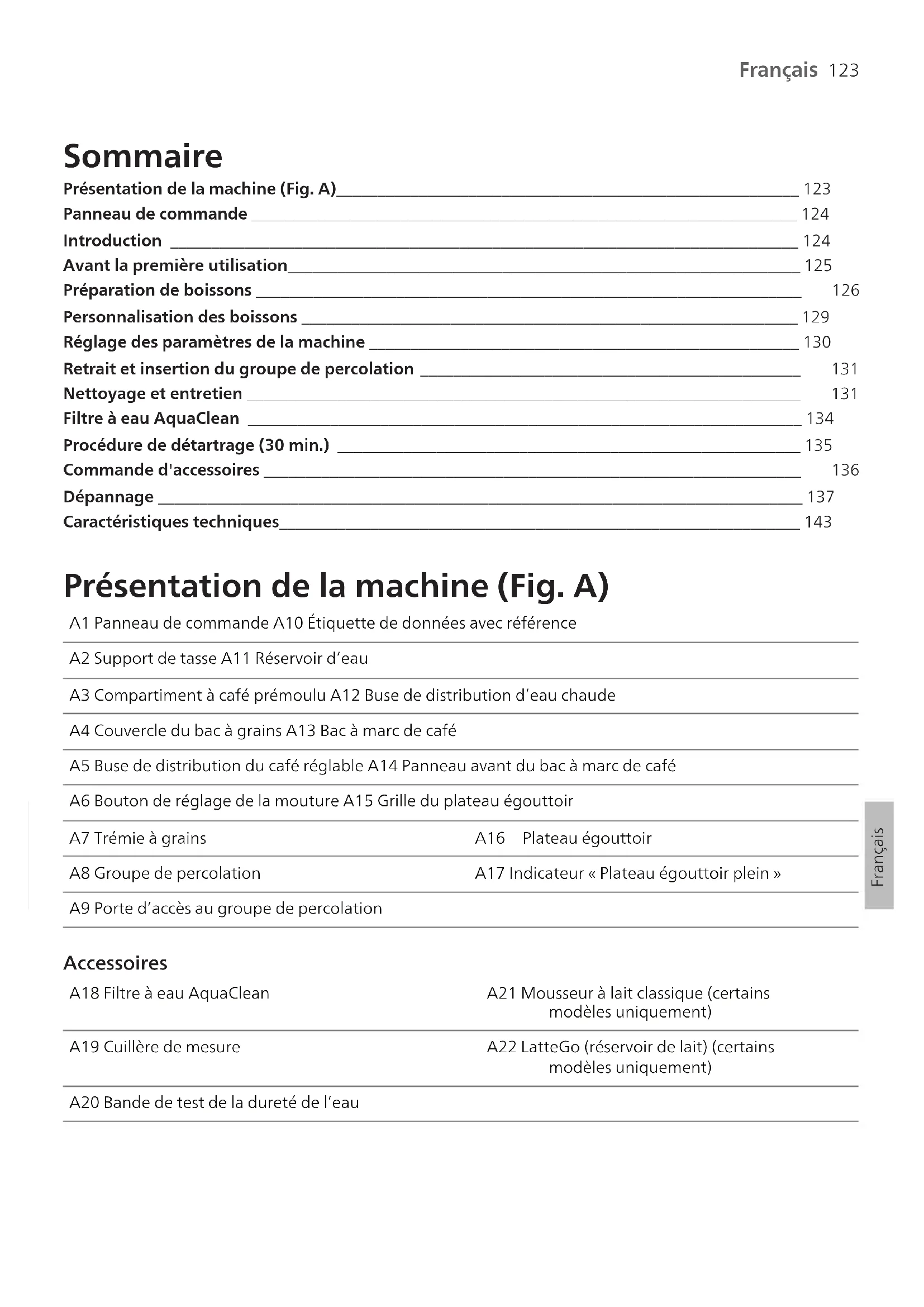 Français FrançaisFrançais Sommaire Présentation de la machine (Fig. A)________________________________________________________ 123Panneau de commande __________________________________________________________________ 124Introduction ____________________________________________________________________________ 124Avant la première utilisation______________________________________________________________ 125 Préparation de boissons __________________________________________________________________ 126 Personnalisation des boissons ____________________________________________________________ 129Réglage des paramètres de la machine ____________________________________________________ 130 Retrait et insertion du groupe de percolation ______________________________________________ 131 Nettoyage et entretien ___________________________________________________________________ 131 Filtre à eau AquaClean ___________________________________________________________________ 134Procédure de détartrage (30min.) ________________________________________________________ 135 Commande d'accessoires _________________________________________________________________ 136 Dépannage ______________________________________________________________________________ 137Caractéristiques techniques_______________________________________________________________ 143 Présentation de la machine (Fig. A) A1 Panneau de commande A10 Étiquette de données avec référenceA2 Support de tasse A11 Réservoir d’eauA3 Compartiment à café prémoulu A12 Buse de distribution d’eau chaudeA4 Couvercle du bac à grains A13 Bac à marc de caféA5 Buse de distribution du café réglable A14 Panneau avant du bac à marc de caféA6 Bouton de réglage de la mouture A15 Grille du plateau égouttoirA7 Trémie à grains A16 Plateau égouttoirA8 Groupe de percolation A17 Indicateur «Plateau égouttoir plein»A9 Porte d’accès au groupe de percolation Accessoires A18 Filtre à eau AquaClean A21 Mousseur à laitclassique (certainsmodèles uniquement)A19 Cuillère de mesure A22 LatteGo (réservoir de lait) (certainsmodèles uniquement)A20 Bande de test de la dureté de l’eau124 Français Panneau de commande Il existe plusieurs versions de cette machine à espresso, avec différents panneaux de commande. Chaque version a sa propre référence. Vous trouverez le numéro de référence sur l’étiquette de données située à l’intérieur de la porte d’accès (fig.A9). Vous pouvez également trouver le numéro de référence en tapant sur l’icône des paramètres et en sélectionnant «assistance». Veuillez vous reporter aux figuresC et D pour une présentation de tous les boutons et icônes. La description figure ci-dessous. Utilisez les flèches haut et bas pour faire défiler le menu d’affichage, puis touchez l’icôneOK pour confirmer vos choix. Tous types (fig.C/D/E) C1/D1/E1 Icônes de boissons à simple pression C3. Icônes de navigation (vers le haut, vers le bas, OK) C6. Menu de nettoyage C2. Marche/arrêt (bouton) C4. Afficheur C7. Profils personnels D2/E2 Menu des autres boissons C5. Paramètres de la machine C8. Bouton de veille EP4327, EP4324, EP4321 uniquement (fig.C) C1 Icônes des boissons à simple pression: Espresso, Coffee (Café), Americano, Caffé Crema (Café Crème), Ristretto, Hot Water (Eau Chaude) et Steam (Vapeur) EP4349, EP4346, EP4343, EP4341 uniquement (fig.D) D1 Icônes de boissons à simple pression: Espresso, Coffee (Café), Americano, Cappuccino, Latte Macchiato, Café au lait EP5447, EP5446, EP5444, EP5443, EP5441, EP5144 uniquement (Fig. E) E1 Icônes de boissons à simple pression: Espresso, Coffee (Café), Americano, Cappuccino, Latte Macchiato, Café au lait Introduction Félicitations pour votre achat d’une machine à café Philips entièrement automatique! Pour bénéficier pleinement de notre assistance, veuillez enregistrer votre produit sur le site www.home.id. Lisez attentivement le livret de sécurité distinct avant d’utiliser la machine pour la première fois, et conservez-le pour un usage ultérieur. Avant la première utilisation, rincez à l’eau chaude tous les accessoires amovibles devant entrer en contact avec de l’eau ou du lait. Pour vous aider à vous familiariser avec votre machine et en profiter au maximum, nous pouvons vous aider de plusieurs façons. La boîte contient les éléments suivants: 1 Le Guide de démarrage rapide avec les instructions d’utilisation illustrées et des informations sur le nettoyage et l’entretien. 2 Le livret de sécurité séparé, avec les instructions relatives à l’utilisation sûre de la machine à café.125 Français Français 3 Pour bénéficier de l’assistance en ligne (version intégrale du mode d’emploi, foire aux questions, vidéos, etc.), veuillez scanner le codeQR figurant sur la couverture du présent mode d’emploi pour télécharger l’application HomeID ou consulter la page www.home.id/support. Vous pouvez également trouver le codeQR en appuyant sur l’icône des paramètres , puis en sélectionnant Support. Cette machine a été testée avec du café. Bien qu’elle ait été soigneusement nettoyée, il se peut que quelques résidus de café subsistent. Nous garantissons néanmoins que la machine est entièrement neuve. La machine à café règle automatiquement la quantité de café moulu utilisée pour obtenir un café au goût optimal. Il convient de préparer initialement 5cafés pour permettre à la machine de compléter son autoréglage. Veillez à rincer le LatteGo (réservoir de lait) ou le mousseur à lait classique avant la première utilisation. Avant la première utilisation