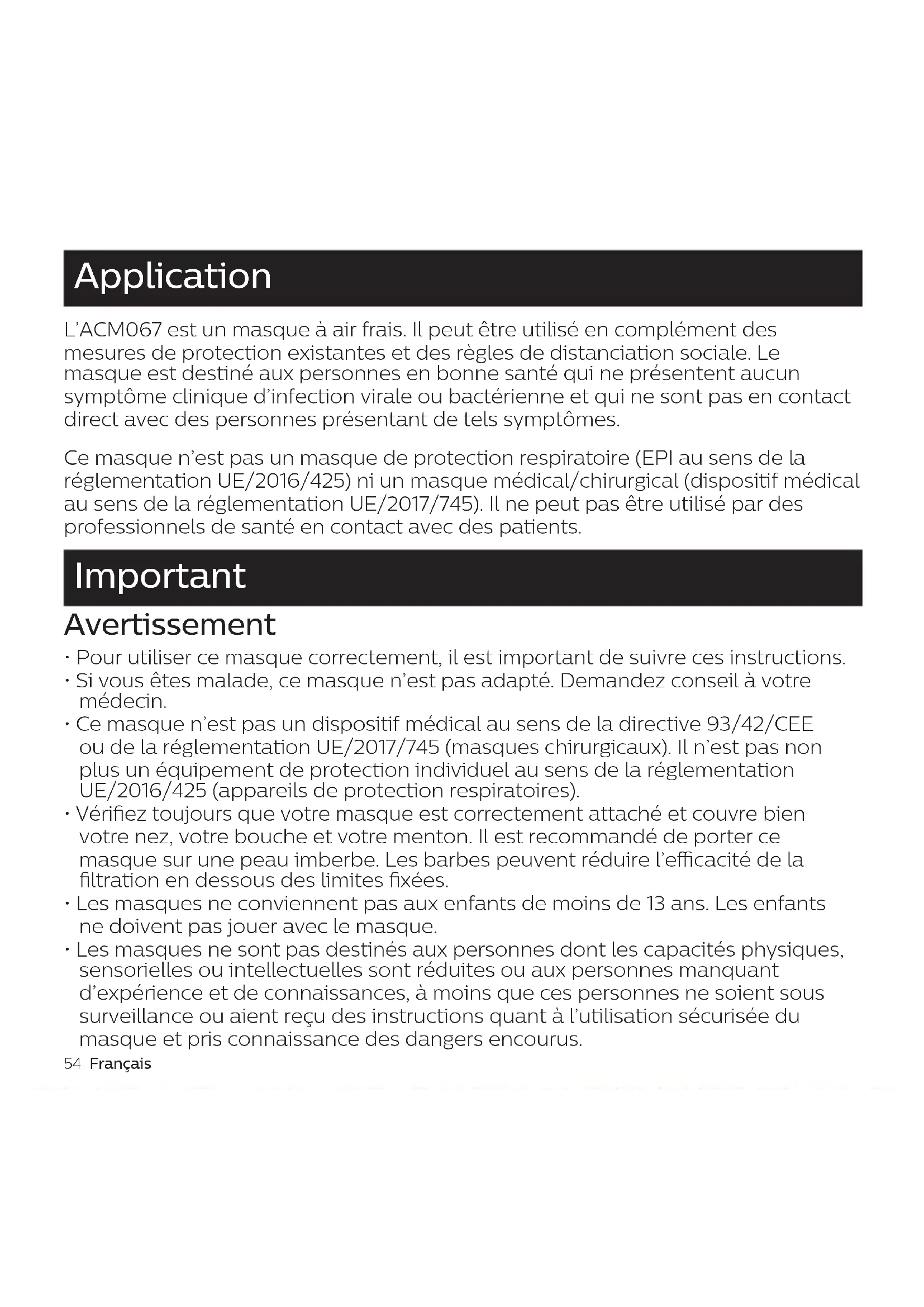 - Veuillez consulter votre médecin dans les cas suivants : AMC067-AirMasks_3000.062.5277.2_BOOKLET_120x120mm_BW.indd 54AMC067-AirMasks_3000.062.5277.2_BOOKLET_120x120mm_BW.indd 54 01-03-21 11:2501-03-21 11:25Français 55 Application L’ACM067 est un masque à air frais. Il peut être utilisé en complément des mesures de protection existantes et des règles de distanciation sociale. Le masque est destiné aux personnes en bonne santé qui ne présentent aucun symptôme clinique d’infection virale ou bactérienne et qui ne sont pas en contact direct avec des personnes présentant de tels symptômes. Ce masque n’est pas un masque de protection respiratoire (EPI au sens de la réglementation UE/2016/425) ni un masque médical/chirurgical (dispositif médical au sens de la réglementation UE/2017/745). Il ne peut pas être utilisé par des professionnels de santé en contact avec des patients. Important Avertissement