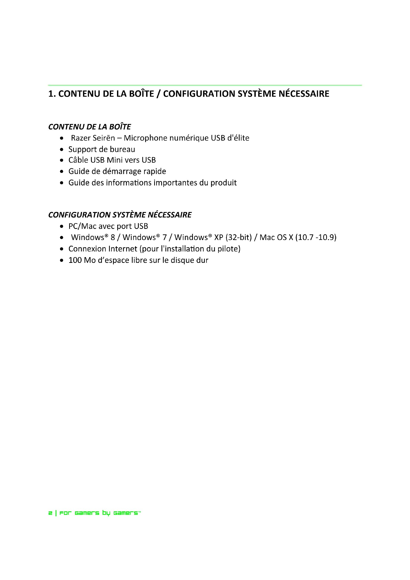 PC/Mac avec port USB Windows® 8 / Windows® 7 / Windows® XP (32-bit) / Mac OS X (10.7 -10.9) Connexion Internet (pour l'installation du pilote) 100 Mo d’espace libre sur le disque dur3 | razer™