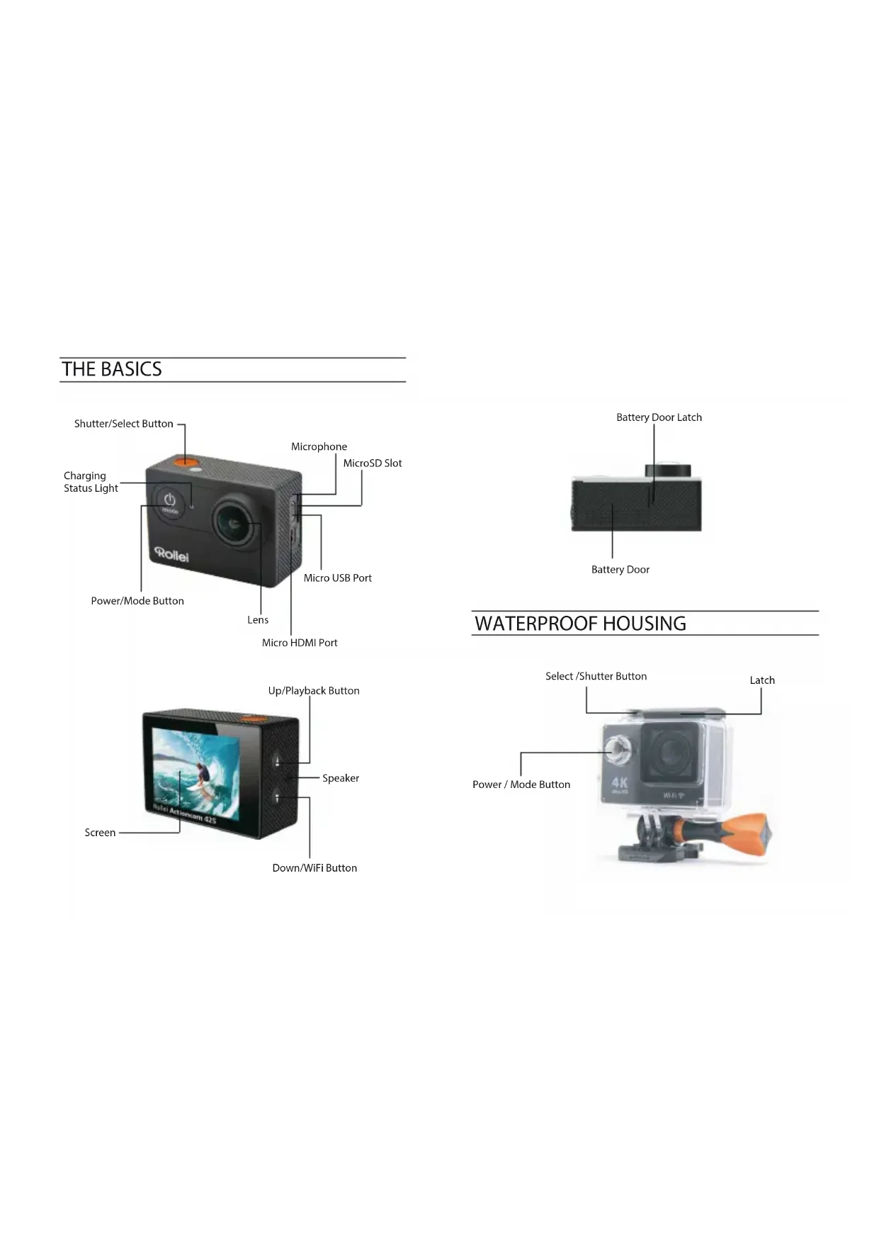 :",2)/(&(""&I"1;&N6&2*:&NK&$#&,-"&]RH&Y"(("%&]"*"%2/&S'@/)1& Y)1"*("7&X"%()$*&5;N; P5+*%)6(56 Q1)5(56&-"5*"7-+3"7-&#$*&H88(*Obturateur/ bouton de sélection Obturateur/bouton de sélection Couvercle Bouton alimentation/mode Microphone Logement MicroSD Loquet du couvercle de batterie Couvercle de batterie PortMicro USB PortMicro HDMI Bouton haut/Lecture Hautparleur Écran Bouton bas/WiFi Bouton alimenta on/Mode Linssi Témoin lumineux d'état BOITIER ÉTANCHE