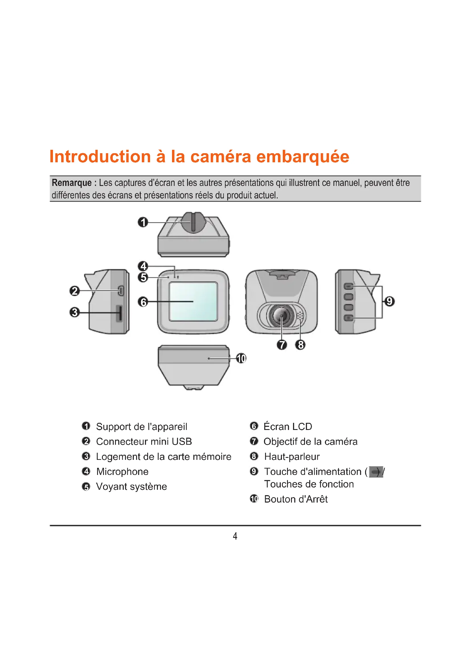 - WEEE Introduction à la caméra embarquée Remarque : Les captures d’écran et les autres présentations qui illustrent ce manuel, peuvent être différentes des écrans et présentations réels du produit actuel. p. 244