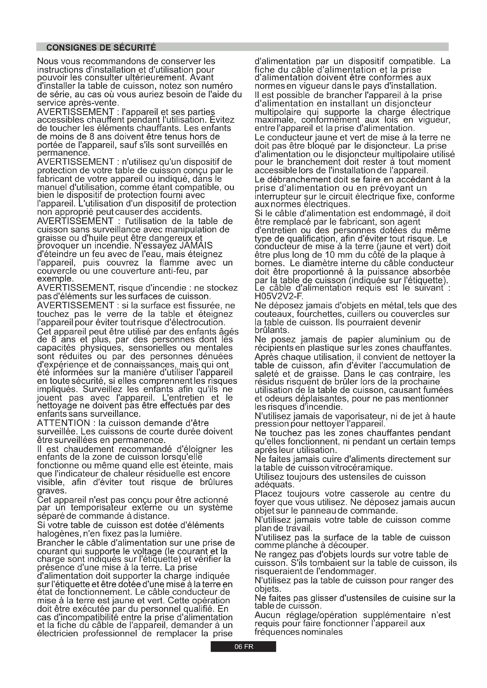 touchez pas le verre de la table et éteignez l'appareil pour éviter tout risque d'électrocution. Cet appareil peut être utilisé par des enfants âgés de 8 ans et plus, par des personnes dont les capacités physiques, sensorielles ou mentales sont réduites ou par des personnes dénuées d'expérience et de connaissances, mais qui ont été informées sur la manière d'utiliser l'appareil en toute sécurité, si elles comprennent les risques impliqués. Surveillez les enfants afin qu'ils ne jouent pas avec l'appareil. L'entretien et le nettoyage ne doivent pas être effectués par des enfants sans surveillance. ATTENTION : la cuisson demande d'être surveillée. Les cuissons de courte durée doivent être surveillées en permanence. Il est chaudement recommandé d'éloigner les enfants de la zone de cuisson lorsqu'elle fonctionne ou même quand elle est éteinte, mais que l'indicateur de chaleur résiduelle est encore visible, afin d'éviter tout risque de brûlures graves. Cet appareil n'est pas conçu pour être actionné par un temporisateur externe ou un système séparé de commande à distance. Si votre table de cuisson est dotée d'éléments halogènes, n'en fixez pas la lumière. Brancher le câble d'alimentation sur une prise de courant qui supporte le voltage (le courant et la charge sont indiqués sur l'étiquette) et vérifier la présence d'une mise à la terre. La prise d'alimentation doit supporter la charge indiquée sur l'étiquette et être dotée d'une mise à la terre en état de fonctionnement. Le câble conducteur de mise à la terre est jaune et vert. Cette opération doit être exécutée par du personnel qualifié. En cas d'incompatibilité entre la prise d'alimentation et la fiche du câble de l'appareil, demander à un électricien professionnel de remplacer la prise