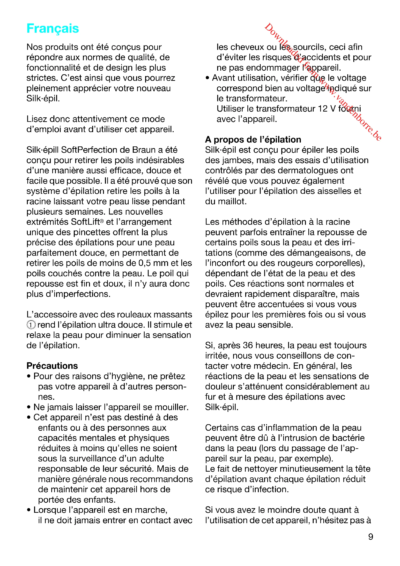 5368389_SE3170_S6- Seite 8 Montag, 27. August 2007 11:12 11 Downloaded from www.vandenborre.be9 Nos produits ont été conçus pour répondre aux normes de qualité, de fonctionnalité et de design les plus strictes. C’est ainsi que vous pourrez pleinement apprécier votre nouveau Silk·épil. Lisez donc attentivement ce mode d’emploi avant d’utiliser cet appareil. Silk·épill SoftPerfection de Braun a été conçu pour retirer les poils indésirables d’une manière aussi efficace, douce et facile que possible. Il a été prouvé que son système d’épilation retire les poils à la racine laissant votre peau lisse pendant plusieurs semaines. Les nouvelles extrémités SoftLift