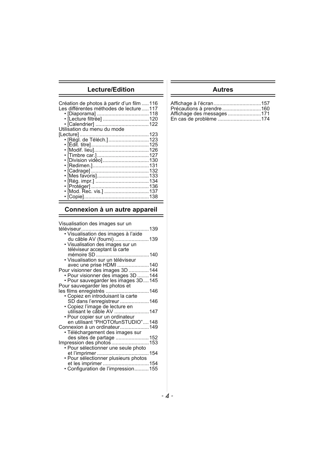 - [Copie].............................................138 Autres Affichage à l’écran.................................157 Précautions à prendre ...........................160 Affichage des messages .......................171 En cas de problème ..............................174 Connexion à un autre appareil Visualisation des images sur un téléviseur...............................................139