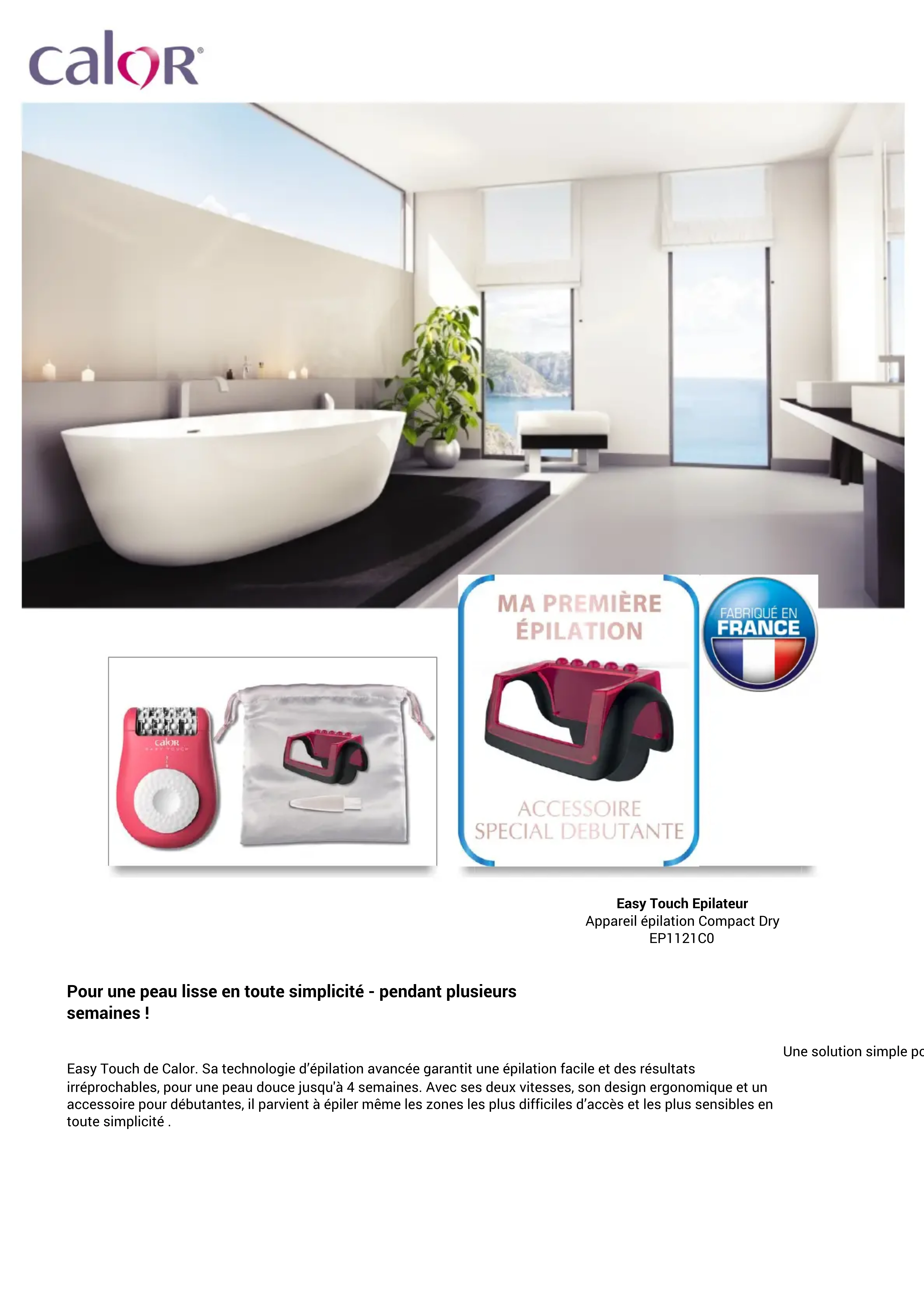 Une solution simple pour une peau douce plus longtemps - dès la première utilisation - avec l’appareil épilation Easy Touch de Calor. Sa technologie d’épilation avancée garantit une épilation facile et des résultats irréprochables, pour une peau douce jusqu'à 4semaines. Avec ses deux vitesses, son design ergonomique et un accessoire pour débutantes, il parvient à épiler même les zones les plus difficiles d’accès et les plus sensibles en toute simplicité .BENEFICES DU PRODUIT Une épilation plus facile La solution longue durée, rapide et facile, pour une peau douce jusqu’à 4semaines. Technologie d'épilation avancée pour des résultats rapides et longue durée Grâce à sa technologie de pincettes ultra-précises à ouverture large pour un effort de pression optimal, Easy Touch élimine même les poils les plus courts (0,5mm) avec précision et sans les casser, tandis que le système de guidage du poil garantit une efficacité optimale en un seul passage. Sa grande surface d'épilation active pour une action plus rapide a été conçue afin de couvrir la surface de la peau de manière optimale, en éliminant un maximum de poils en un seul passage. Un design ergonomique Son design compact et ergonomique facile à manier atteint même les zones les plus difficiles d’accès. Système de massage Réduit la sensibilité de la peau grâce à son action massante active, pour une épilation tout en douceur. 2vitesses Vitesse plus faible pour une épilation plus douce des zones sensibles, vitesse plus élevée pour des sessions rapides et efficaces. Accessoire pour débutantes Apprenez à tenir l’appareil dans la bonne position, pour une efficacité optimale, une épilation plus facile et des résultats irréprochables dès la première utilisation. Recommandé pour les 4-5premières utilisations. Produit réparable - 10 ans Conçu pour être réparé Mise à disposition rapide des pièces à coût limité pendant 10 ans et plus 6500 centres de réparations dans le Monde[product.madein]Packaging [product.madein]Packaging Photos produit in situPhotos produit in situ Autres images produit