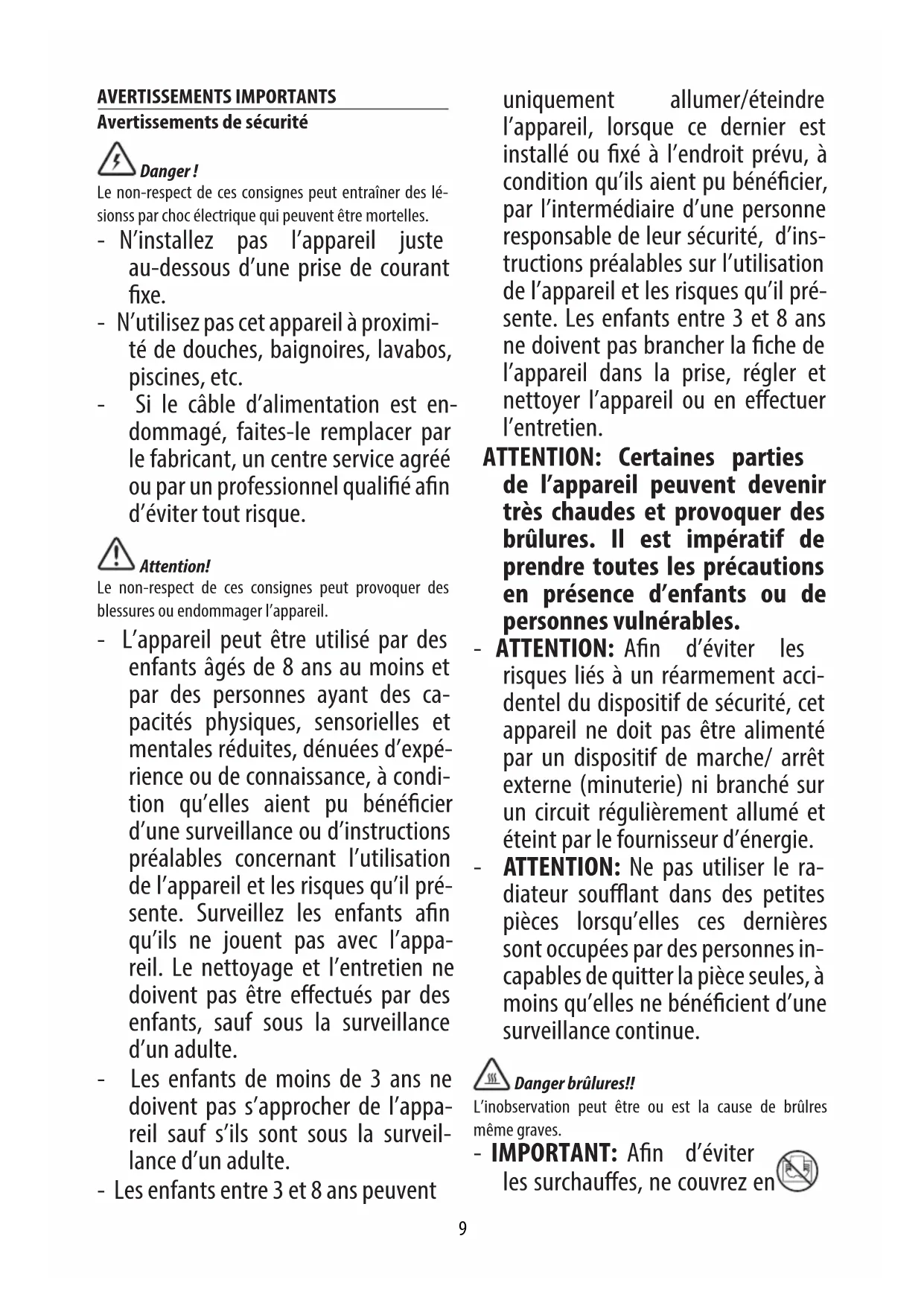 REACH OF CHILDREN. - Swallowing may lead to serious inju- ry in as little as 2 hours or death, due to chemical burns and potential per- foration of the oesophagus. - Examine devices and make sure the battery compartment is correctly se- cured. Do not use if compartment is not secure. - Dispose of used button batteries im- mediately and safely. Flat batteries can still be dangerous. Fundamental safety warnings Dear customer - the plug on the appliance heats up during use. This is completely normal. This HIGH POWER HEATING APPLIANCE complies with our usual high standards. You should, however, make sure that your power socket is in good condition and that the plug on the appliance is plugged into the socket correctly to avoid accidental overheating. If the appliance is used for long periods of8 time, we recommend checking the plug and mains socket regularly. If in doubt, consult an electrician. For non-EU countries only: This appliance is not intended for use by persons (including children) with reduced physical, sensory or mental capabilities, or lack of experience and knowledge, unless they have been given supervision or instruction concerning use of the appliance by a person responsible for their safety. Children should be su- pervised to ensure that they do not play with the appliance. Disposing of the appliance The appliance must not be disposed of with household waste, but taken to an authorised waste separation and recycling centre.9 AVERTISSEMENTS IMPORTANTS Avertissements de sécurité Danger ! Le non-respect de ces consignes peut entraîner des lé- sionss par choc électrique qui peuvent être mortelles. - N’installez pas l’appareil juste au-dessous d’une prise de courant xe. - N’utilisez pas cet appareil à proximi- té de douches, baignoires, lavabos, piscines, etc. - Si le câble d’alimentation est en- dommagé, faites-le remplacer par le fabricant, un centre service agréé ou par un professionnel qualié an d’éviter tout risque. Attention! Le non-respect de ces consignes peut provoquer des blessures ou endommager l’appareil. - L’appareil peut être utilisé par des enfants âgés de 8 ans au moins et par des personnes ayant des ca- pacités physiques, sensorielles et mentales réduites, dénuées d’expé- rience ou de connaissance, à condi- tion qu’elles aient pu bénécier d’une surveillance ou d’instructions préalables concernant l’utilisation de l’appareil et les risques qu’il pré- sente. Surveillez les enfants an qu’ils ne jouent pas avec l’appa- reil. Le nettoyage et l’entretien ne doivent pas être eectués par des enfants, sauf sous la surveillance d’un adulte. - Les enfants de moins de 3 ans ne doivent pas s’approcher de l’appa- reil sauf s’ils sont sous la surveil- lance d’un adulte. - Les enfants entre 3 et 8 ans peuvent uniquement allumer/éteindre l’appareil, lorsque ce dernier est installé ou xé à l’endroit prévu, à condition qu’ils aient pu bénécier, par l’intermédiaire d’une personne responsable de leur sécurité, d’ins- tructions préalables sur l’utilisation de l’appareil et les risques qu’il pré- sente. Les enfants entre 3 et 8 ans ne doivent pas brancher la che de l’appareil dans la prise, régler et nettoyer l’appareil ou en eectuer l’entretien. ATTENTION: Certaines parties de l’appareil peuvent devenir très chaudes et provoquer des brûlures. Il est impératif de prendre toutes les précautions en présence d’enfants ou de personnes vulnérables. - ATTENTION: An d’éviter les risques liés à un réarmement acci- dentel du dispositif de sécurité, cet appareil ne doit pas être alimenté par un dispositif de marche/ arrêt externe (minuterie) ni branché sur un circuit régulièrement allumé et éteint par le fournisseur d’énergie. - ATTENTION: Ne pas utiliser le ra- diateur souant dans des petites pièces lorsqu’elles ces dernières sont occupées par des personnes in- capables de quitter la pièce seules, à moins qu’elles ne bénécient d’une surveillance continue. Danger brûlures!! L’inobservation peut être ou est la cause de brûlres même graves. - IMPORTANT: An d’éviter les surchaues, ne couvrez en10 aucun cas l’appareil en marche, cela pourrait provoquer une élévation dangereuse de la température. - ATTENTION: an de réduire le risque d’incendie, ne pas placer de tissus, rideaux ou autres matériaux inammables à moins de 1 m de la grille de souage. Fonctions de sécurité - Dispositif de sécurité: l’appareil est muni d’un dispositif de sécurité qui arrête le radiateur souant en cas de surchaue accidentelle (obs- truction des grilles d’entrée et de sortie de l’air, moteur qui ne tourne pas ou qui tourne lentement). Pour remettre l’appareil en marche, débranchez-le quelques minutes, supprimez la cause de la surchaue et rebranchez-le. Si l’appareil conti- nue à ne pas fonctionner contactez le SAV De’Longhi le plus proche. - Dispositif de sécurité anti-bas- culement: Certains modèles sont doté d’un dispositif anti-renverse- ment qui éteint l’appareil en cas de chute. Pour le faire repartir, il sut de le relever. Remarque : Ce pictogramme signale des consignes et informations importantes pour l’utilisateur. - Utiliser l’appareil sur une surface horizontale et stable. - Utilisez l’appareil exclusivement en position verticale. - Ne pas utiliser l'appareil s'il est tombé. - Ne pas utiliser l'appareil s'il est visiblement endommagé. - N’utilisez pas de rallonge. Si une rallonge est vraiment néces- saire, suivez attentivement les ins- tructions du fabricant, sans jamais dépasser la puissance maximale indiquée sur la rallonge. - Ne faites pas fonctionner l’appareil contre un mur, un meuble, des ri- deaux, etc. - N’utilisez pas cet appareil dans une pièce de moins de 4m². - Avant de ranger l’appareil contrôlez qu’il est bien éteint et que la che est débranchée de la prise. Ne pas le ran