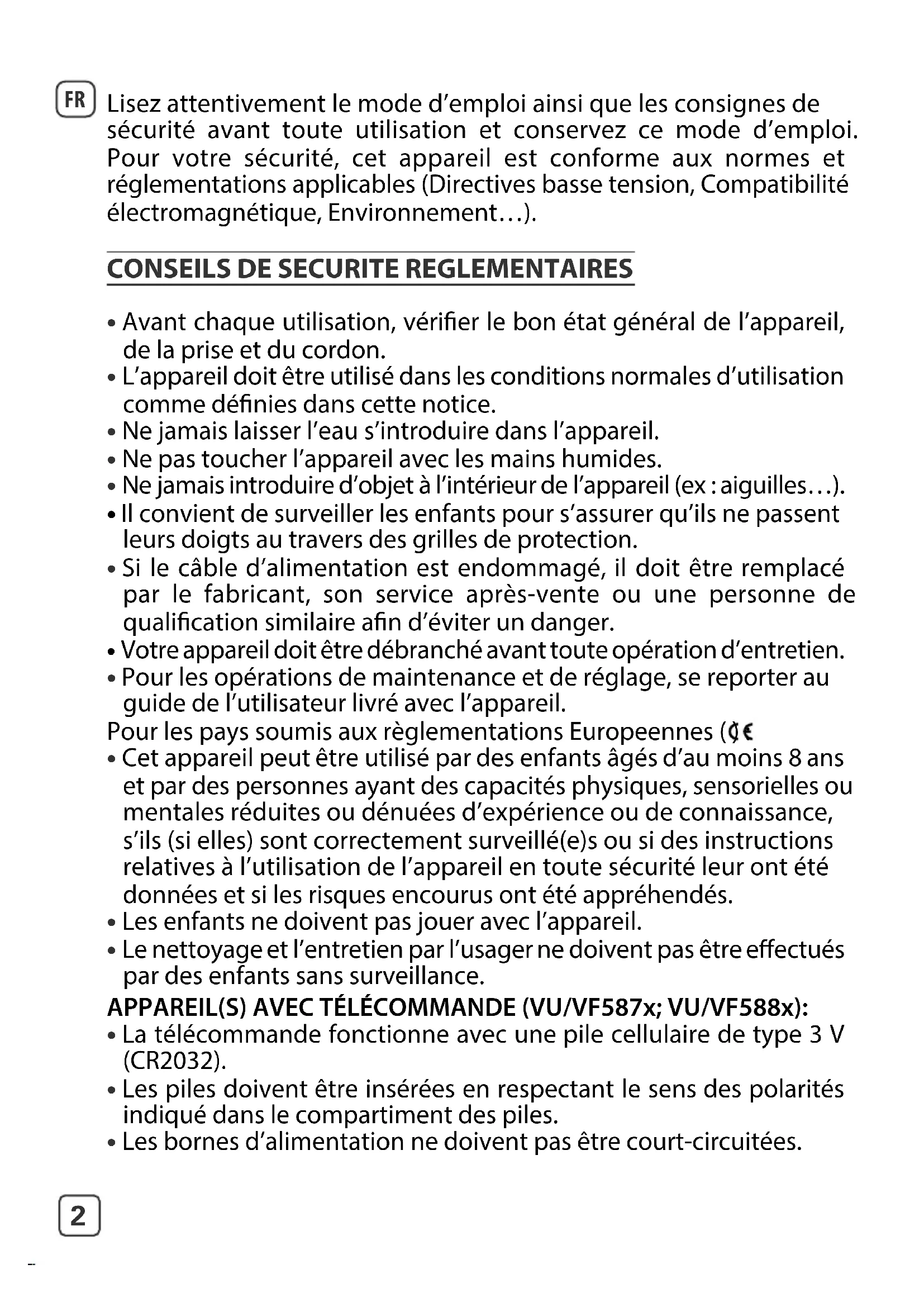 - Le nettoyage et l’entretien par l’usager ne doivent pas être eectués par des enfants sans surveillance. APPAREIL(S) AVEC TÉLÉCOMMANDE (VU/VF587x; VU/VF588x):