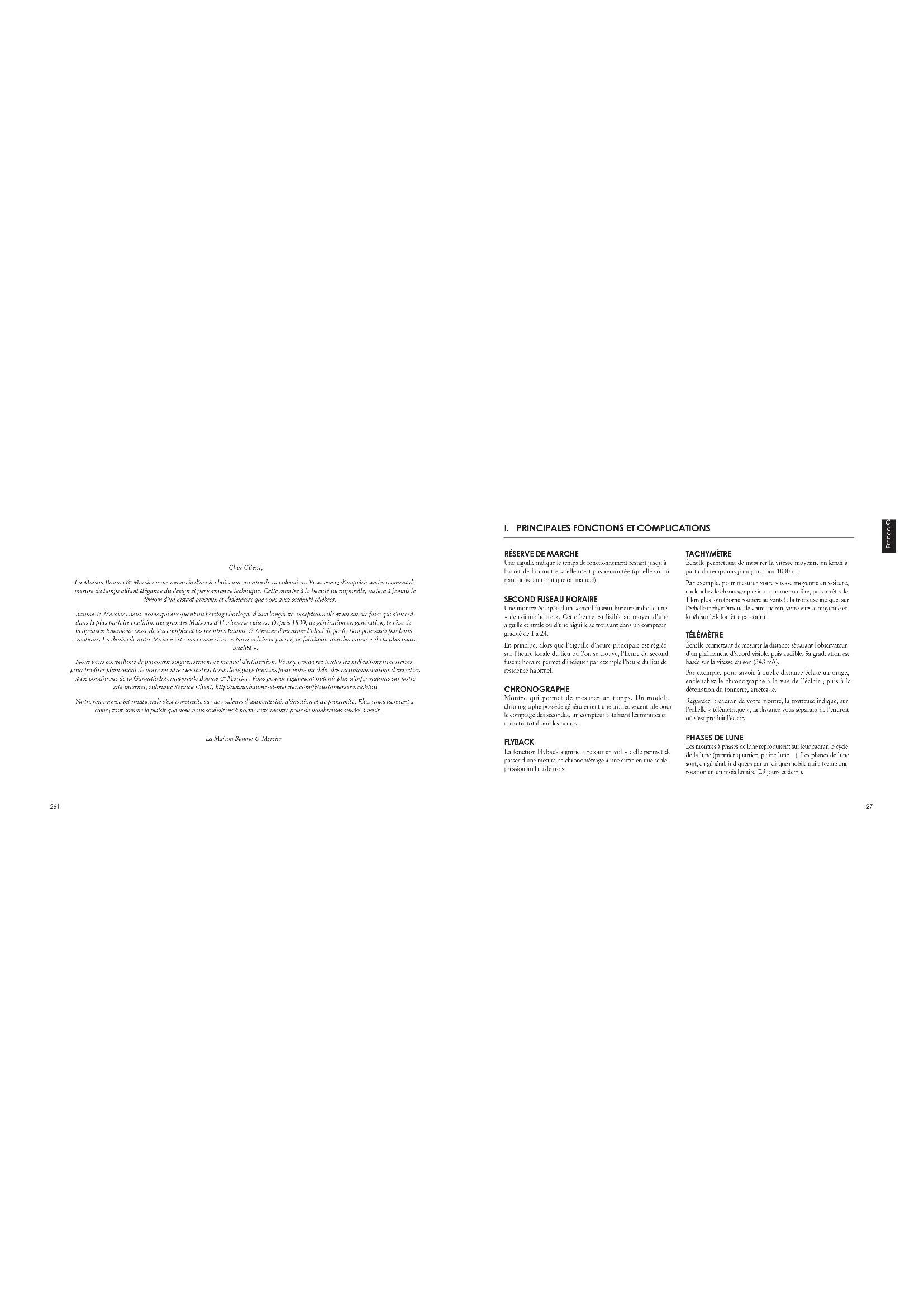 Русский Ελληνικά Français Cher Client, La Maison Baume & Mercier vous remercie d’avoir choisi une montre de sa collection. Vous venez d’acquérir un instrument de mesure du temps alliant élégance du design et performance technique. Cette montre à la beauté intemporelle, restera à jamais le témoin d’un instant précieux et chaleureux que vous avez souhaité célébrer. Baume & Mercier : deux noms qui évoquent un héritage horloger d’une longévité exceptionnelle et un savoir-faire qui s’inscrit dans la plus parfaite tradition des grandes Maisons d’Horlogerie suisses. Depuis 1830, de génération en génération, le rêve de la dynastie Baume ne cesse de s’accomplir et les montres Baume & Mercier d’incarner l’idéal de perfection poursuivi par leurs créateurs. La devise de notre Maison est sans concession : « Ne rien laisser passer, ne fabriquer que des montres de la plus haute qualité ». Nous vous conseillons de parcourir soigneusement ce manuel d’utilisation. Vous y trouverez toutes les indications nécessaires pour proter pleinement de votre montre : les instructions de réglage précises pour votre modèle, des recommandations d’entretien et les conditions de la Garantie Internationale Baume & Mercier. Vous pouvez également obtenir plus d’informations sur notre site internet, rubrique Service Client, http://www.baume-et-mercier.com/fr/customerservice.html Notre renommée internationale s’est construite sur des valeurs d’authenticité, d’émotion et de proximité. Elles nous tiennent à cœur ; tout comme le plaisir que nous vous souhaitons à porter cette montre pour de nombreuses années à venir. La Maison Baume & Mercier