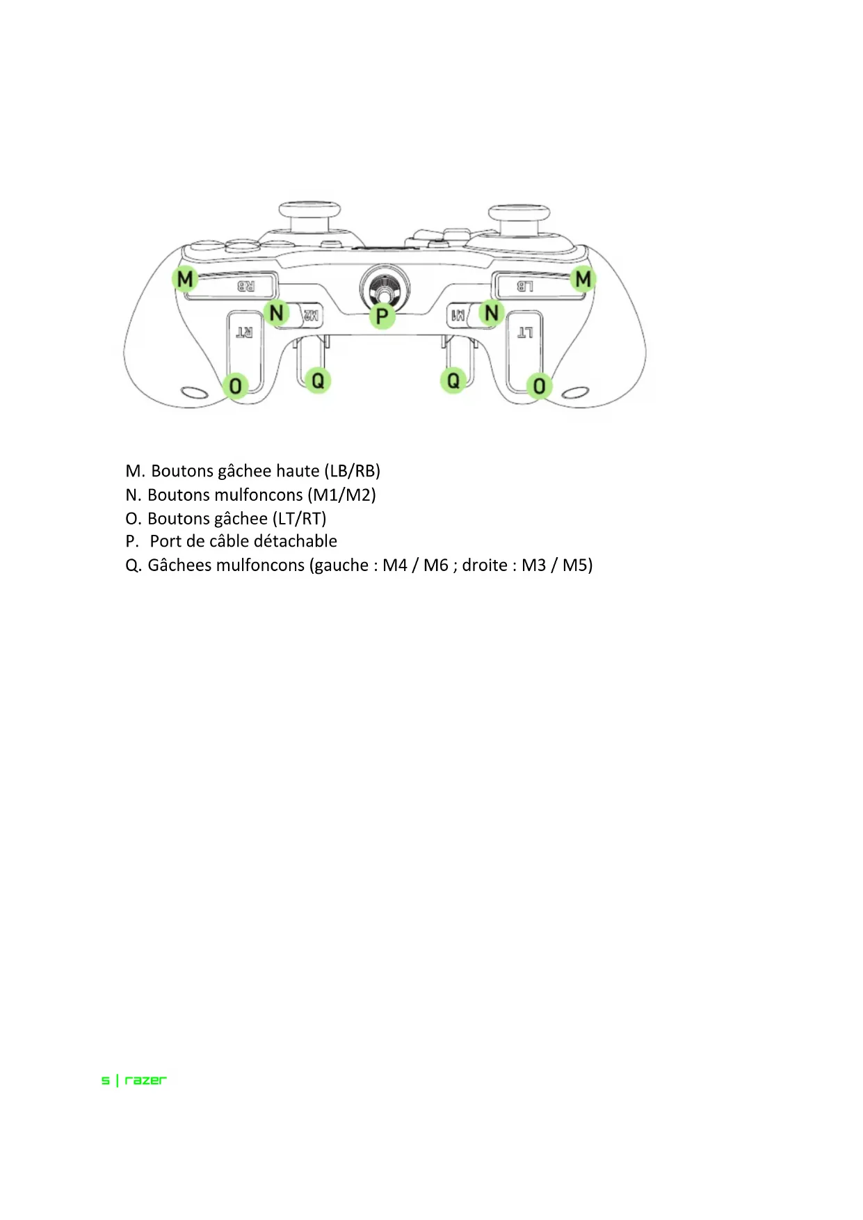 M. Boutons gâchette haute (LB/RB) N. Boutons multifonctions (M1/M2) O. Boutons gâchette (LT/RT) P. Port de câble détachable Q. Gâchettes multifonctions (gauche : M4 / M6 ; droite : M3 / M5)6 | For gamers by gamers™