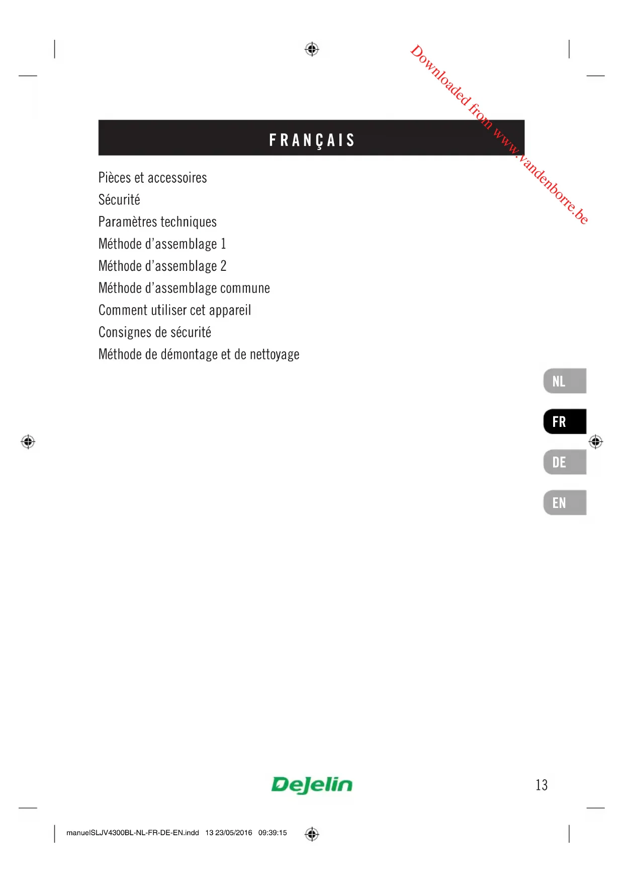 FRANÇAIS Pièces et accessoires Sécurité Paramètres techniques Méthode d’assemblage 1 Méthode d’assemblage 2 Méthode d’assemblage commune Comment utiliser cet appareil Consignes de sécurité Méthode de démontage et de nettoyage manuelSLJV4300BL-NL-FR-DE-EN.indd 13 23/05/2016 09:39:15 Downloaded from www.vandenborre.beNL