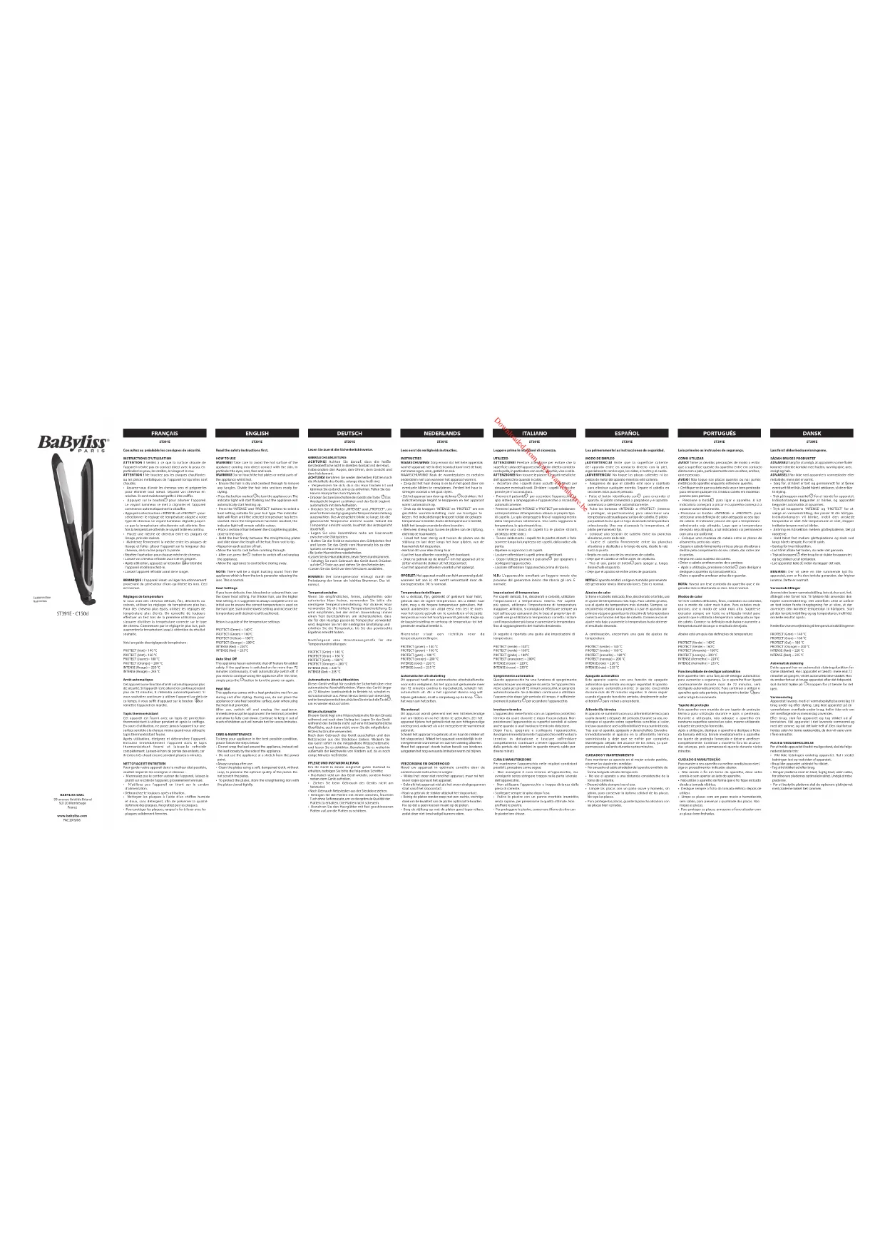 - Pour protéger les plaques, rangez le fer à lisser avec les plaques solidement fermées. FRANÇAIS ENGLISH DEUTSCH NEDERLANDS ITALIANO ESPAÑOL PORTUGUÊS DANSK ST391E Read the safety instructions rst.