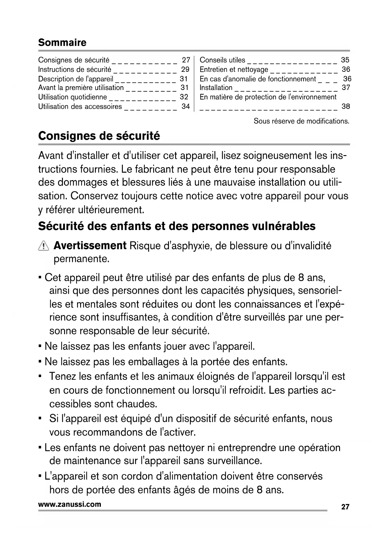 www.zanussi.comSommaire Consignes de sécurité _ _ _ _ _ _ _ _ _ _ _ 27 Instructions de sécurité _ _ _ _ _ _ _ _ _ _ _ 29 Description de l'appareil _ _ _ _ _ _ _ _ _ _ _ 31 Avant la première utilisation _ _ _ _ _ _ _ _ _ 31 Utilisation quotidienne _ _ _ _ _ _ _ _ _ _ _ _ 32 Utilisation des accessoires _ _ _ _ _ _ _ _ _ 34 Conseils utiles _ _ _ _ _ _ _ _ _ _ _ _ _ _ _ _ 35 Entretien et nettoyage _ _ _ _ _ _ _ _ _ _ _ _ 36 En cas d'anomalie de fonctionnement _ _ _ 36 Installation _ _ _ _ _ _ _ _ _ _ _ _ _ _ _ _ _ _ 37 En matière de protection de l'environnement _ _ _ _ _ _ _ _ _ _ _ _ _ _ _ _ _ _ _ _ _ _ _ _ 38 Sous réserve de modifications. Consignes de sécurité Avant d'installer et d'utiliser cet appareil, lisez soigneusement les ins- tructions fournies. Le fabricant ne peut être tenu pour responsable des dommages et blessures liés à une mauvaise installation ou utili- sation. Conservez toujours cette notice avec votre appareil pour vous y référer ultérieurement. Sécurité des enfants et des personnes vulnérables Avertissement Risque d'asphyxie, de blessure ou d'invalidité permanente.